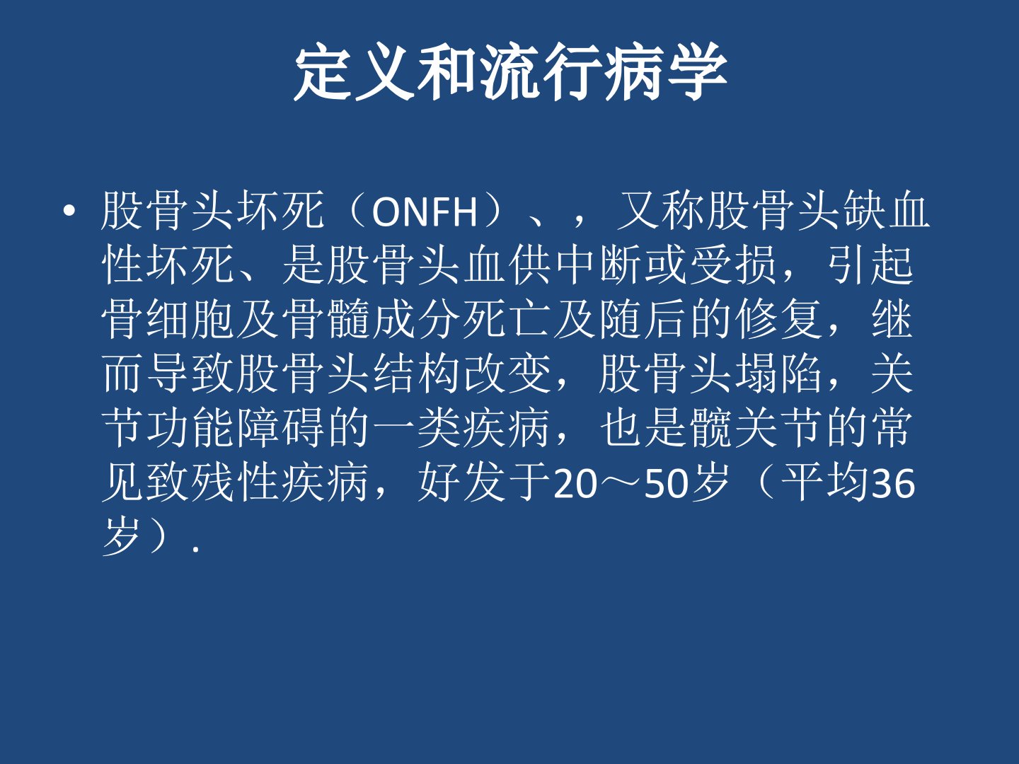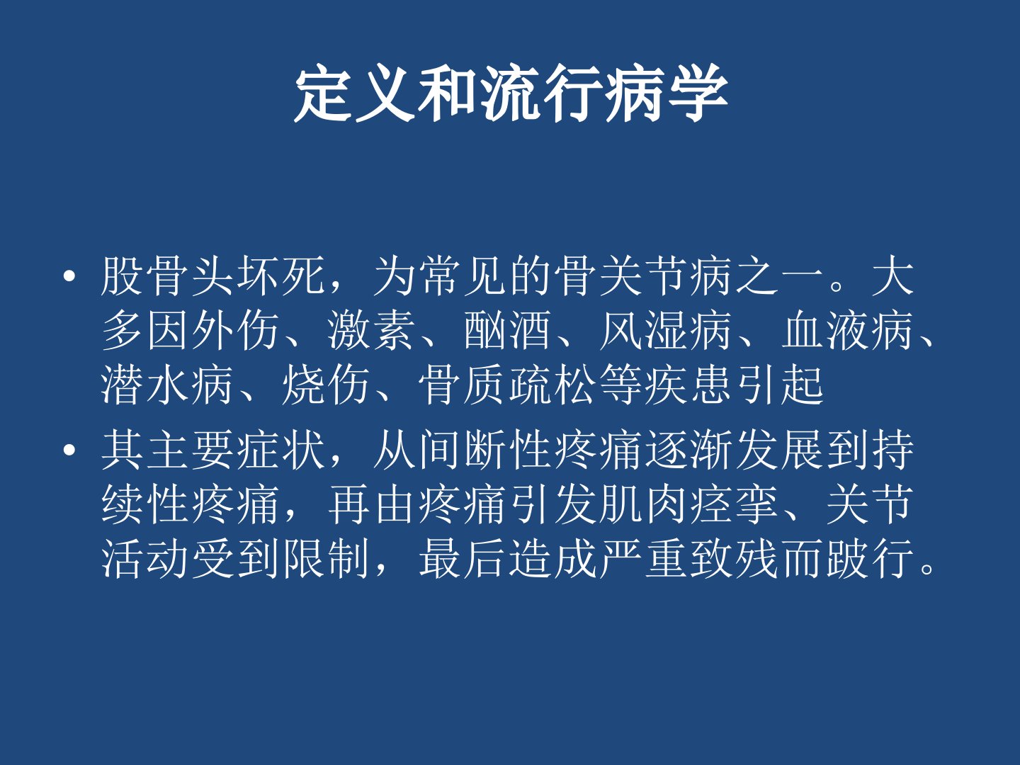 股骨头坏死塌陷防治摘要股骨头坏死(ONFH)是髋关节常见致残性疾病好发于2050岁人群多由外伤、激素、酗酒等因素引发症状从间断性疼痛逐渐发展为持续性疼痛、肌肉痉挛、关节活动受限最终致残跛行。其塌陷率高达80未经治疗者14年内多发生塌陷87的病例从塌陷到需全髋置换仅间隔两年因此围塌陷期(塌陷前期和塌陷早期)是保髋治疗黄金时期。治疗目标上保留自身髋关节(“保髋”)仍是公认目标。手术是保髋主要方法目标是改善血运、清除病灶、替代植骨、重建稳定。塌陷防治关键在于改善股骨头表面及内部血供、清除坏死病灶。治疗策略提倡早中期精细化诊断中西结合。围塌陷期保髋方法包括改善血供(血管融通术、腰交感神经调控、局部冲击波治疗)、微创髓芯减压取髂骨植骨、坏死病灶清除头颈部开窗取髂骨植骨等多种手术。其中腰交感神经调节可扩张下肢血管、缓解疼痛、促进坏死组织修复;局部冲击波治疗可刺激骨组织再生、增加血流量、抑制病情进展。
