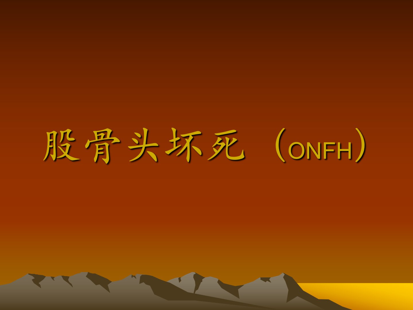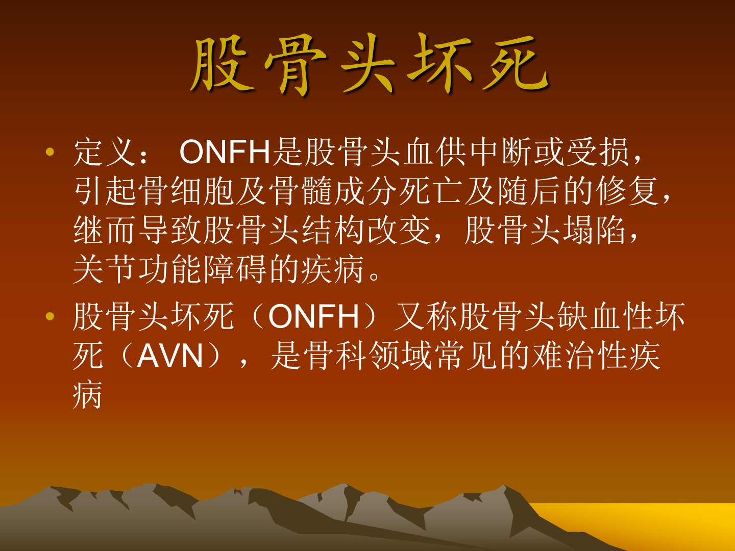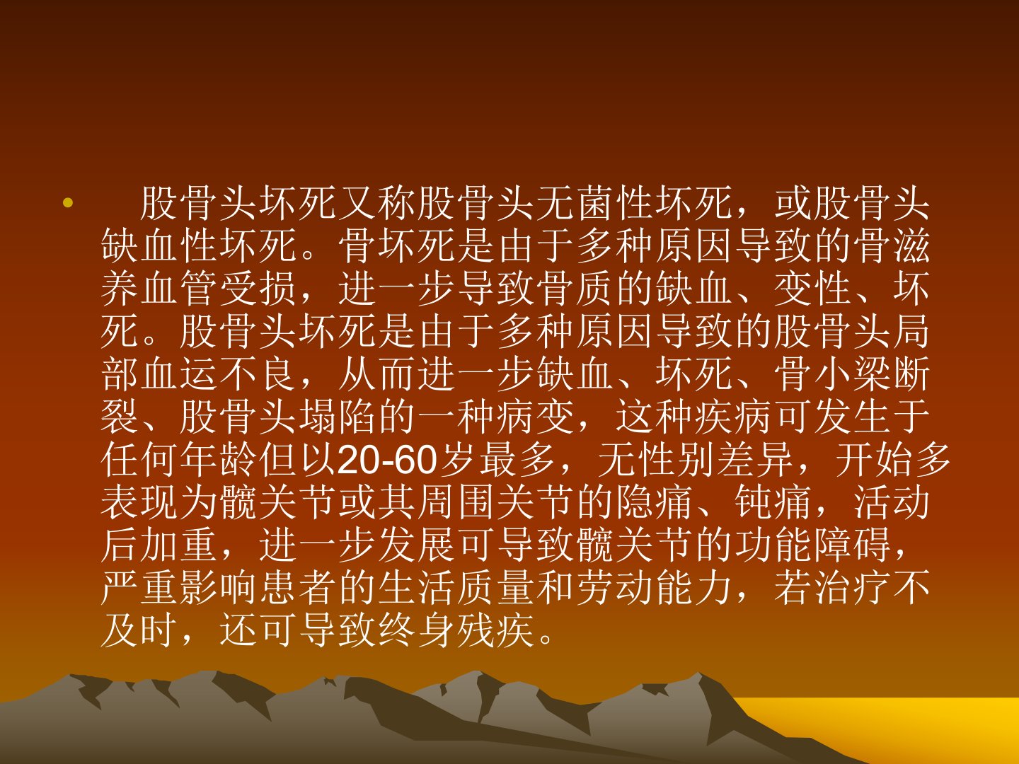 股骨头坏死(ONFH)摘要股骨头坏死又称无菌性或缺血性坏死因骨滋养血管受损导致骨质缺血、变性、坏死多因局部血运不良引发可发生于任何年龄2060岁高发。疾病初期多表现为髋关节或其周围关节隐痛、钝痛活动后加重进一步发展则会导致髋关节功能障碍严重影响患者生活质量治疗不及时可致终身残疾。病因方面文章讨论了酒精性和激素性股骨头坏死。酒精性股骨头坏死基本病理变化是骨小梁表面成排的成骨细胞消失等早期病变表现为静脉窦充血等晚期病变指ANFH3期及其以上者从其额状面切开可分为5层。激素性股骨头坏死早期病理生理改变表现在骨细胞、成骨细胞、破骨细胞等全身病理生理改变涉及骨内外多种因素。诊断方面需仔细询问病史明确疼痛部位、性质等早期内旋髋关节引疼痛最常见股骨头塌陷后髋关节活动范围受限。早期辅助诊断方法有DSA、MRI、组织学检查等。治疗方面包括髓芯减压术、截骨术、血管植入术、带肌蒂或血管蒂骨瓣移植术、带血管蒂的骨膜移植术、记忆合金网球植入等多种手术方法不同分期治疗方法不同。该病是进展性疾病应早治疗否则可能致残。