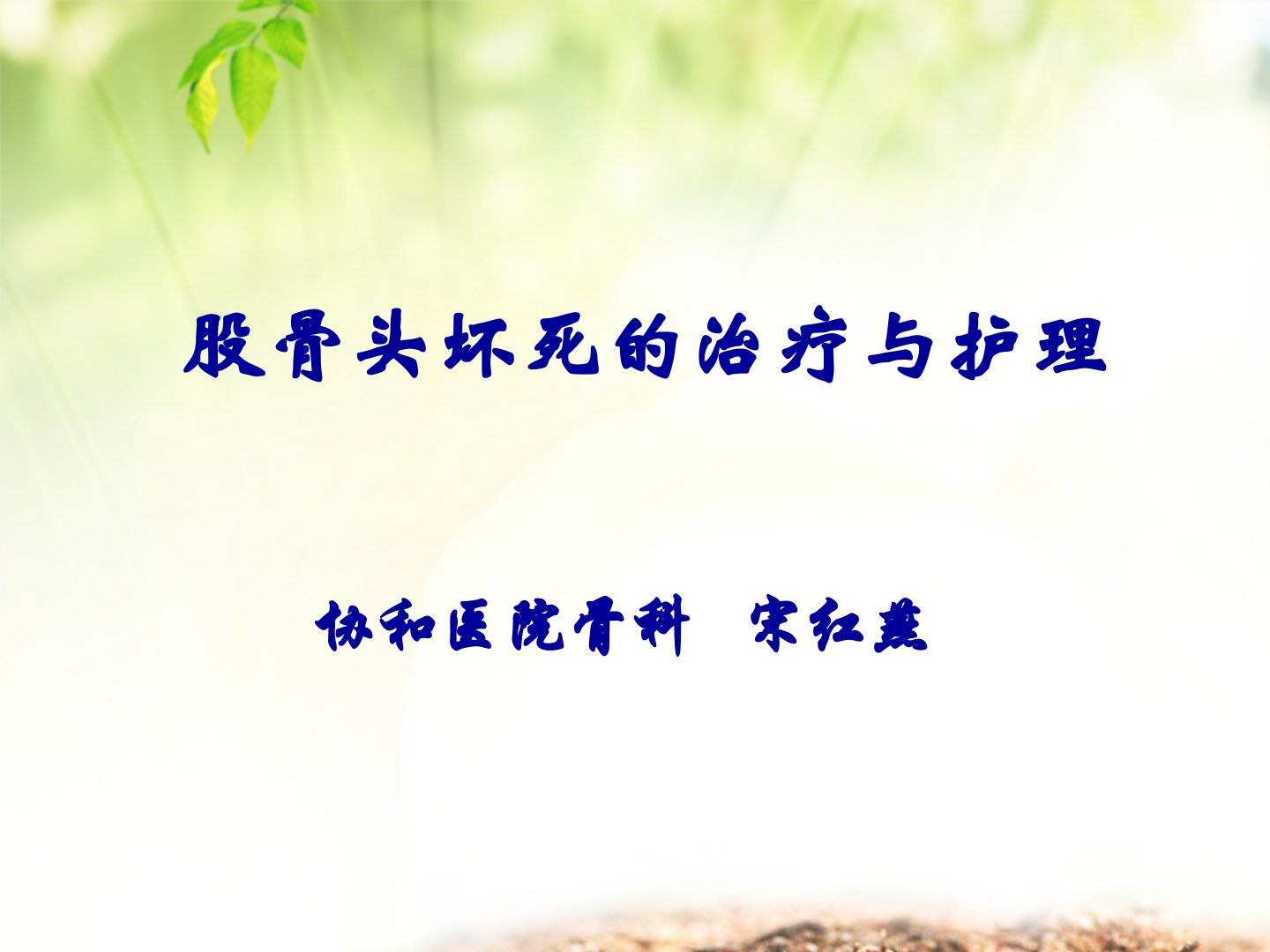 《WELCOME股骨头坏死的治疗与护理》摘要本文由协和医院骨科宋红燕分享旨在让学习者掌握股骨头坏死术后护理要点熟悉股骨头置换术的适应证、禁忌证与并发症了解术后康复训练。骨坏死是骨细胞等有活力成分因多种因素坏死的病理过程以股骨头最常见。病因包括创伤、疾病、药物及不良生活习惯等。其病理变化是血液循环障碍致骨坏死与修复交织最终可致股骨头塌陷及髋关节退行性关节炎。诊断有主要标准和次要标准两个或以上主要标准阳性可确诊一个主要标准阳性或三个次要标准阳性(至少一个X线片阳性改变)可诊断为可能坏死。临床表现多样好发于2050岁男性有疼痛、关节僵硬等症状。治疗上不同时期选择不同方式如细针髓心减压、自体骨髓干细胞移植等严重者行人工关节置换术。置换术有适应证与禁忌证。术前护理要关注患者心理等问题并采取相应措施术后需观察病情、做好体位护理等预防并发症。术后康复分阶段进行从肌肉静力收缩到逐步增加关节活动度。出院后要注意训练强度、行走辅助工具使用遵循“6不要”完全康复后可进行适当体育活动。