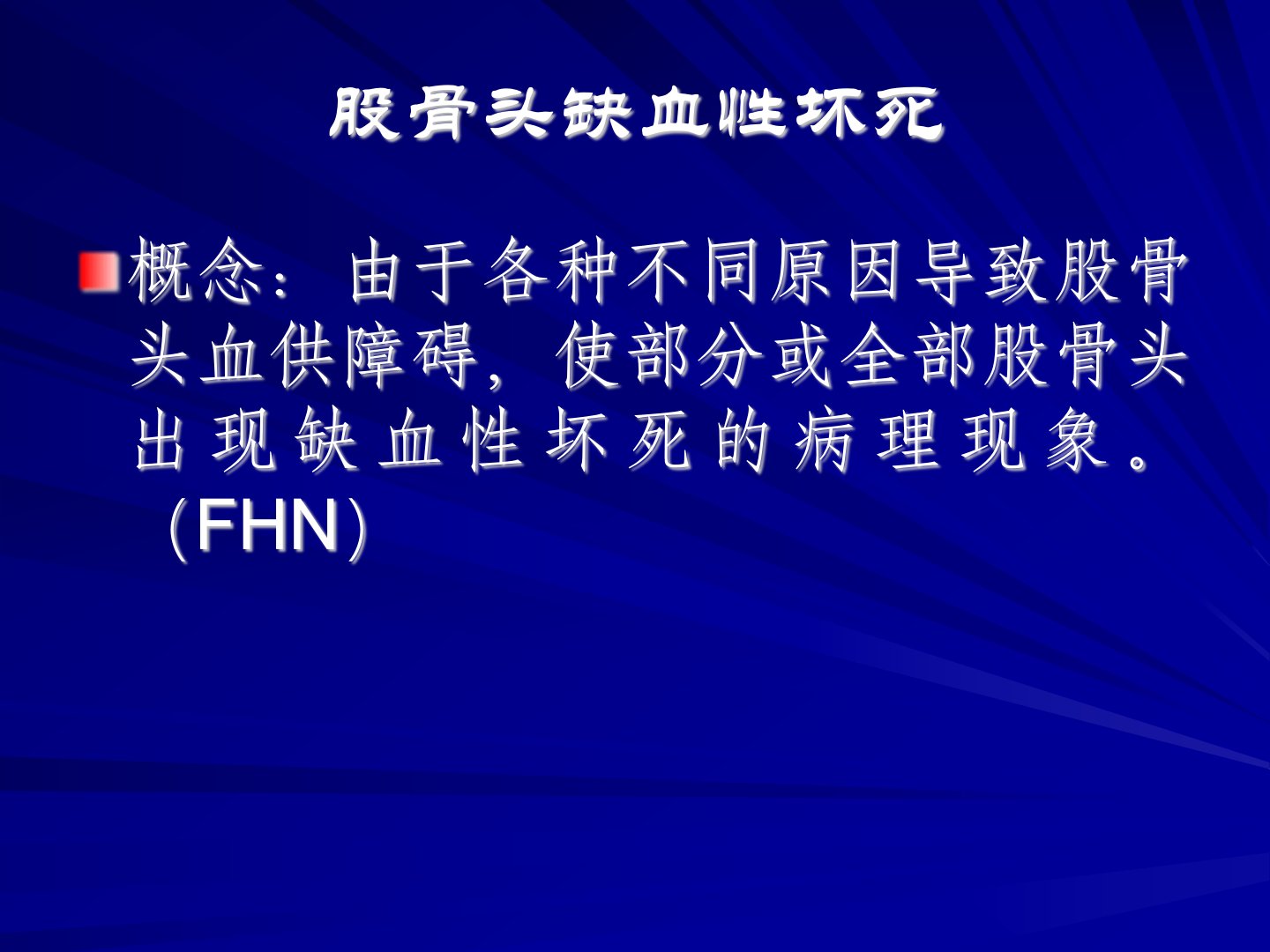 股骨头缺血性坏死摘要股骨头缺血性坏死(FHN)指因各种原因致股骨头血供障碍出现缺血性坏死的病理现象临床地位重要治疗不易受到骨伤科重视。病因分创伤性(以股骨颈骨折最常见)和非创伤性(激素性和酒精中毒性较多见)。创伤性中股骨颈骨折后影响股骨头缺血性坏死的因素有年龄、骨折线高度、骨折原始移位程度、骨折后的复位与内固定等。非创伤性中激素性有脂肪栓塞、凝血机制改变、骨质疏松三种学说与多种因素有关;酒精性因酒精代谢产生乙醛等导致缺血坏死。病理变化包括早期缺血性坏死和后期修复两者交织。诊断依据病史、症状、体征和影像学检查影像学检查是诊断、分期主要手段。需与髋关节结核、强直性脊柱炎、髋关节骨性关节炎鉴别。治疗原则为解决血液循环障碍、防止塌陷、纠正塌陷和增生变形。治疗方法多样非手术治疗包括一般治疗和中药治疗;手术治疗有髓芯减压术、截骨术、骨瓣移植术等多种术式。该病为常见多发病治疗关键在于早期诊断恢复血供去除危险因素依患者具体情况选择疗法。
