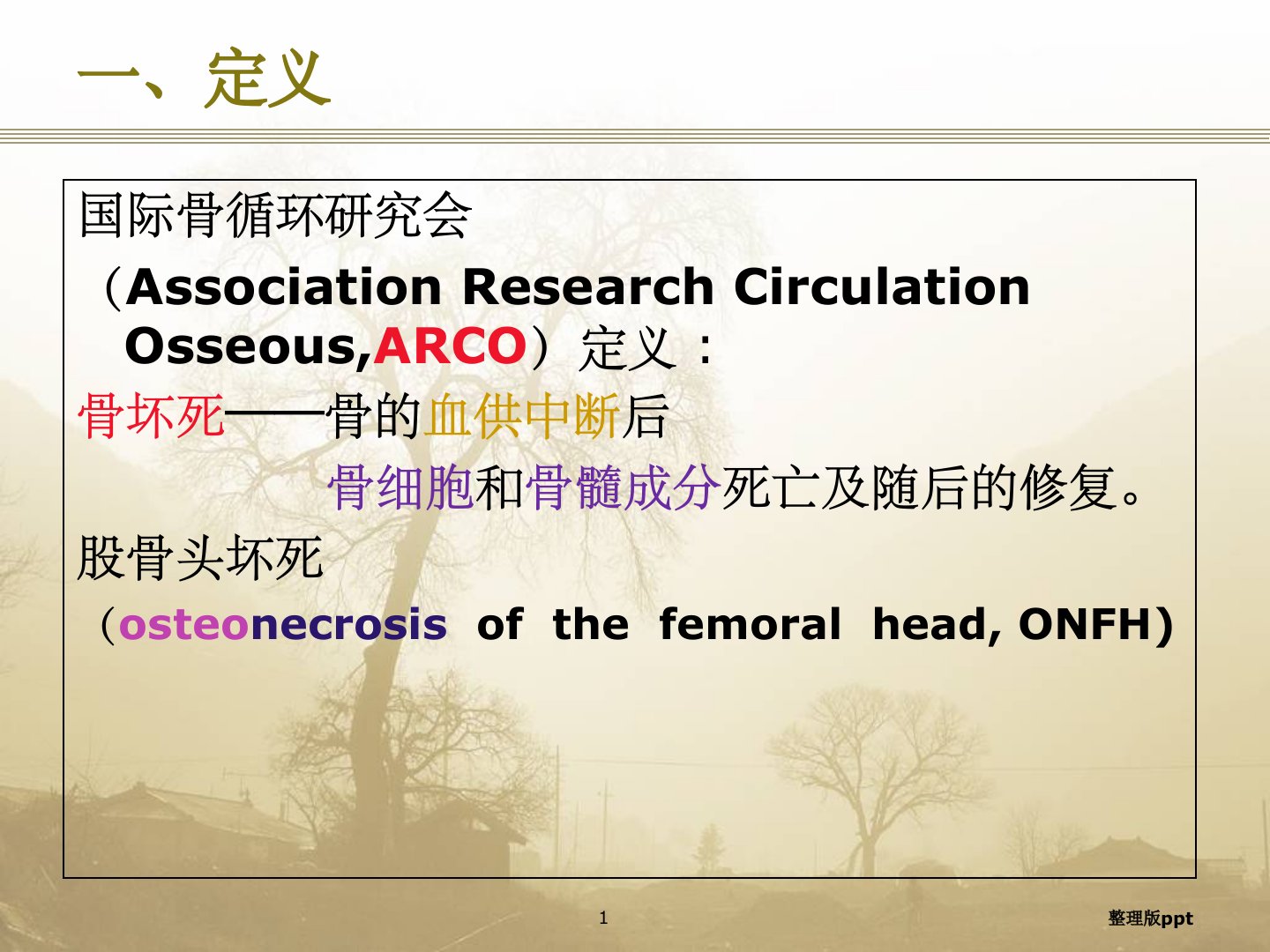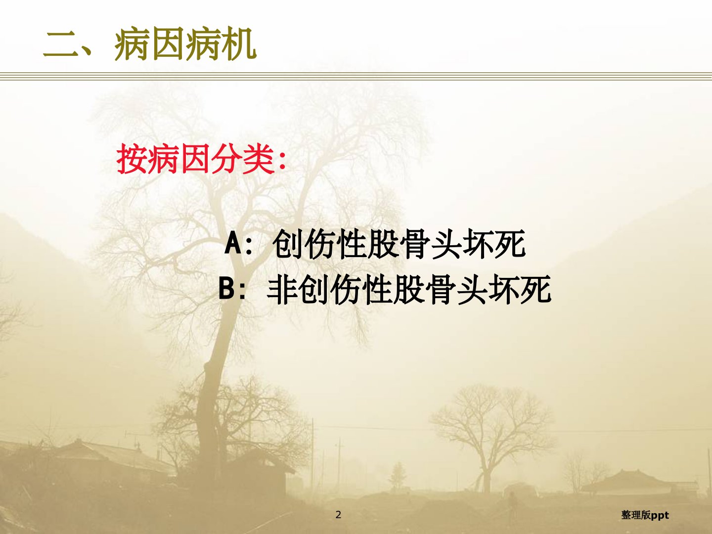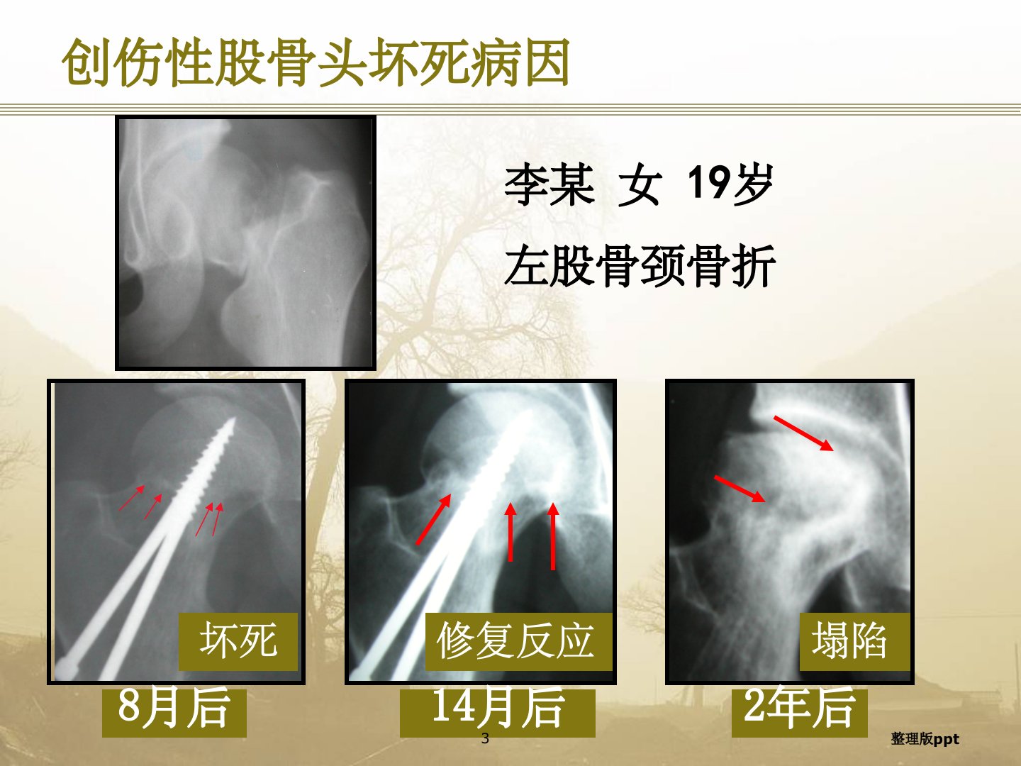 国际骨循环研究会(ARCO)定义骨坏死为骨血供中断后骨细胞和骨髓成分死亡及后续修复过程本文重点介绍了股骨头坏死(ONFH)的病因病机、病理变化及诊断。ONFH按病因分为创伤性和非创伤性两类后者好发于2050岁人群双侧发病占80美国每年新发约2万例我国约1315万例。非创伤性ONFH病因包括糖皮质激素使用(与原发病、给药途径、时间、剂量相关)和酒精中毒(与摄入量及持续时间有关)。发病机制涉及脂肪栓塞、血管内凝血和骨质疏松等学说。病理变化包括坏死期、修复期晚期可见关节软骨坏死、肉芽带形成等。诊断依据病史(创伤、激素使用、酗酒等)、症状(疼痛、跛行)和体征(压痛点、肌肉萎缩、髋关节活动受限等)。疼痛与股骨头塌陷密切相关不塌不痛一塌必痛。