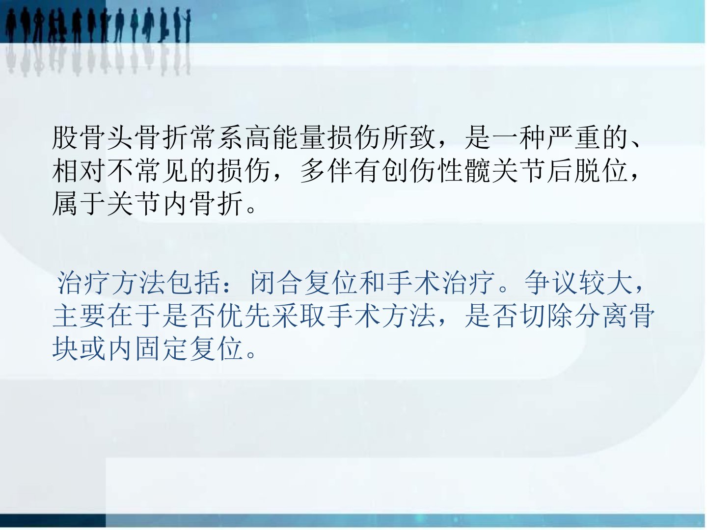 《股骨头骨折的诊断与治疗综述》摘要本文由吴忠市人民医院骨II科梁攀撰写综述了股骨头骨折的诊断与治疗方法。股骨头血运主要来自旋股内侧动脉及部分旋股外侧动脉损伤易致血运中断引发骨折不愈合和股骨头坏死。股骨头骨折常与髋关节后脱位并存损伤机制与人体坐位屈髋时突发暴力有关分型方法多样常用有Pipkin、AO等分型。诊断方面需详细询问病史、进行体格检查借助骨盆正位片、CT及三维重建。误漏诊可能因未摄斜侧位X线片、骨折块阴影重叠等原因导致可疑病人建议常规CT扫描。治疗上早期髋关节复位是关键多数认同伤后6小时内闭合复位。保守治疗用于不合并髋关节脱位且骨折对位良好者;手术治疗根据分型选择如PipkinI型可切除小骨折片或解剖复位固定III型常考虑手术治疗IV型需同时固定髋臼骨折。手术入路中后侧入路易致股骨头缺血坏死前侧入路影响较小。植入材料有松质骨螺钉等多种手术时机依全身情况和骨折类型定。术后需持续牵引、逐步负重并随访观察。