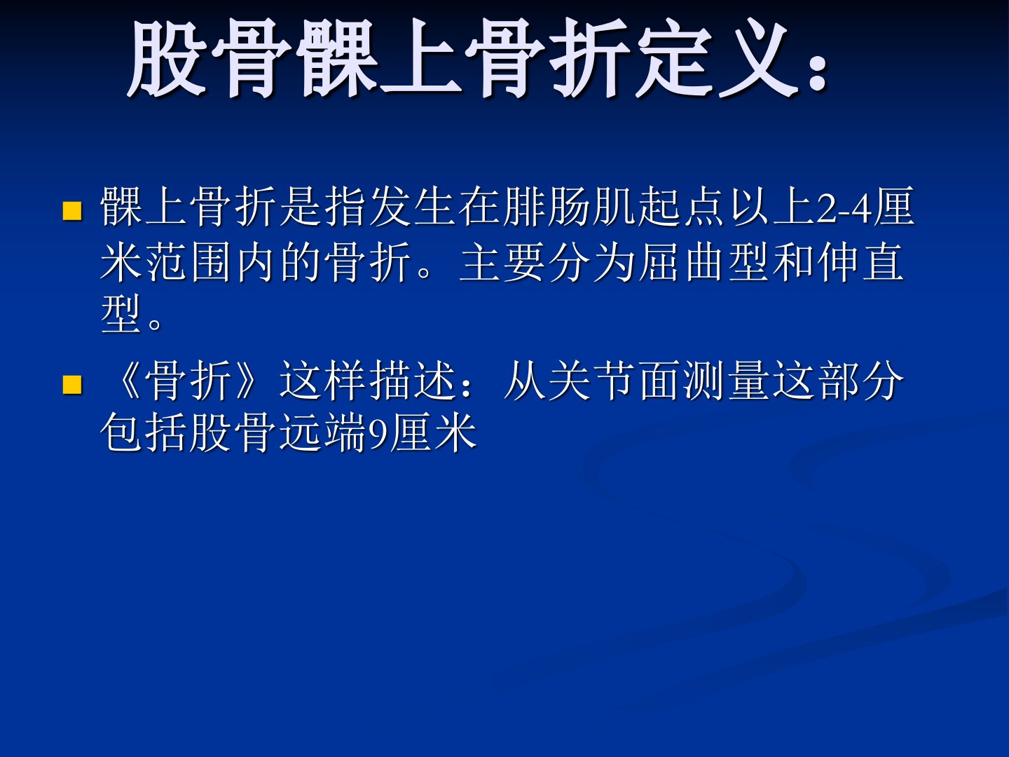 股骨髁上骨折诊治要点:股骨髁上骨折有特定诊断和分型如AO分型。治疗上倒置钉(GSH)固定应用较多但临床上多用钢板固定95度角钢板适用于多数股骨髁上和双髁骨折但非常低位通髁骨折及老年患者、髁或髁间严重粉碎骨折则不适用。髁支持钢板固定时需预弯以适应患者且因非角度固定可能致晚期相对内翻LCP因螺钉和钢板有锁定装置克服了这一不足。髁部骨折DCS固定有其优点和手术要点。LISS因稳定性好优于角度髁钢板。术后处理方面闭合骨折术前术后需用抗菌素术后第一日开始股四头肌等长收缩运动5天内膝关节制动但及时进行功能锻炼5天后开始膝关节不负重的自主屈伸活动可用CPM进行康复锻炼。此外还需注意骨折不愈合及固定失效问题并采取降低感染的措施。