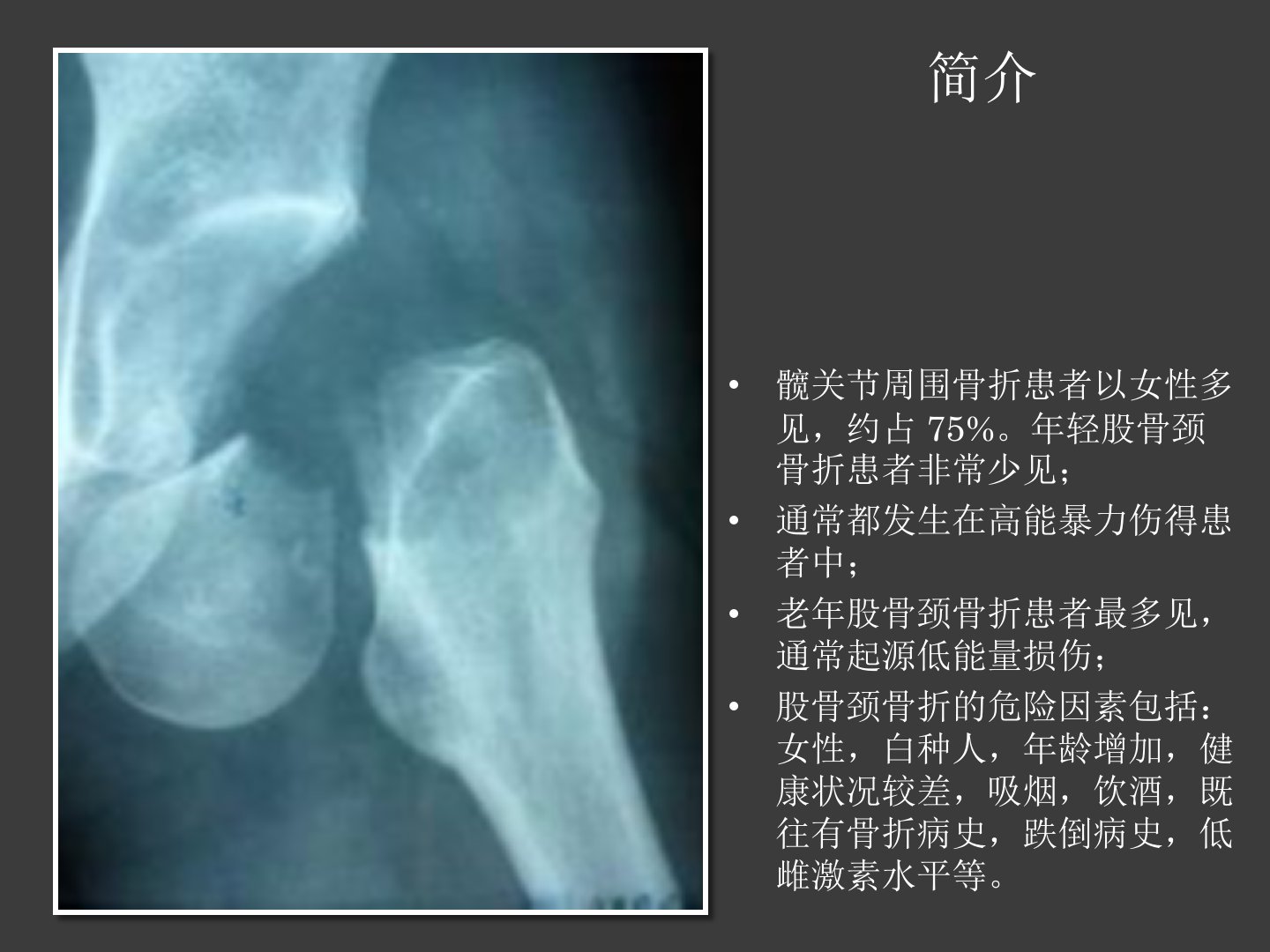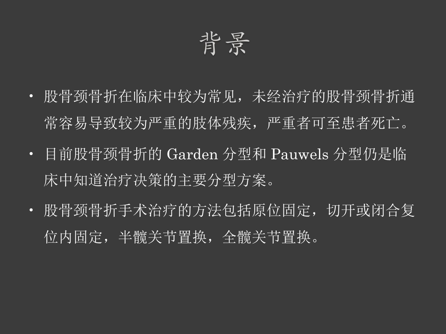 股骨颈骨折诊断与治疗摘要股骨颈骨折临床常见未经治疗易致残疾甚至死亡。目前Garden分型和Pauwels分型仍是指导治疗决策的主要方案。其手术治疗方法多样包括原位固定、切开或闭合复位内固定、半髋及全髋关节置换等。股骨颈骨折患者女性居多老年患者多源于低能量损伤青年患者则多因高能量创伤所致。查体时移位患者常主诉腹股沟区域疼痛查体可见下肢外旋和缩短畸形。影像学检查方面X片需包含股骨正侧位和骨盆前后位片重建CT可更好判断无移位或压缩骨折MRI仅适用于不确定是否存在骨折的患者。治疗上大部分股骨颈骨折以获得早期运动功能为目标。保守治疗仅适用于手术风险高的患者手术治疗是金标准。非移位嵌插性骨折通常采取原位固定移位性骨折则包括闭合或切开复位内固定、半髋及全髋置换等方案选择取决于患者情况和骨折因素。