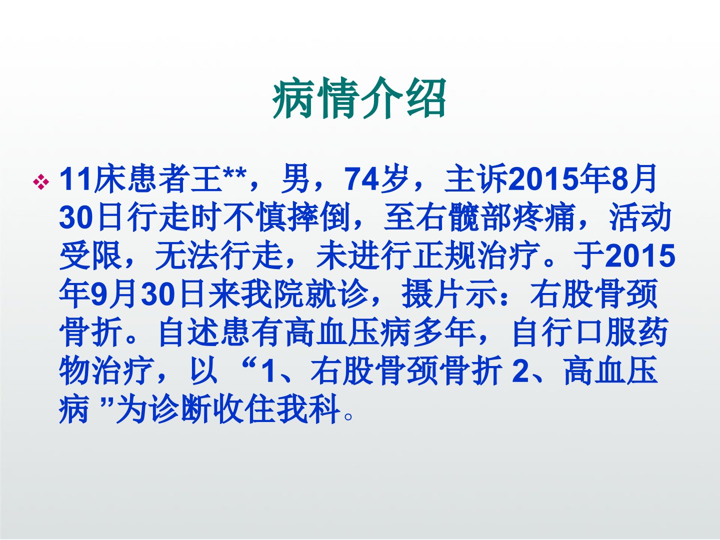 股骨颈骨折诊疗护理概览本次汇报介绍了两例股骨颈骨折病例。第一例是74岁男性患者因行走摔倒导致右髋部疼痛活动受限有多年高血压病史X线片示右股骨颈骨折择期行右人工股骨头置换术术后病情平稳。第二例是41岁男性患者因工作期间摔伤致左股骨颈骨折行闭合复位内固定术术后病情稳定来院进行康复治疗。股骨颈骨折多见于老年人尤其是女性常由轻微暴力引发儿童及中青年则需承受较大暴力。骨折可能导致骨不愈合、股骨头缺血性坏死。治疗原则取决于骨折部位、移位程度和病人年龄包括无移位骨折的持续皮牵引、空心螺钉内固定以及有移位骨折的复位、内固定或关节置换。护理方面需保持适当体位指导病人正确活动预防并发症。出院后患者需避免过度负重、盘腿、坐矮凳等注意健康饮食和功能锻炼。