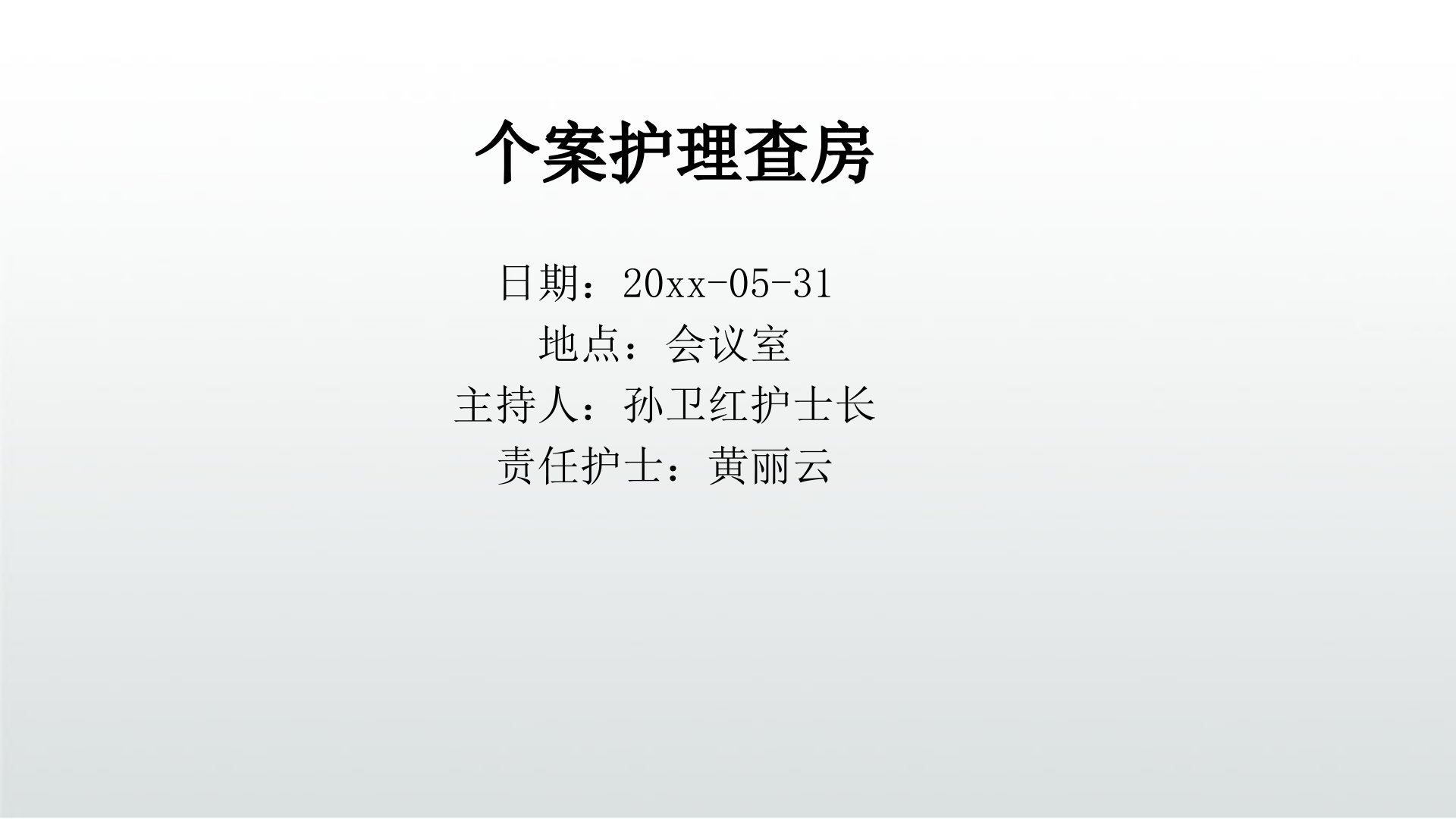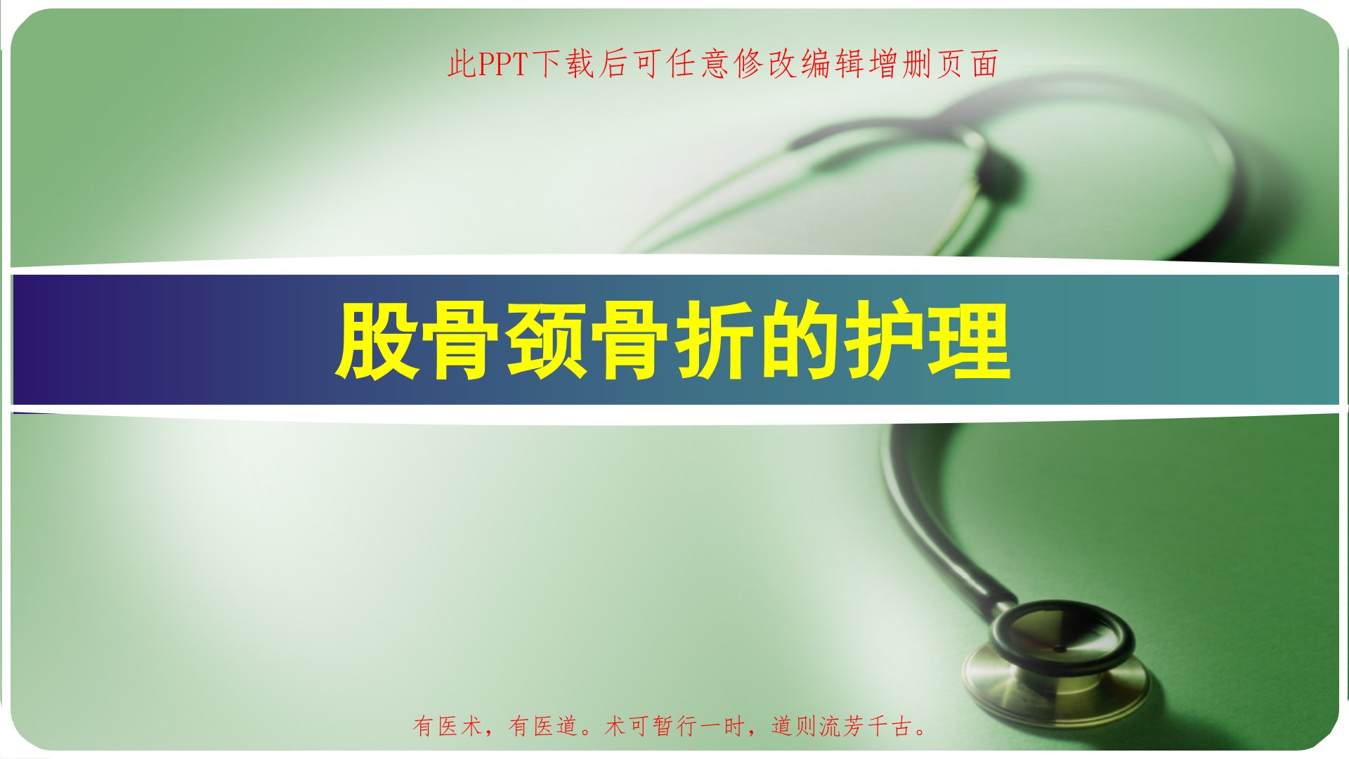 股骨颈骨折的护理此PPT下载后可任意修改编辑增删页面有医术,有医道。术可暂行一时,道则流芳千古。友情提示手机调成静音感谢您不吸烟欢迎随时提问个案护理查房日期:20xx-05-31地点:会议室主持人:孙卫红护士长责任护士:黄丽云查房主题和查房目的股骨颈骨折是我们病区收治的病种之一。今天,我们利用中午时间,组织一次个案查房,查房主题是:股骨颈骨折的护理;希望通过此次学习,使我们能够熟练掌握整体护理相关知识,护理评估的方法,护理计划的书写,熟悉股骨颈骨折相关知识,更好为病人提供优质服务。下面先了解一下股骨颈骨折,及汇报下病人情况及制定的护理计划:一、病史介绍患者一般情况姓名:杨玉珍性别:女年龄:76...