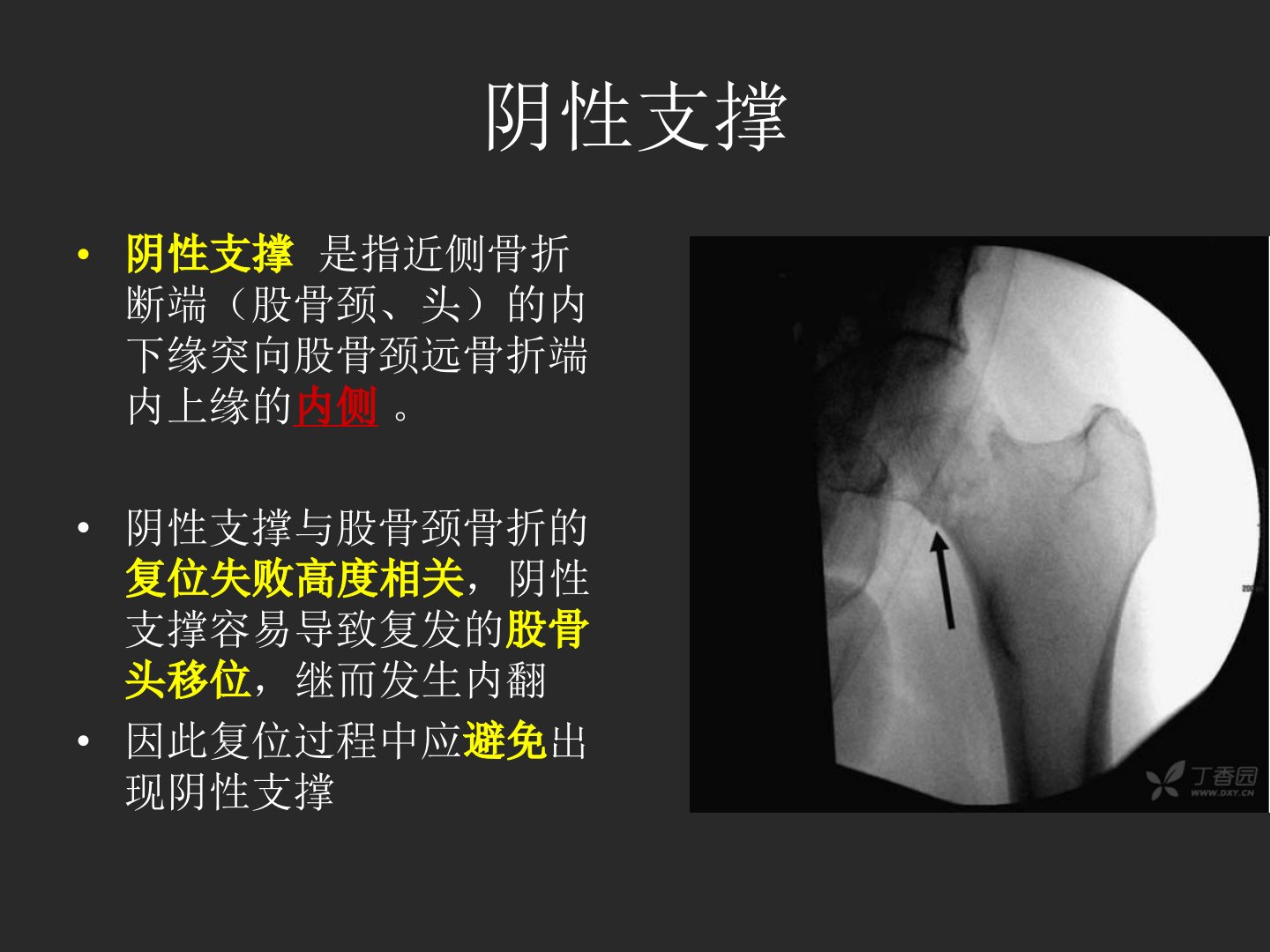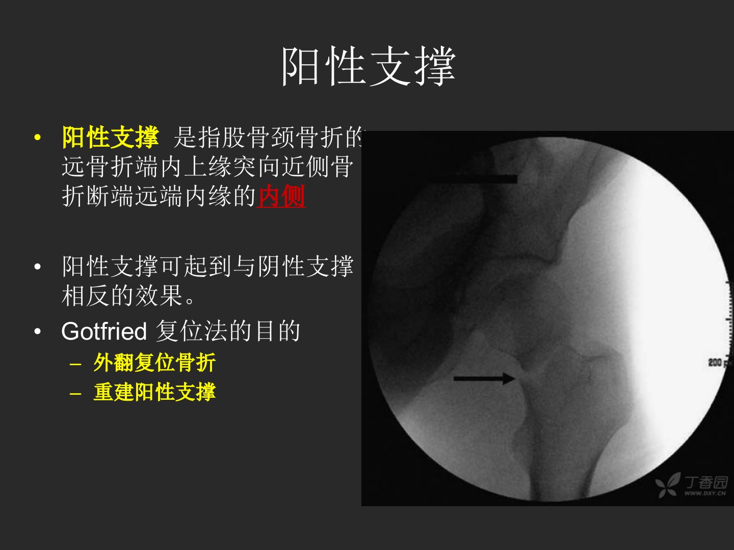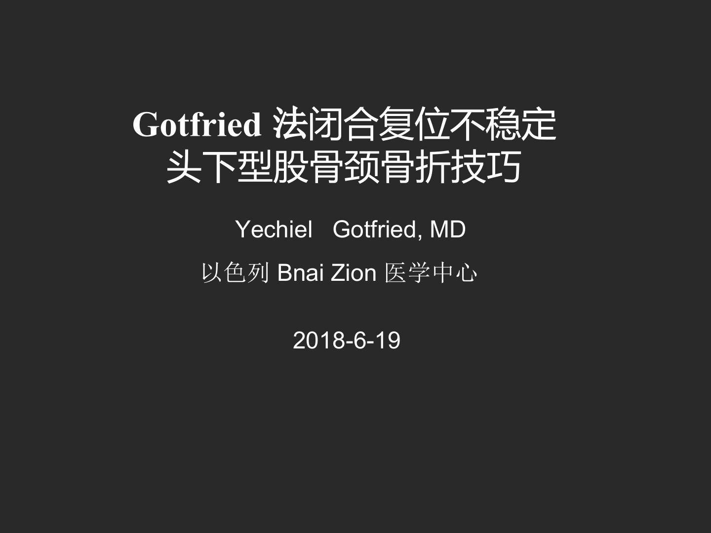 以色列BnaiZion医学中心YechielGotfried医生介绍了Gotfried法闭合复位不稳定头下型股骨颈骨折技巧。阴性支撑指近侧骨折断端内下缘突向远骨折端内上缘内侧与复位失败高度相关易致复发移位和内翻复位时应避免;阳性支撑指远骨折端内上缘突向近侧骨折断端远端内缘内侧效果相反。Gotfried复位法目的在于外翻复位骨折、重建阳性支撑。具体步骤:第一步解除崁插通过外侧和纵向牵引实现;第二步复位双向牵引时内收、内旋下肢侧位透视应达180度骨折对线否则考虑切开复位;第三步重建内收、内旋下肢同时放松牵引实施内固定时下肢应无牵引状态。复位理想标准为正位阳性支撑、骨折外翻侧位180度骨折对线。复位过程中应避免内翻和阴性支撑以获得稳定复位。
