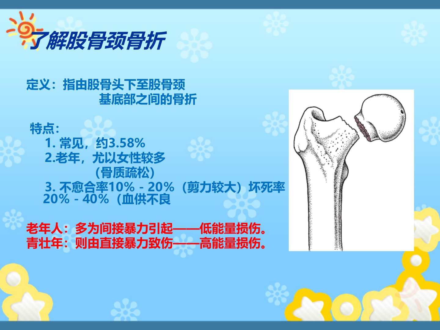 作为医生对股骨颈骨折康复的摘要如下:股骨颈骨折常见于老年人尤其是女性多因骨质疏松所致不愈合率和坏死率较高。骨折多由间接或直接暴力引起分型依据骨折部位和移位程度。临床表现包括畸形、疼痛和患肢短缩。治疗分保守和手术两种保守治疗适用于无明显移位的外展“嵌插”型骨折或不能耐受手术者但并发症多;手术治疗包括内固定和人工髋关节置换术后者适用于老年人头下型骨折等可克服骨折不愈合等问题提高患者生活质量。护理要点包括术前评估、术后护理、功能锻炼和出院指导。术前需评估全身状况加强营养;术后要观察生命体征、切口等保持患肢正确体位预防并发症;功能锻炼分阶段进行以肌力、关节活动度和步态训练为主;出院时要指导休息、饮食和复查。