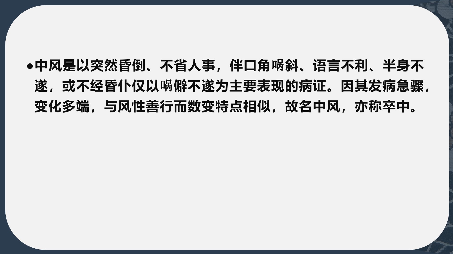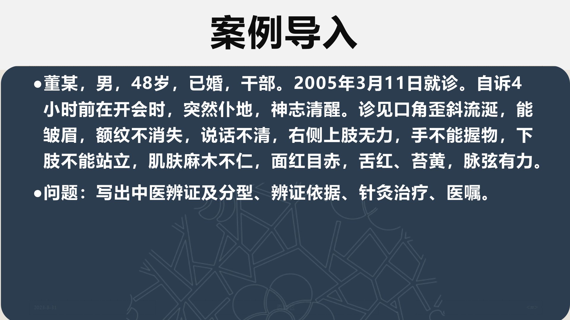 董某48岁男性干部于2005年3月11日就诊自诉在开会时突然仆地但神志清醒出现口角歪斜、流涎、说话不清、右侧上下肢无力、肌肤麻木、面红目赤等症状中医诊断为中风中经络证型为肝阳暴亢依据包括面红目赤、舌红苔黄、脉弦有力等。治疗采用针灸中经络治法为疏经通络、行气活血取手足三阳经穴为主主穴包括肩髃、曲池等上肢穴及环跳、阳陵泉等下肢穴配穴依证型添加如肝阳暴亢加太冲、太溪;毫针用泻法或平补平泻。中脏腑病情危重多有神志不清治法为醒脑开窍、启闭固脱取手厥阴及督脉穴为主。其他治疗包括电针、头针、耳针法。针灸治疗中风后遗症疗效显著且治疗越早效果越好中风急性期应综合治疗脑出血者30日后治疗为宜本病重在预防。