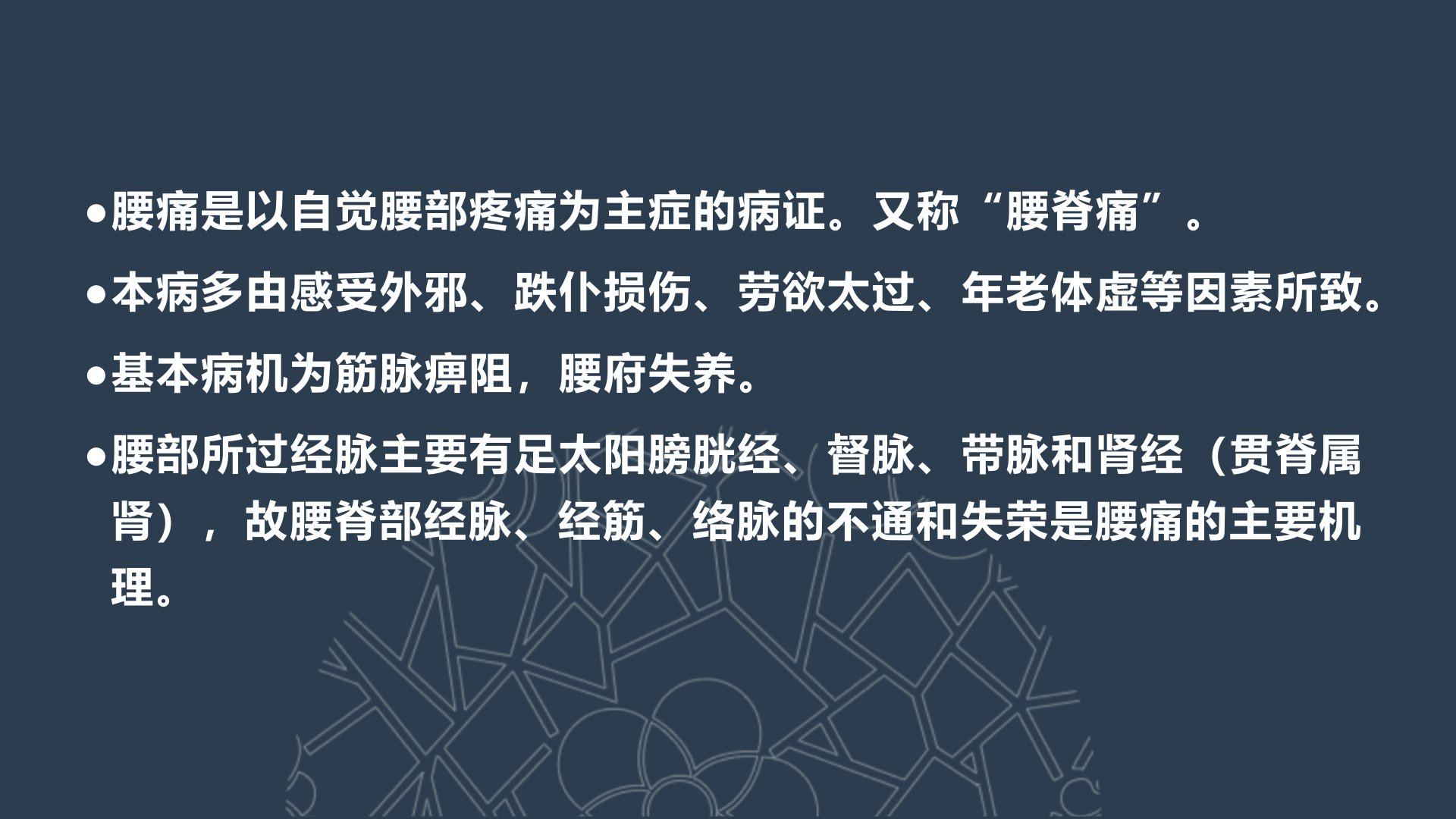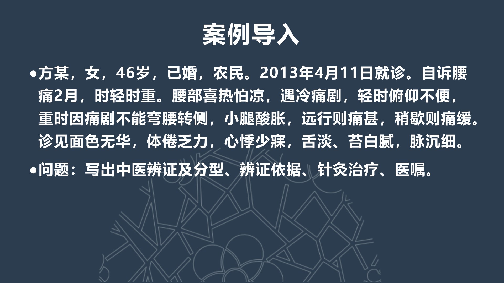 46岁农民方某于2013年4月11日就诊自诉腰痛两月时轻时重腰部喜热怕凉遇冷痛剧轻时俯仰不便重时不能弯腰转侧小腿酸胀远行则痛甚稍歇则痛缓。诊见面色无华体倦乏力心悸少寐舌淡、苔白腻脉沉细。中医认为腰痛多由外邪、损伤、劳欲、体虚等因素致筋脉痹阻、腰府失养所致。方某属寒湿腰痛兼见腰部喜暖怕冷、小腿酸胀等症状。治疗以活血行气通络止痛为主取局部阿是穴及足太阳经穴如腰眼、阿是穴、大肠俞、委中寒湿腰痛者加腰阳关、三阴交操作上急性者用泻法慢性者平补平泻法寒湿者加艾灸。此外还可采用皮肤针法、耳针法、穴位注射等疗法。按语:针灸治疗腰痛疗效显著但需明确诊断积极治疗同时患者要注意劳逸结合做好腰部防护避免寒冷刺激。