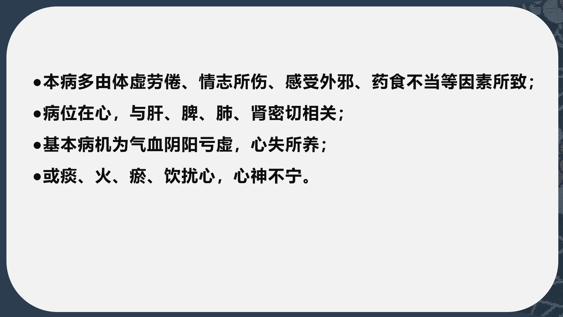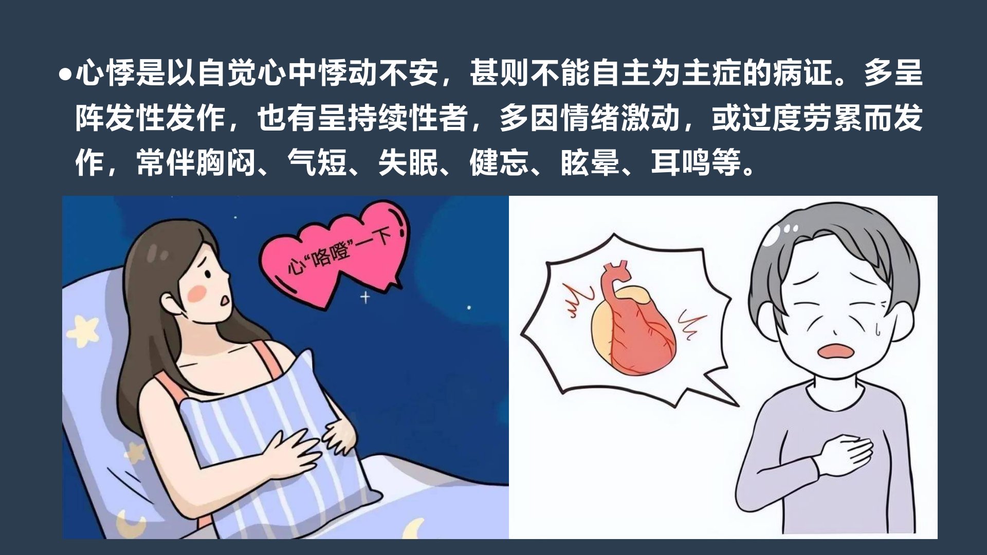 心悸以心中悸动不安为主症多因情绪或劳累诱发伴胸闷、气短等症状。病位在心与肝、脾、肺、肾相关由体虚、情志、外邪、药食不当等引发基本病机为气血阴阳亏虚、心失所养或痰、火、瘀、饮扰心。西医学中心脏神经官能症、心脏病心律失常及贫血、甲亢等引发的心律失常均可参考本病辨治。辨证分实证、虚证实证发病急病程短;虚证发病缓病程长。治疗以通调心气、安神止悸为法取手少阴、手厥阴经及任脉穴为主主穴为郄门、神门、心俞等配穴依证型加减。操作上实者泻法虚者补法或平补平泻水饮凌心者可艾灸。其他疗法包括耳针、穴位注射、拔罐等。按语强调针灸治疗心悸效果较好但需明确诊断治疗原发病同时注意饮食起居、心情调节及锻炼。
