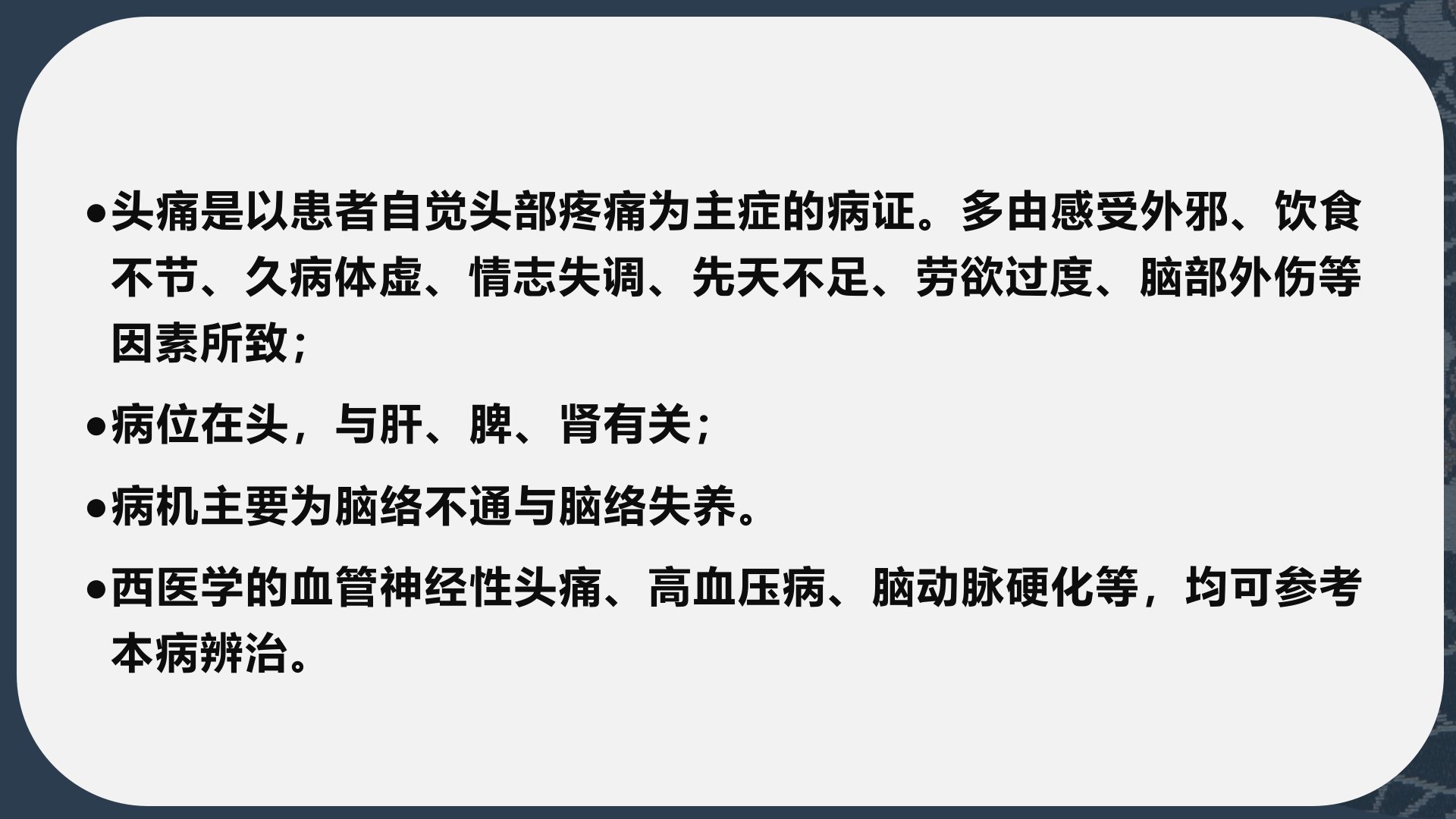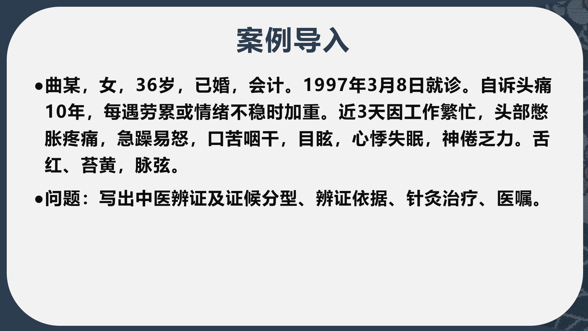 曲某女36岁会计头痛10年劳累或情绪不稳时加重。近3天因工作繁忙出现头部憋胀疼痛、急躁易怒、口苦咽干等症状舌红苔黄脉弦。头痛多由外邪、饮食、体虚、情志等因素所致病位在头与肝、脾、肾相关。【辨证】属内伤头痛肝阳上亢证型。兼见头痛而胀或抽掣而痛面烘热目赤耳鸣心烦口干等。【治疗】以行气和血、通络止痛为法。取督脉及足阳明、足少阳经穴为主主穴为百会、风池、头维、足三里。肝阳上亢配太冲、太溪、侠溪、肝俞毫针刺实者泻法虚者补法风池平补平泻。百会、头维疏通头部经络气血风池清利头目平肝抑阳足三里资气血生化之源。【其他治疗】可用耳针法取枕、额、脑等穴或皮肤针叩刺太阳等穴出血。【医嘱】查明原因积极治疗原发病禁烟酒加强锻炼合理饮食避免过劳和精神刺激。