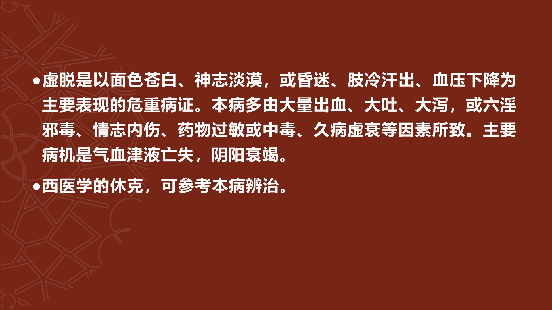 虚脱是以面色苍白、神志淡漠或昏迷、肢冷汗出、血压下降为主要表现的危重病证多由大量出血、大吐大泻、六淫邪毒等因素所致病机是气血津液亡失、阴阳衰竭西医学的休克可参考辨治。其主症包括面色苍白或发绀、神志淡漠、尿量减少等证型分亡阳、亡阴病情恶化可致阴阳俱脱。临床上需与中暑、中风等鉴别血常规等辅助检查有助于诊断。治疗以回阳固脱、苏厥救逆为法主穴取素髎、水沟、内关、足三里配穴据症选用素髎、水沟用泻法内关用补法;其他治疗可用耳针法取肾上腺等穴艾灸法取百会等穴。虚脱可由多种原因引起针灸为抢救措施之一但须针对原因治疗且提倡中西医综合治疗。复习思考包括虚脱辨证要点、主穴操作及配穴应用。