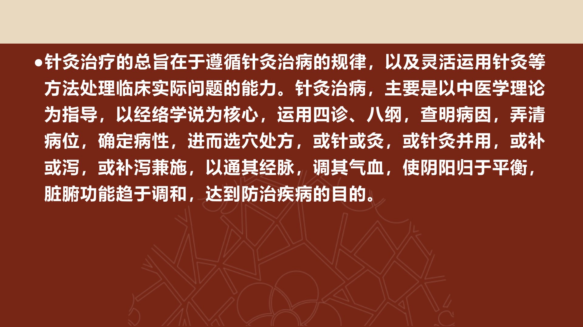 针灸治疗总论摘要一、治疗作用1疏通经络:针灸通过刺激腧穴调整经气畅通气血解除致病因素使脏腑器官和肢体得以濡养恢复正常功能。2调和阴阳:针灸通过选择腧穴和针刺手法调和阴阳恢复阴阳平衡。3扶正祛邪:针灸通过补虚泻实扶助正气祛除邪气保证疾病良性转归。二、治疗原则1治神守气:调治医患双方神气守气维护经络之气。2补虚泻实:虚证用补法实证用泻法虚实夹杂则补泻兼施。3清热温寒:热性病证清热寒性病证温寒复杂病证温清并用。4三因制宜:根据季节、地理环境、患者个体差异制定适宜原则。5治病求本:针对疾病本质治疗急则治标缓则治本标本同治。三、辨证论治纲要1整体观念:重视局部与整体关系经络联系全身。2明辨病证性质:明确病证阴阳、表里、寒热、虚实。3经络辨证:通过经络现象和穴位测定推知病位、病性。四、针灸处方1选穴原则:近部、远部、辨证、对症选穴。2配穴方法:上下、左右、前后、远近、表里配穴。3刺灸法选择与腧穴增减:根据病情选择疗法和施术方法随证候增加腧穴或交替取舍。4治疗时机:早诊断早治疗掌握疾病最佳治疗时机。