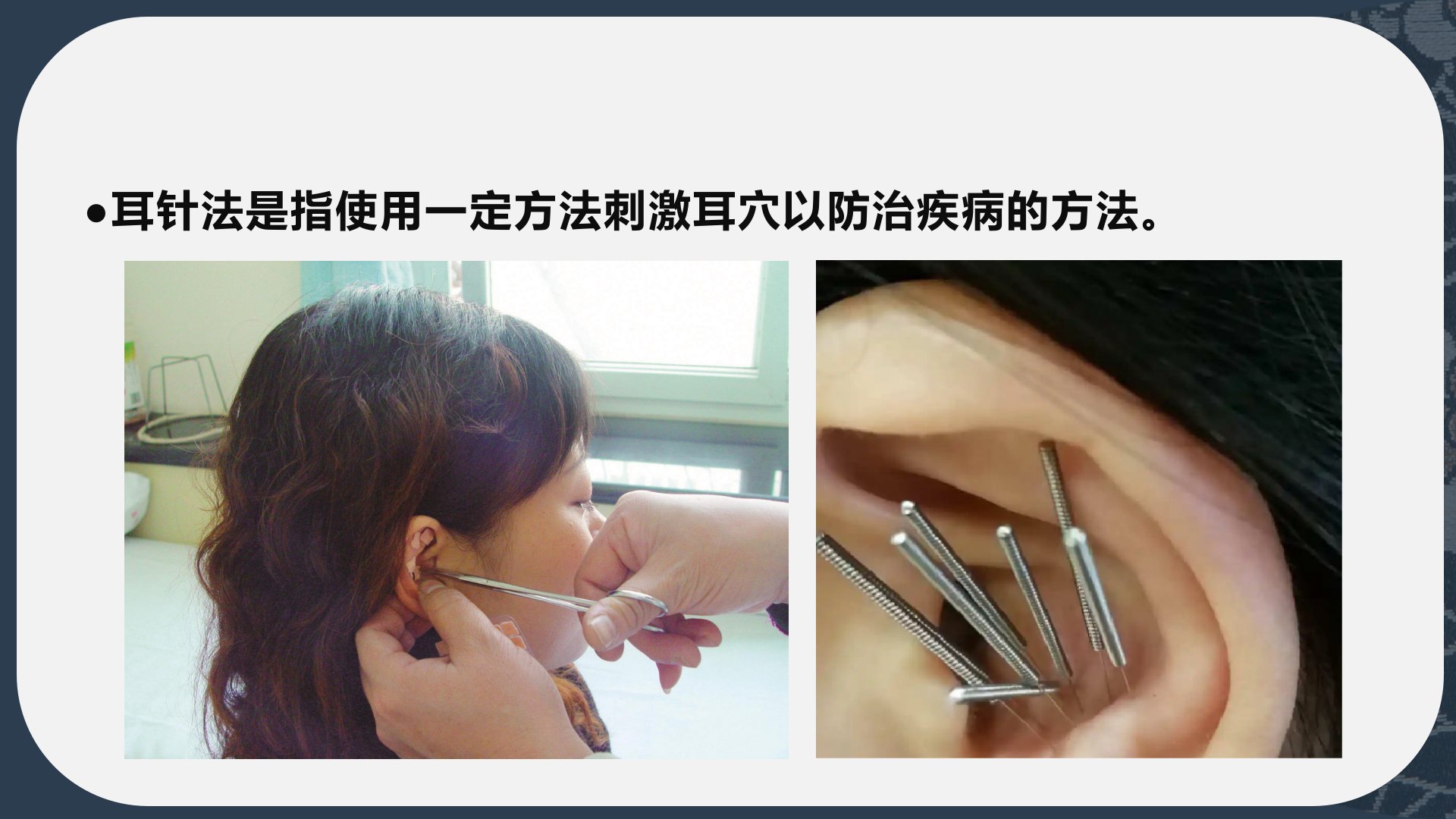耳针法摘要耳针法是通过刺激耳穴防治疾病的方法。一、耳郭表面解剖:详细描述了耳郭正面(如耳垂、耳轮等)和背面(如耳轮背面、耳舟隆起等)各部位名称与特征。二、耳穴名称及定位与主治1分布规律:耳穴与人体组织器官相对应呈“胚胎倒影”式分布。2标准耳郭分区:根据耳郭表面解剖名称分区。3耳穴定位与主治:按耳轮、耳舟等区域分类并详述各穴位主治。三、施术前准备1针具及压丸选择:针体要光滑压丸大小适宜、不易碎、无毒。2耳穴选择:通过耳穴探查和选穴原则确定有效耳穴探查方法有看、压、摸、测四种选穴原则包括按中医辨证、病证、西医学理论、经验选穴。3体位选择:以患者舒适、医者便于操作为宜。4消毒:包括针具、部位、医者消毒。四、施术方法1毫针法:选合适毫针刺入0103cm。2压丸法:贴压耳穴并适当按揉留置24天。3埋针法:刺入揿针用胶布固定留置13天。4刺血法:点刺耳穴适量出血。5电针法:针刺后利用脉冲电刺激强化疗效。6注射法:垂直刺入耳穴皮内注入药液。五、适应证:包括疼痛性疾病、功能紊乱和变态反应性疾病、炎性疾病及传染病等多种病症还用于催产、戒毒、美容等方面。六、注意事项:严格消毒防止感染;特殊疗法留置期间防胶