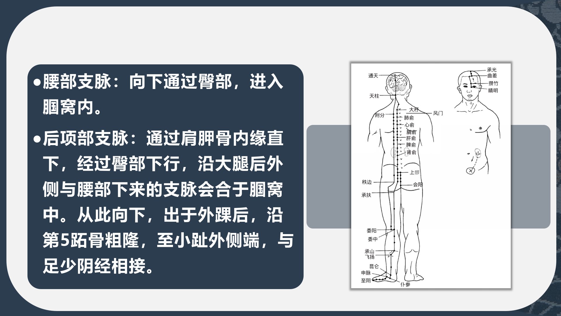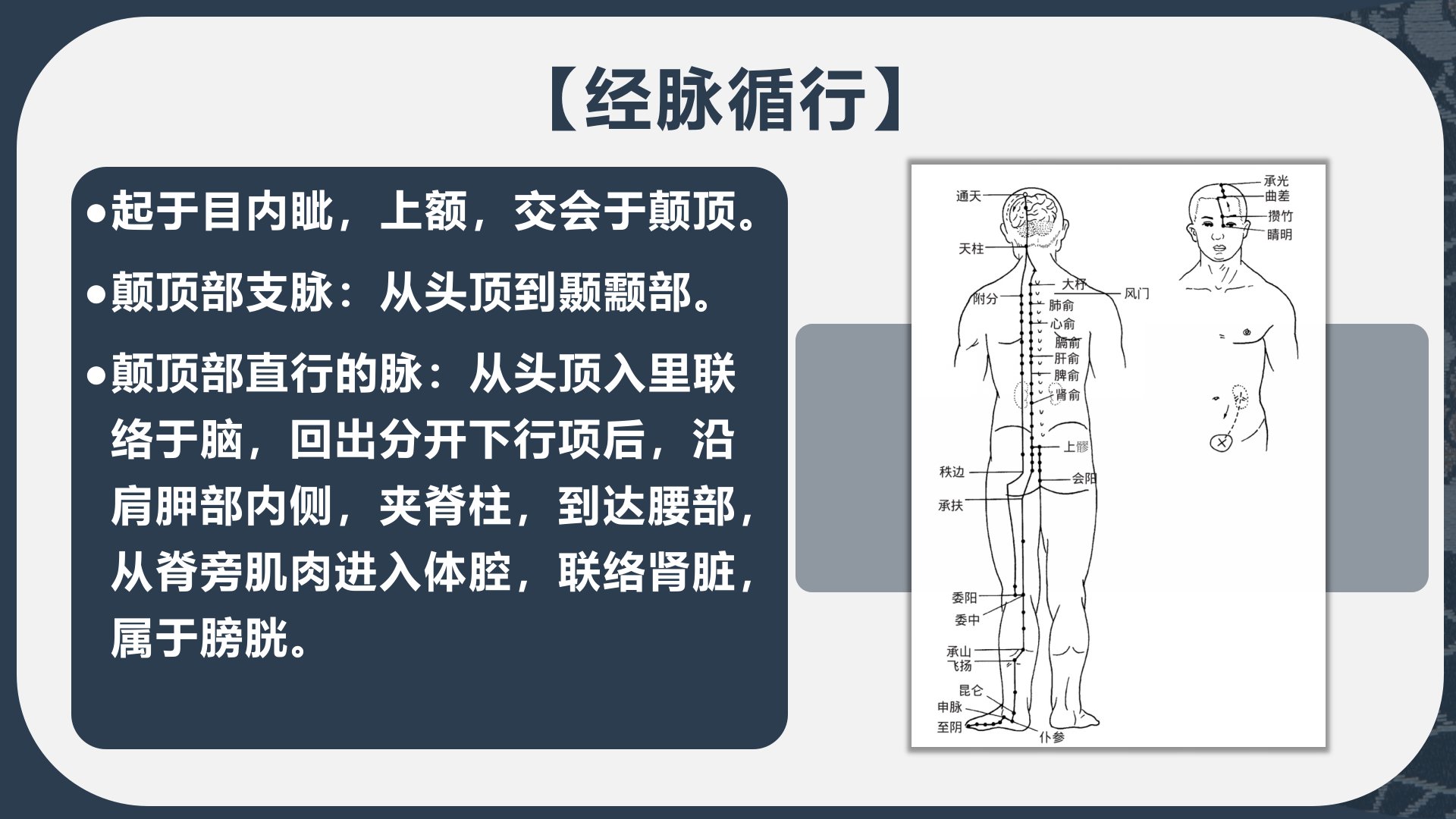 足太阳膀胱经及其腧穴摘要足太阳膀胱经起于目内眦上额交颠顶分支联络脑、肾、膀胱下行经腰、臀、腿后至小趾外侧与足少阴经相接。主治概要:涵盖目、头、项、背、腰、下肢病证及神志病。背部第1侧线背俞穴及第2侧线腧穴主治相关脏腑和组织器官病证。腧穴概况:本经单侧67穴起于睛明止于至阴。重要腧穴包括:睛明:治目疾、急性腰扭伤等禁灸。攒竹:治头痛、眉棱骨痛等禁直接灸。天柱:治后头痛、项强等不可深刺伤延髓。背俞穴(如肺俞、心俞、肝俞等):斜刺0508寸主治对应脏腑病证。合穴委中:治腰背痛、下肢痿痹等可点刺出血。八脉交会穴申脉:治头痛、失眠等。