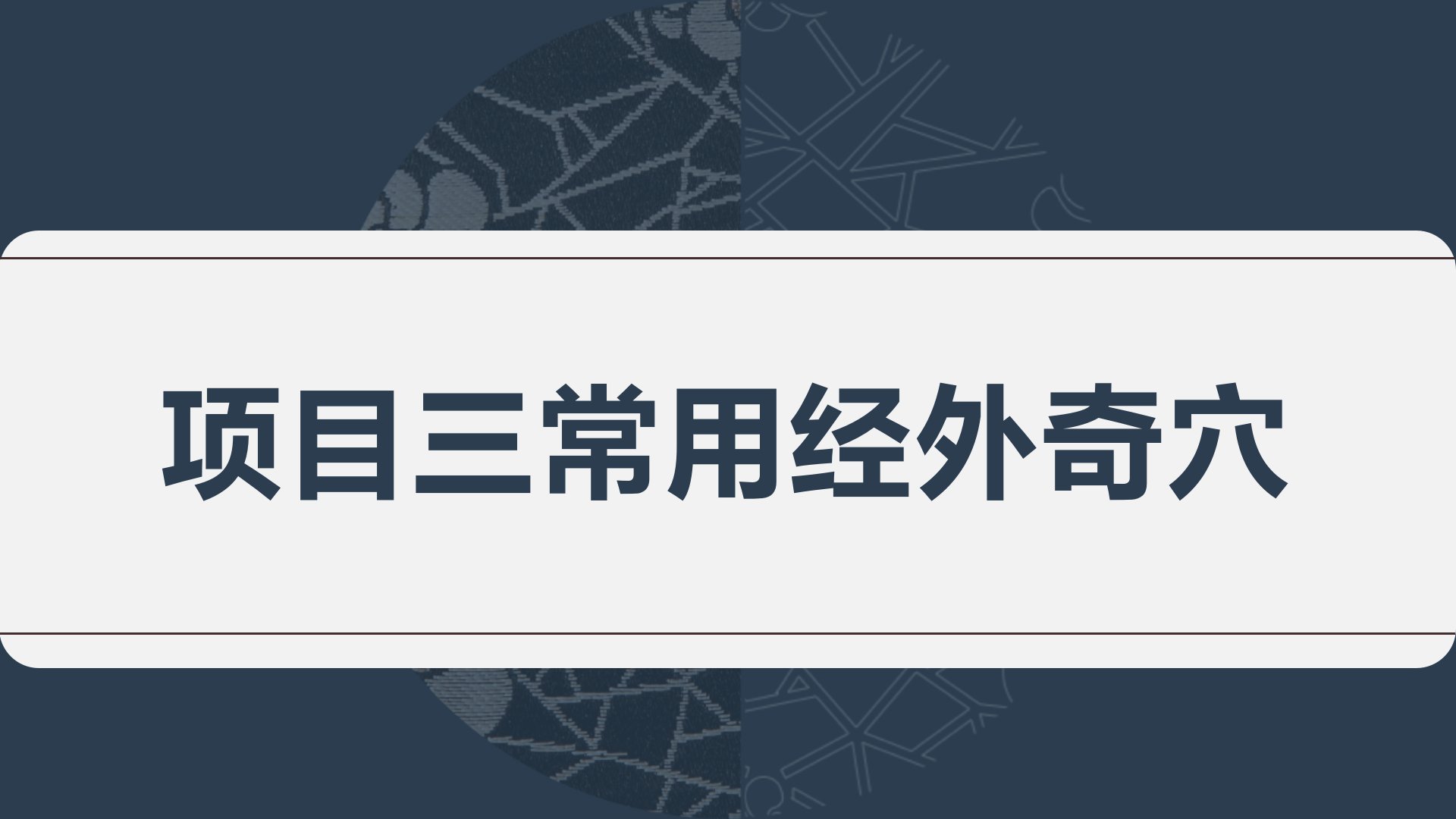 项目三常用经外奇穴摘要本文介绍了多个常用经外奇穴按身体部位分类如下:1头颈部穴:如四神聪位于头部百会前后左右各1寸可治疗头痛、眩晕等平刺0508寸;当阳在头部瞳孔直上前发际上1寸主治偏正头痛等平刺0508寸;鱼腰在瞳孔直上眉毛中可治疗眉棱骨痛等平刺0305寸;太阳在眉梢与目外眦间主治头痛目疾等直刺或斜刺0305寸可点刺出血;耳尖在外耳轮最高点主治目疾头痛等直刺0102寸或点刺出血禁灸。2胸腹部穴:子宫穴在下腹部主治阴挺、月经不调等直刺0812寸。3背部穴:定喘在脊柱区横平第7颈椎棘突下主治哮喘咳嗽等直刺0508寸;夹脊位于第1胸椎至第5腰椎棘突下两侧上胸部穴位治心肺、上肢疾病下胸部治胃肠疾病腰部治腰腹及下肢疾病直刺0305寸。4上肢部穴:肘尖在肘后区尺骨鹰嘴尖端主治瘰疬等艾炷灸715壮;二白在前臂前区主治痔疾脱肛等直刺0508寸。5下肢部穴:髋骨在股前区梁丘两旁主治膝痛足胫无力直刺0810寸;鹤顶在膝前区髌底中点上方凹陷中主治膝痛足胫无力直刺0810寸。