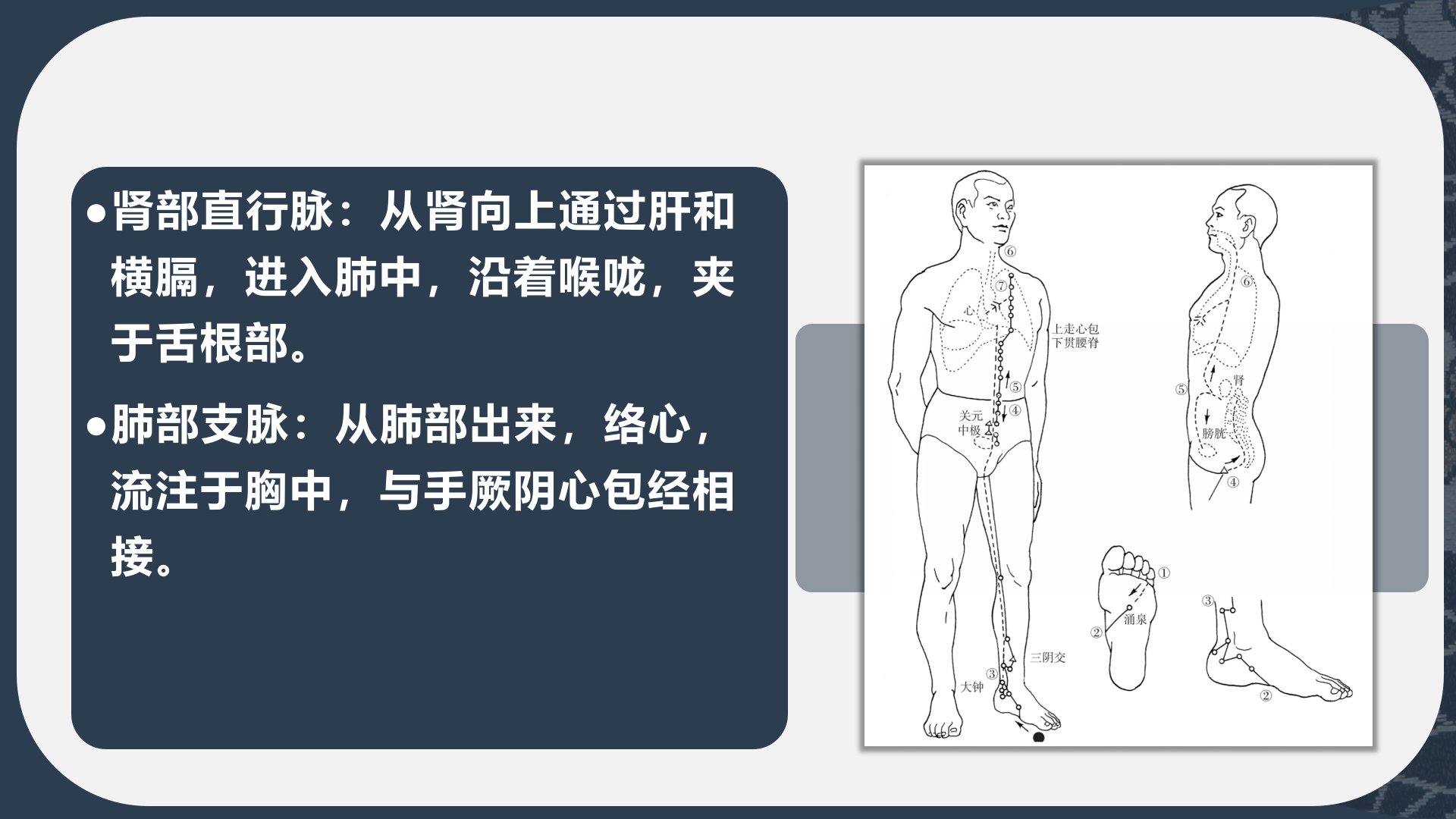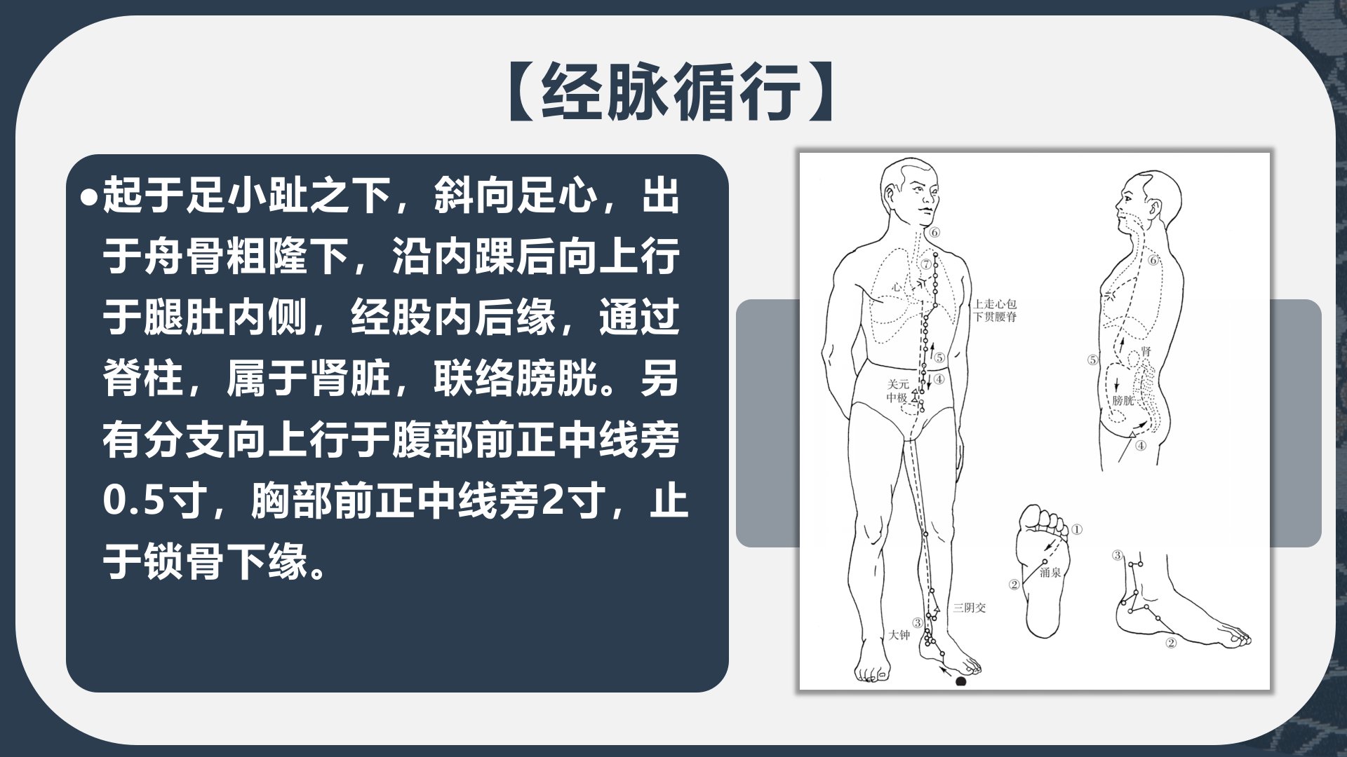 足少阴肾经及其腧穴摘要足少阴肾经:经脉循行:起于足小趾下斜向足心经内踝后、腿肚内侧、股内后缘通过脊柱属肾、联络膀胱;有分支行于腹部、胸部;肾部直行脉从肾向上通过肝和横膈进入肺中肺部支脉从肺出来络心流注于胸中与手厥阴心包经相接。联系脏腑及器官:与肾、膀胱、肝、肺、心、咽喉等脏腑器官相关联。主治概要:主治妇科、前阴病肾、肺、肝、心、咽喉病及经脉循行部位病证。腧穴:单侧27穴起涌泉止于俞府各穴定位、主治及操作如下:涌泉:足底最凹陷中直刺0508寸主治昏厥等多种病症。然谷:足舟骨粗隆下方直刺0508寸主治月经不调等。太溪:内踝尖与跟腱间凹陷中直刺0508寸主治头痛目眩等。此外还有大钟、水泉、照海等穴各穴主治不同病症操作多为直刺。