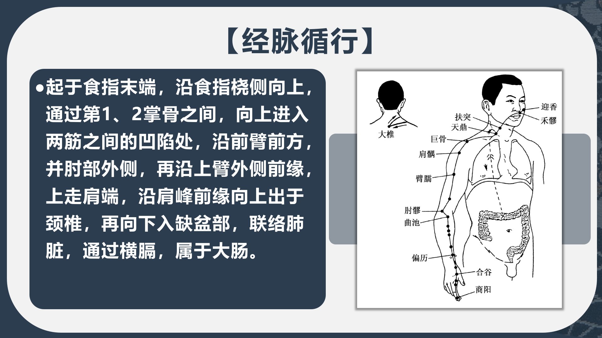 手阳明大肠经及其腧穴摘要手阳明大肠经起于食指末端沿前臂、上臂外侧前缘上走肩端出于颈椎后入缺盆部联络肺脏通过横膈属于大肠。其缺盆部支脉上走颈部通过面颊进入下齿龈回绕至上唇分布于鼻孔两侧与足阳明胃经相接。本经主治头面、五官病、热病、肠胃病及经脉循行部位的其他病证。单侧20穴起商阳止于迎香。商阳为井穴主治齿痛等五官病证及热病昏迷;二间为荥穴主治鼻衄等五官病证及热病;三间为输穴主治齿痛等;合谷为原穴主治头面五官诸疾、各种痛证等;阳溪为经穴主治手腕痛等头面五官病证。此外偏历、温溜、下廉、上廉、手三里、曲池等穴也各有主治功效操作时需注意针刺深度与禁忌如孕妇禁针合谷扶突穴禁灸等。