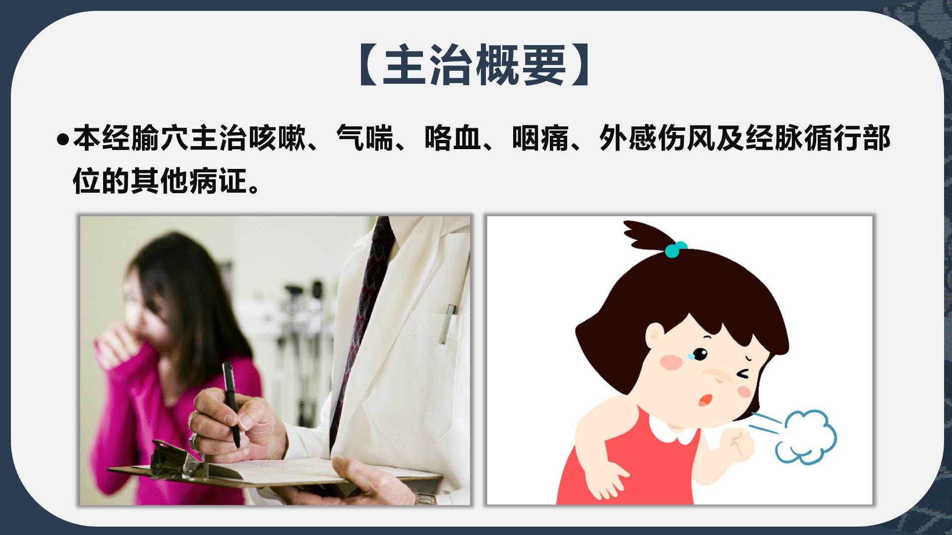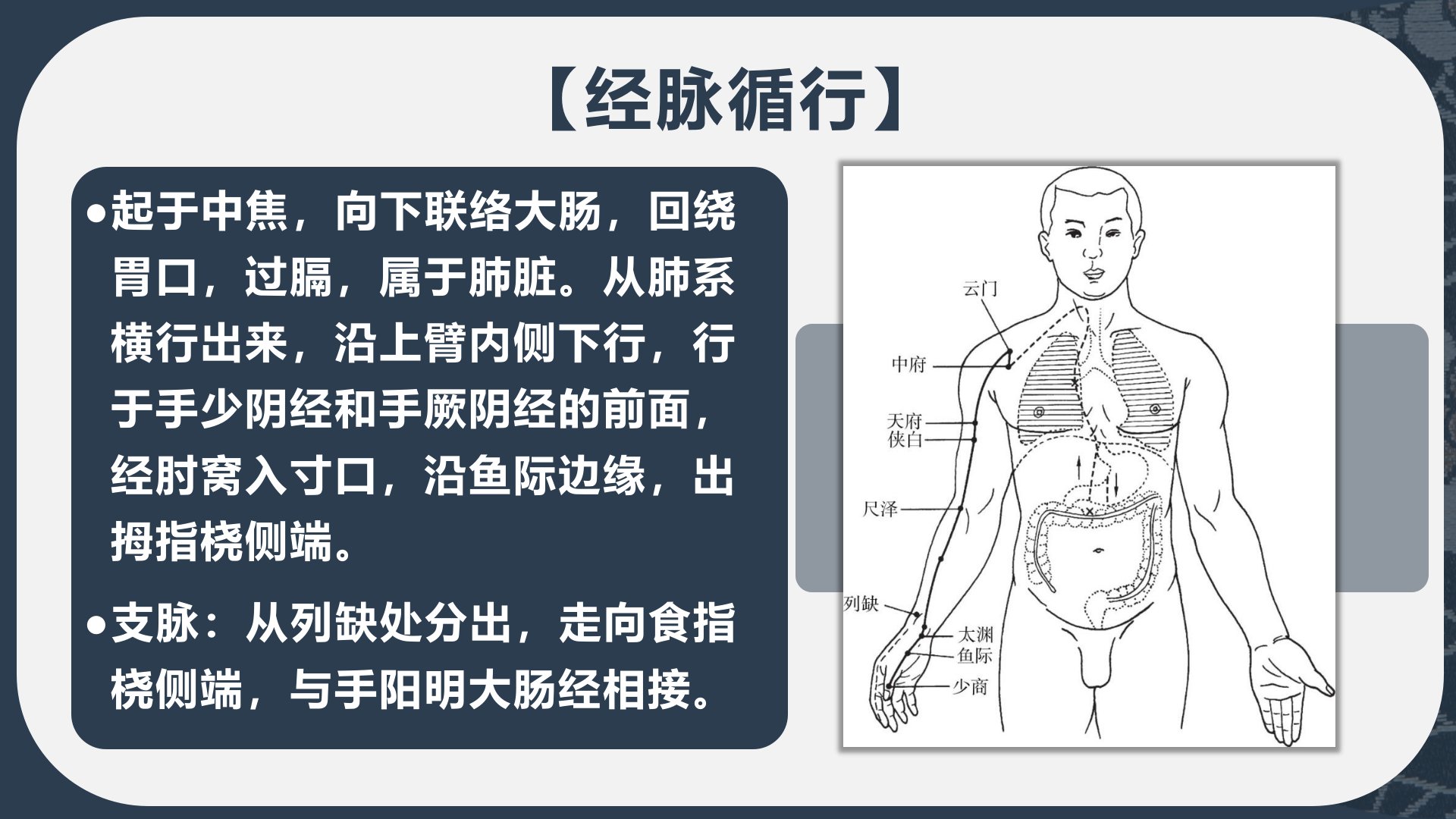 手太阴肺经及其腧穴摘要手太阴肺经起于中焦联络大肠回绕胃口过膈属肺从肺系横行出来沿上臂内侧下行经肘窝入寸口沿鱼际边缘出拇指桡侧端支脉从列缺处分出走向食指桡侧端与手阳明大肠经相接。主治咳嗽、气喘、咯血等肺系病证及经脉循行部位病证。本经单侧11穴起自中府止于少商。中府、云门可治咳嗽气喘胸满痛等向外斜刺0508寸不可向内深刺;天府、侠白治咳嗽气喘等直刺0510寸;尺泽、孔最治咳嗽气喘等尺泽直刺0812寸可点刺放血孔最直刺0510寸;列缺治咳嗽气喘等向上斜刺0508寸;经渠、太渊避开桡动脉直刺;鱼际直刺0508寸;少商浅刺01寸或点刺出血。复习思考涉及手太阴肺经经脉循行、联系脏腑器官及腧穴主治概要。