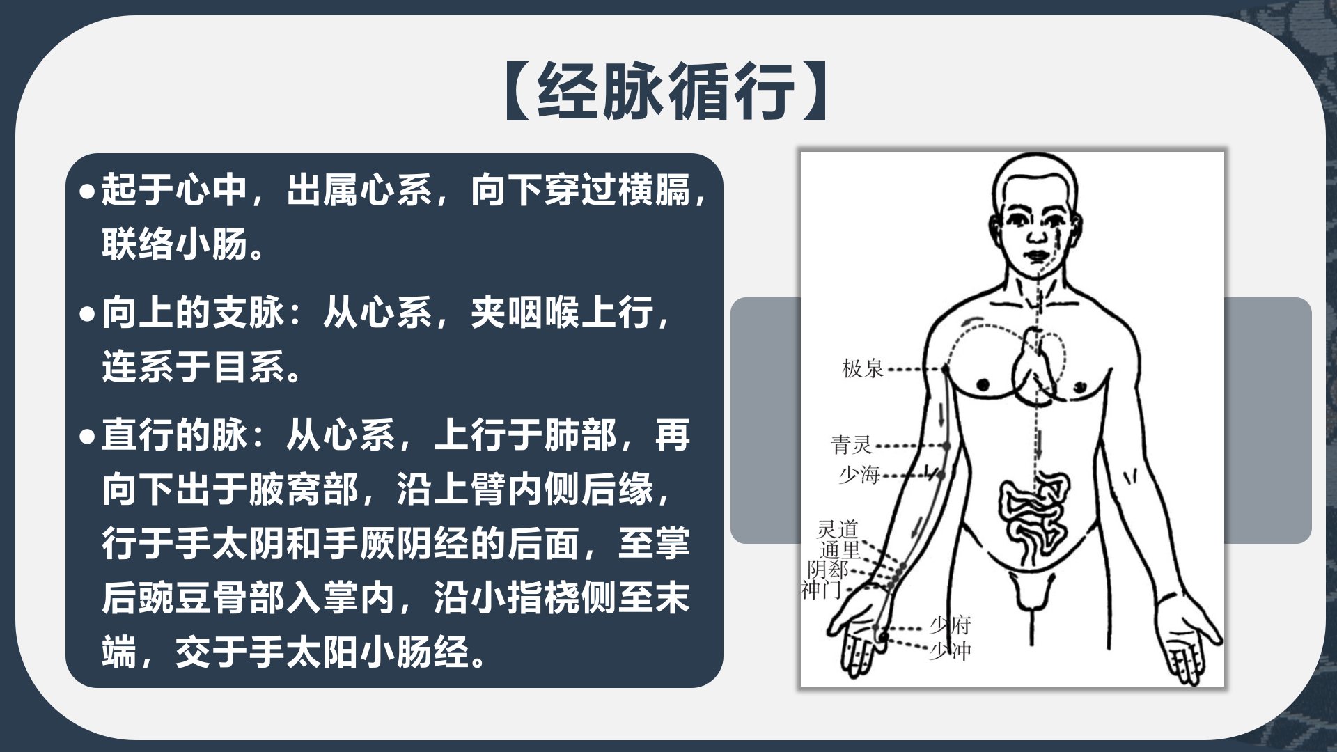 手少阴心经及其腧穴摘要:手少阴心经起于心中出属心系向下联络小肠上行支脉夹咽喉连目系直行脉上行肺部后出于腋窝部沿上臂内侧后缘行至掌后豌豆骨部入掌内沿小指桡侧至末端交于手太阳小肠经。主治心、胸、神志病及经脉循行部位病证。本经单侧9穴起极泉止于少冲。各腧穴定位与主治如下:极泉在腋窝中央主治心痛心悸等;青灵在肘横纹上3寸主治头痛胁痛等;少海在肘前区主治心痛癔症等;灵道在前臂主治心痛善笑等;通里、阴郄也位于前臂分别主治心悸怔忡、心痛惊悸等;神门在腕前区主治心与神志病变等;少府在手掌主治心悸胸痛等;少冲在小指末节主治心悸心痛等。复习可思考手少阴心经的经脉循行、联系脏腑器官及腧穴主治概要。