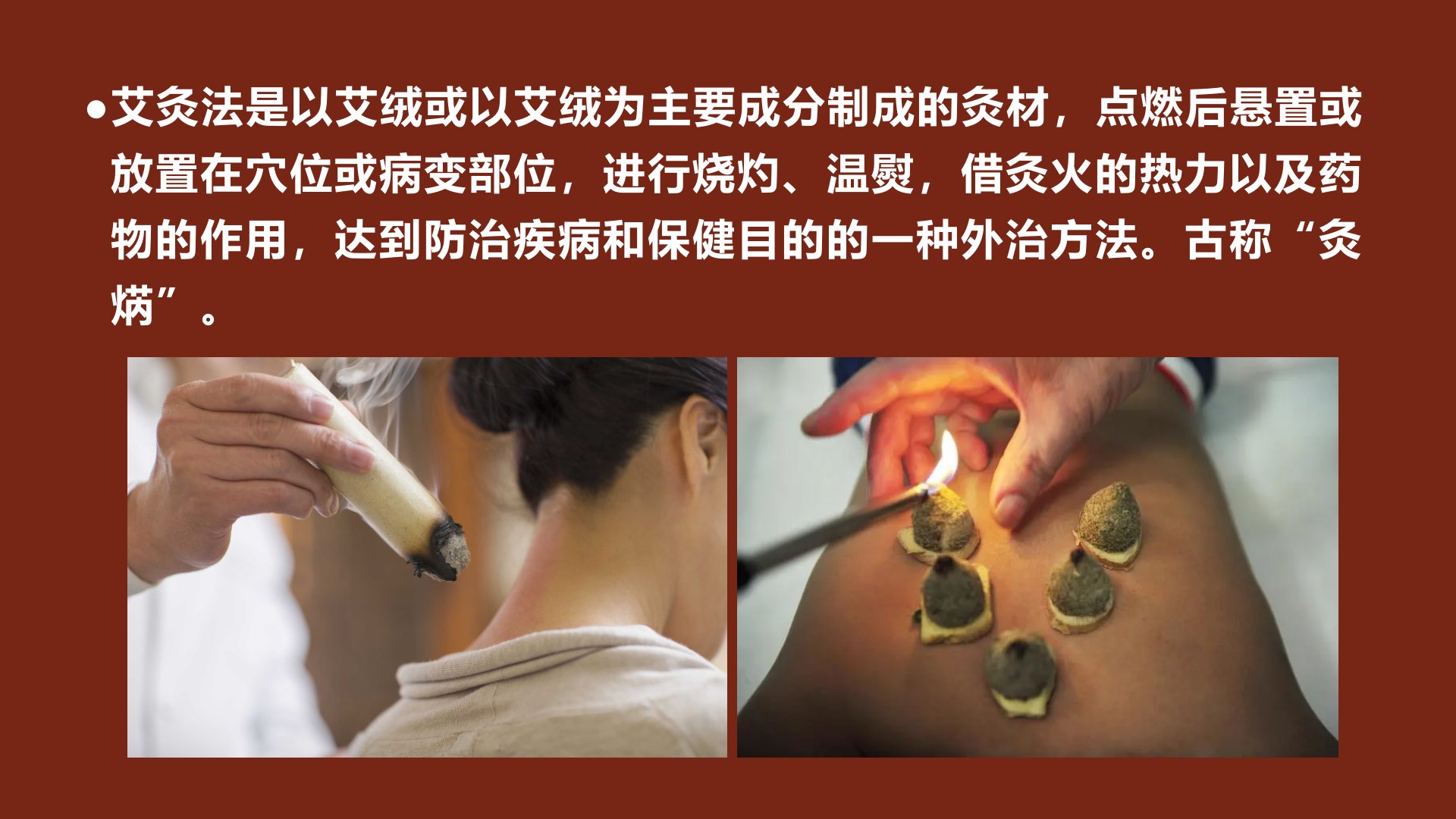 艾灸法艾灸法是以艾绒或以艾绒为主要成分制成的灸材,点燃后悬置或放置在穴位或病变部位,进行烧灼、温熨,借灸火的热力以及药物的作用,达到防治疾病和保健目的的一种外治方法。古称“灸焫”。《医学入门·针灸》曰:“药之不及,针之不到,必须灸之。”说明艾灸在防治疾病方面有独特的疗效,并能弥补针刺和药物某些方面之不足。一、艾灸常识1.艾灸材料施灸的材料很多,但古今皆以艾绒(艾叶经加工制成的淡黄色细软绒状物)为主。艾绒的特点:易燃烧,火力温和持久;制备简单、价廉物美、易于贮藏备用;洗、熏、服用皆可;善通十二经脉及奇经八脉。2.艾灸分类艾灸一般分为艾炷灸法、艾条灸法、温针灸法、温灸器灸法等。临床另有非艾灸法,如...