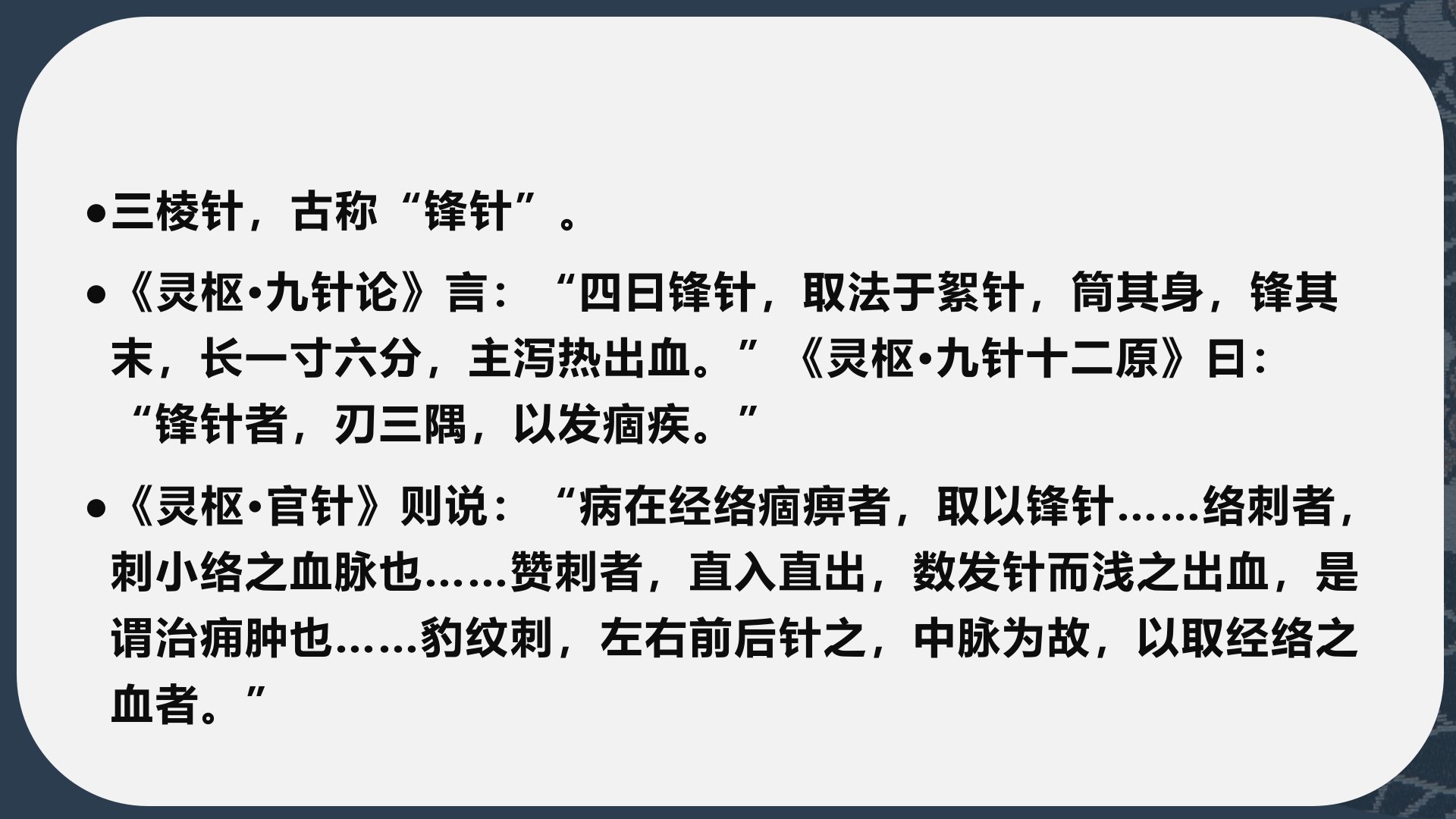 三棱针古称“锋针”多为不锈钢制针身三棱形针尖锋利持针如握毛笔。施术前需选择合适的针具、针刺部位和体位并进行严格的消毒。施术方法包括点刺法用于指、趾末端等穴;散刺法多用于局部瘀血等;挑治法用于治疗支气管哮喘、肩周炎等;刺络法多用于阿是穴等治疗下肢静脉曲张、中暑等。施术后需用消毒棉球擦拭控制出血量每次总出血量应在50mL以内。三棱针法常用于热证、实证、瘀血、疼痛等病证点刺法多用于急症挑刺法多用于肌肉酸痛散刺法多用于慢性病刺络法多用于急症和中毒性疾病等。使用时需严格掌握适应证注意无菌操作孕妇、体弱者等人群慎用或禁用。