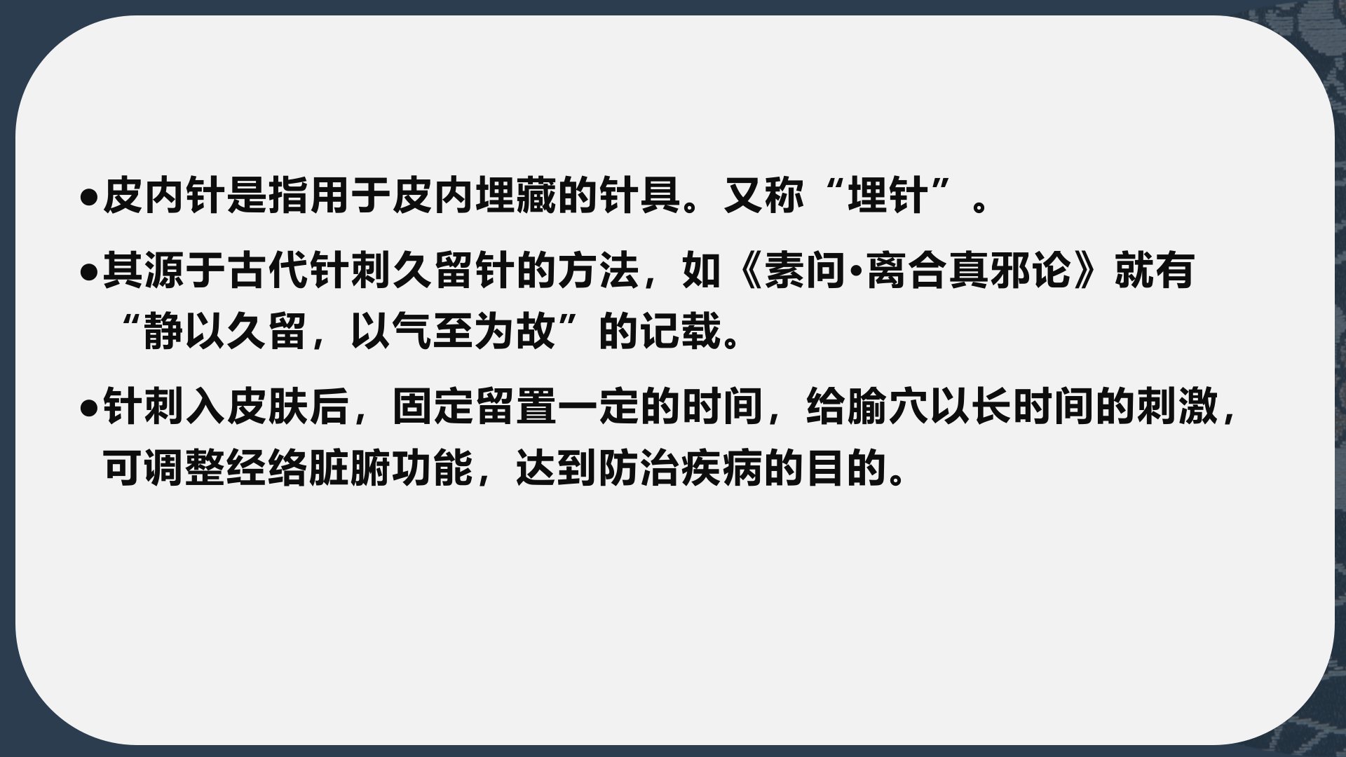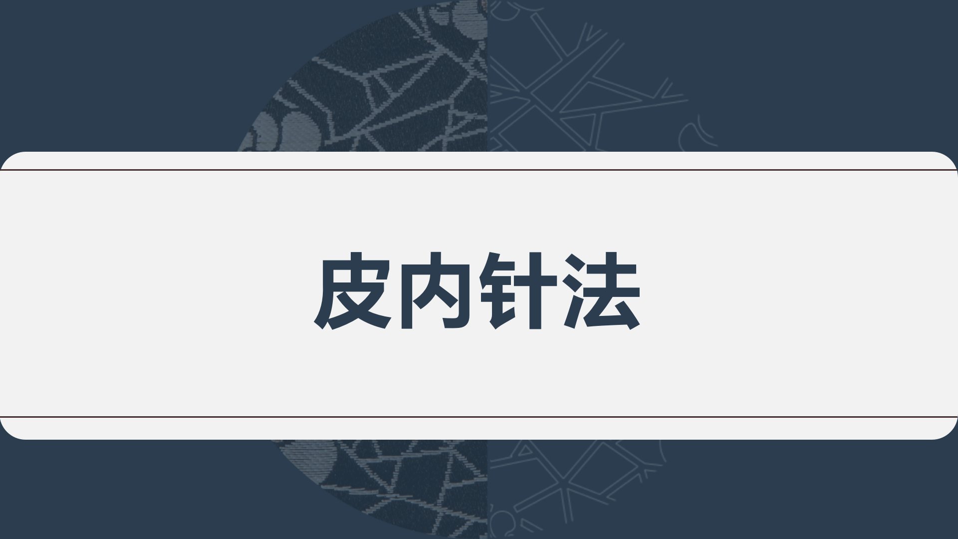 皮内针法指将皮内针埋藏于皮内以治疗疾病的方法又称“埋针”源于古代针刺久留针的理念。皮内针有两种类型:颗粒型(麦粒型)和揿钉型(图钉型)。施术前需做好准备包括根据病情选针具确保针身光滑、针尖锐利;选患者舒适且医者便于操作的体位;选便于固定且不妨碍活动的部位;并对针具、施术部位和医者手指进行消毒。施术时颗粒型皮内针平刺入腧穴皮内后固定揿钉型则垂直刺入后固定。埋针后需每日按压数次埋针时间一般为23日可根据实际情况调整。皮内针法多用于慢性顽固性疼痛和久治不愈的慢性病证。施术时需向患者做好解释检查针具特定人群取卧位注意埋针深度和方向避免感染关节和颜面部慎用红肿破损等处禁针。