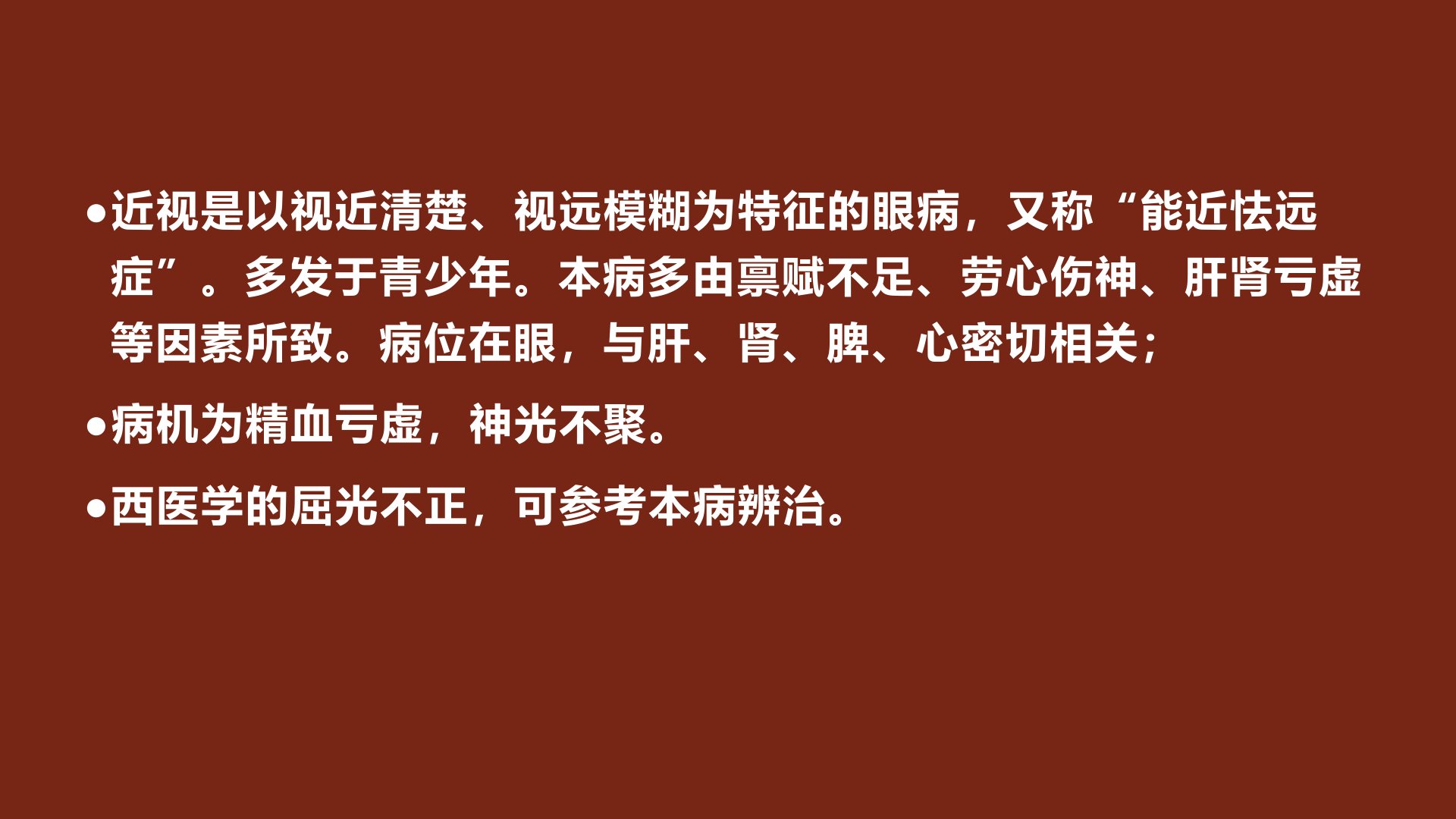 五官科病证近视近视是以视近清楚、视远模糊为特征的眼病,又称“能近怯远症”。多发于青少年。本病多由禀赋不足、劳心伤神、肝肾亏虚等因素所致。病位在眼,与肝、肾、脾、心密切相关;病机为精血亏虚,神光不聚。西医学的屈光不正,可参考本病辨治。平行光线聚焦在视网膜之前导致的视物模糊受遗传、环境因素综合影响,具有家族聚集性看远处物体时视物模糊,近处视力正常配戴框架眼镜、角膜接触镜或手术治疗【辨证】主症视近物清楚、视远物则模糊。证型肝肾两虚者兼见失眠健忘,头晕耳鸣,腰膝酸软,两目干涩,舌淡、苔薄,脉细弱或弦细;气血不足者兼见神疲乏力,纳呆便溏,头晕心悸,面色不华,舌淡、苔薄白,脉细弱;心阳不足者兼见面色㿠白,...