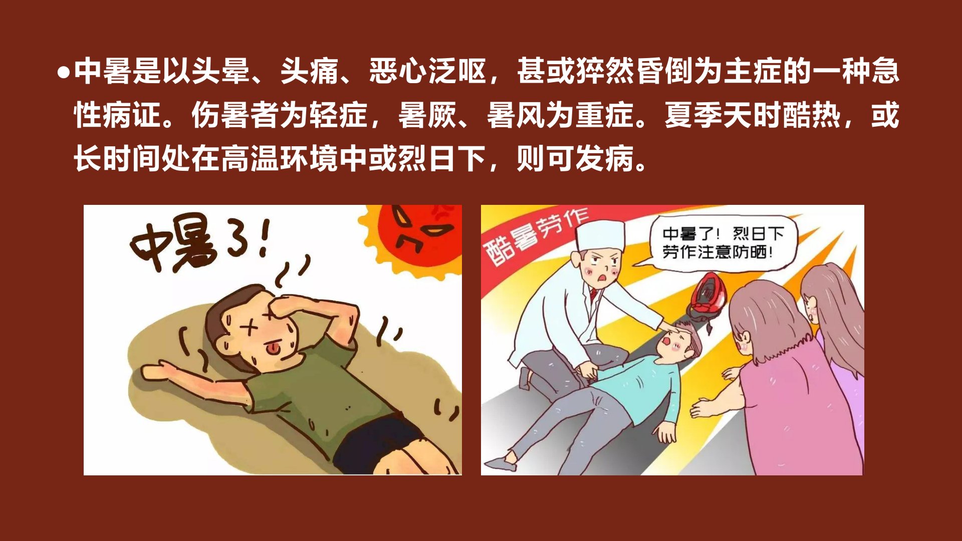 其他病证中暑中暑是以头晕、头痛、恶心泛呕,甚或猝然昏倒为主症的一种急性病证。伤暑者为轻症,暑厥、暑风为重症。夏季天时酷热,或长时间处在高温环境中或烈日下,则可发病。本病多由体质虚弱,暑热或暑湿秽浊之气乘虚侵袭人体而为病。轻症多因暑热郁于肌表,邪热不得外泄;重症多因暑热炽盛,内犯心包,上扰清空,出现高热、神昏、痉厥,甚则虚脱的气阴两竭危候。西医学的热痉挛、热射病,可参考本病辨治。因暴露于高温环境,核心体温上升引起的疾病与机体产热、获取热量增加,散热障碍有关有头痛、头晕、高热或神经和心血管系统症状治疗以迅速降低体温和防治脏器功能衰竭为主【辨证】轻者身热少汗,头晕,头痛,胸闷,恶心,烦渴,倦怠乏力,...