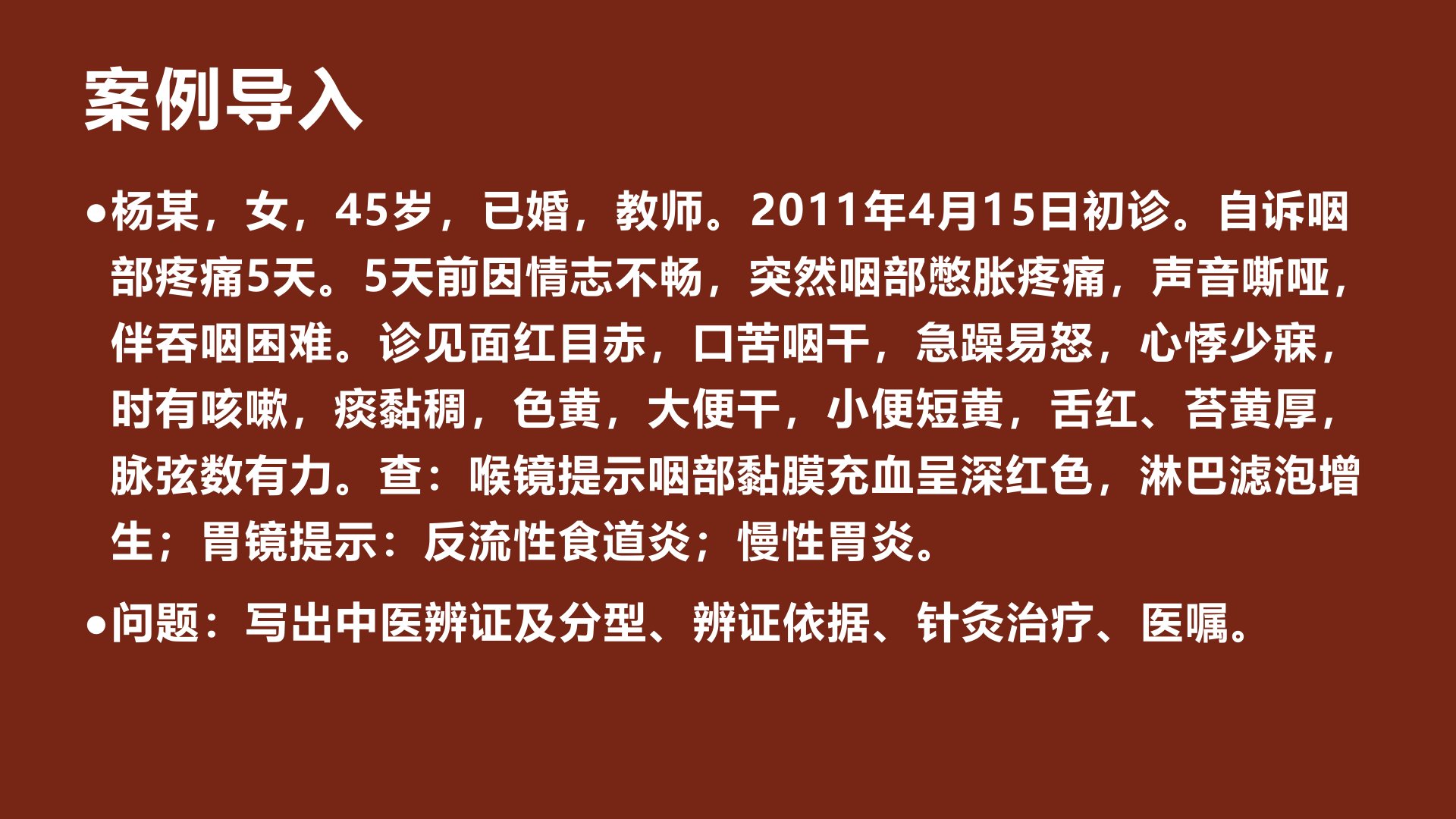 案例导入患者杨某45岁女性教师因情志不畅致咽部憋胀疼痛、声音嘶哑伴吞咽困难5天就诊。诊见面红目赤、口苦咽干、急躁易怒、心悸少寐等症状查喉镜提示咽部黏膜充血淋巴滤泡增生胃镜提示反流性食道炎、慢性胃炎。咽喉肿痛多由外邪、肺胃热盛、痰热蕴结等因素所致病位在咽喉与肺、脾、肝、肾密切相关。中医辨证分实证和虚证实证发病急病程短咽喉疼痛较剧咽部充血明显杨某属实证中的肺胃实热型兼见口渴多饮、咳嗽痰黏稠等症状。治疗宜清热利咽、消肿止痛取手太阴、手足阳明、足少阴经穴为主主穴包括少商、商阳等配穴根据证型加减毫针刺用泻法或平补平泻法少商、商阳点刺放血。针灸治疗咽喉肿痛效果较好但肿大成脓、不能进食者需及时补液并转科处理。同时患者需饮食清淡忌烟酒辛辣加强锻炼。