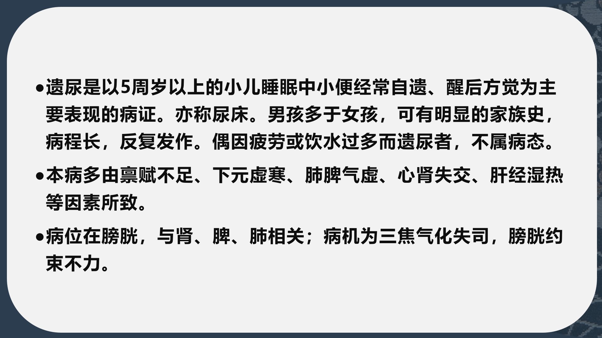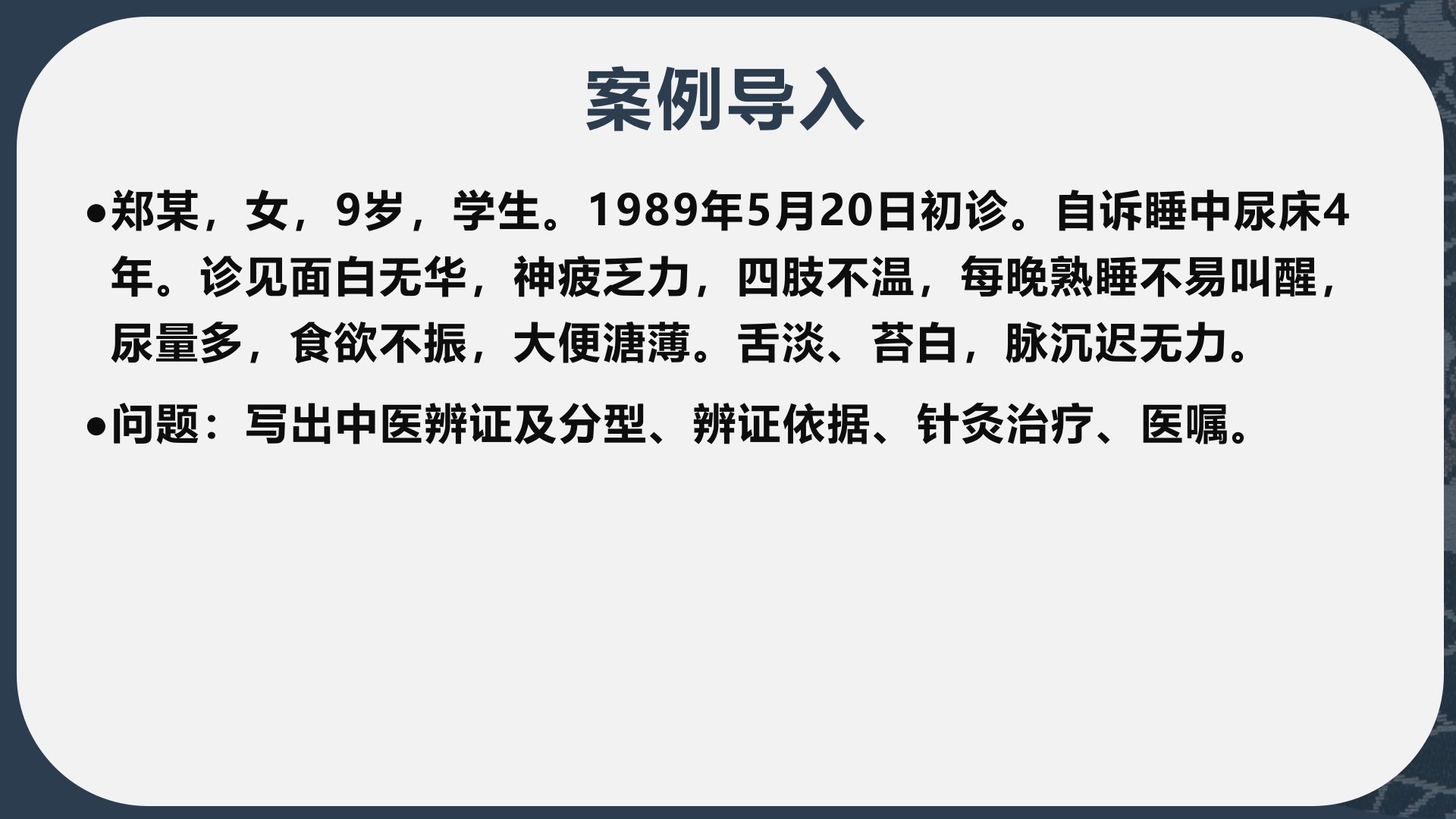 郑某女9岁学生睡中尿床4年诊见面白无华、神疲乏力、四肢不温、食欲不振、大便溏薄等症状中医辨证为肾气不足型遗尿。辨证依据包括尿量多、尿色清、面色淡白、精神不振、形寒肢冷、舌淡苔白、脉沉迟无力等。本病多由禀赋不足等因素所致病位在膀胱与肾、脾、肺相关。针灸治疗以补肾益气、健脾止遗为主取任脉穴和膀胱经背俞穴主穴为肾俞、关元、三阴交肾气不足者加腰阳关、秩边等穴毫针刺用补法可灸。其他治疗包括耳针法、激光法、皮肤针法等。医嘱方面需排除器质性疾病勿使患儿过度疲劳和情绪激动控制睡前饮水量夜间按时唤醒排尿鼓励患儿消除紧张情绪树立信心积极配合治疗。