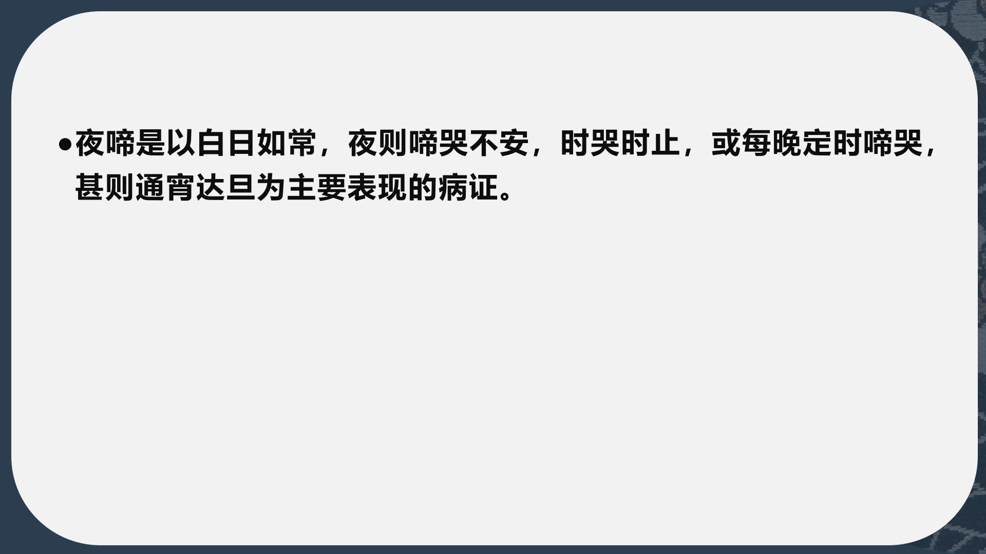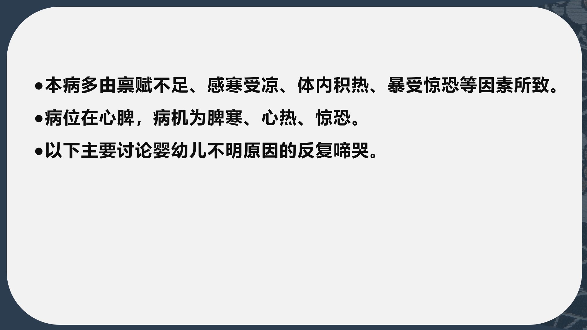 夜啼是以白日如常、夜则啼哭不安为主要表现的病证多由禀赋不足、感寒受凉、体内积热、暴受惊恐等因素所致病位在心脾。婴幼儿不明原因反复啼哭辨证分为实证和虚证:实证每夜啼哭哭声响亮心经积热者面赤唇红、多汗便秘;惊恐伤神者突然惊醒而啼哭、面色青灰。虚证病程长哭声低微脾阳亏虚者睡喜蜷曲、四肢不温。治疗以健脾宁心、镇静安眠为主取心经与脾经、胃经穴为主主穴包括少冲、内关、三阴交、足三里配穴根据证型加减。其他治疗包括艾灸法、穴位贴敷法、耳针法。按语指出本病应排除其他疾病引起的啼哭注意补充维生素、保持居室安静脾寒者注意保暖心热者避免过于保暖患病期间食用易消化食物。