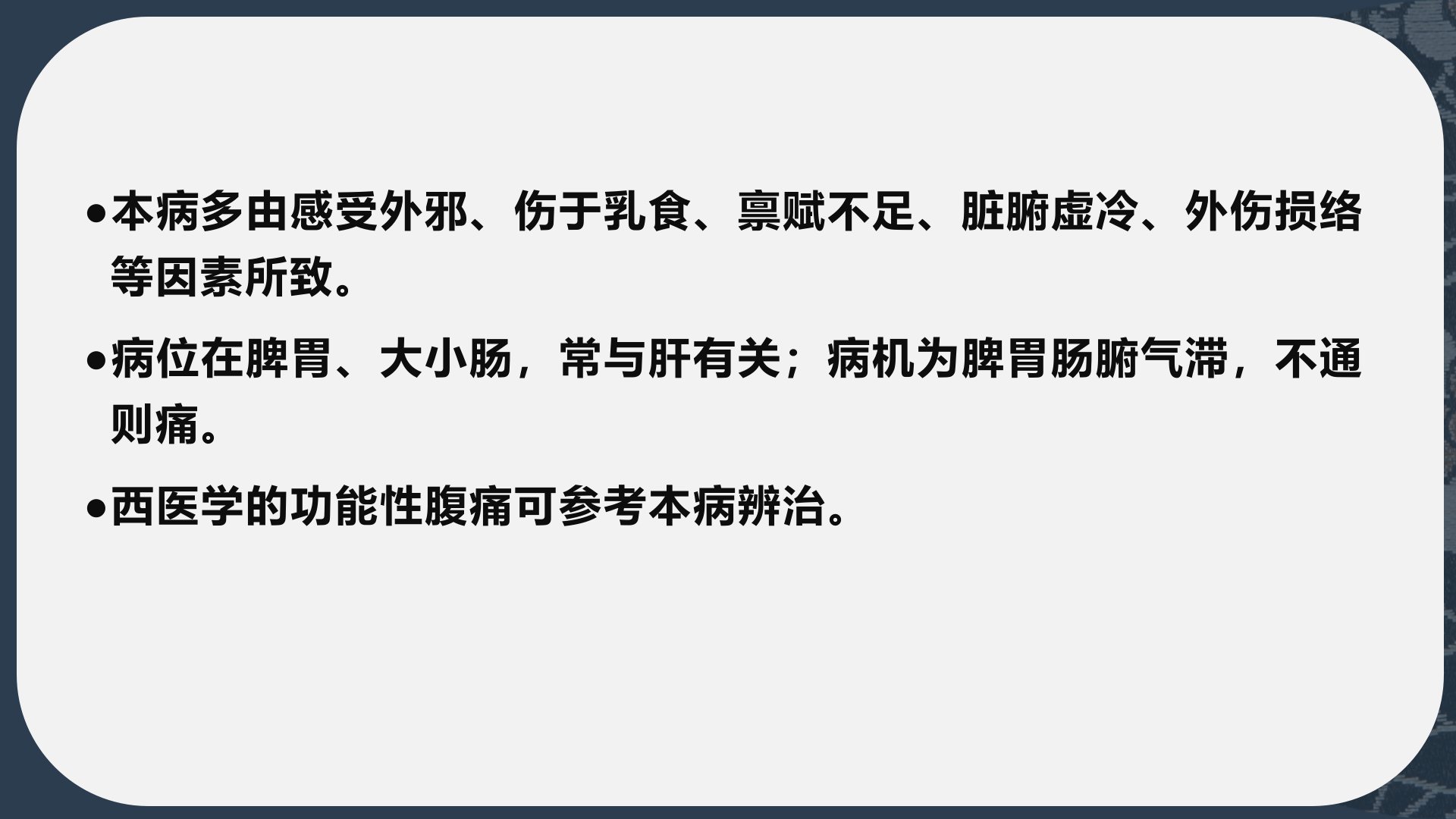 腹痛是以胃脘以下等部位疼痛为主要表现的病证多由感受外邪、伤于乳食等因素所致病位在脾胃、大小肠常与肝有关病机为脾胃肠腑气滞不通。西医学功能性腹痛可参考本病辨治。辨证分实证与虚证实证如腹部中寒、乳食积滞、胃肠结热等虚证如脾胃虚寒。治疗以健脾和胃、行气止痛为基本治法取脾胃俞募穴及足阳明胃经穴为主主穴为足三里、合谷、中脘、天枢配穴随证加减毫针浅刺用平补平泻法。其他治疗包括耳针法、艾灸法。按语强调小儿腹痛需及早明确诊断注意鉴别诊断避免感受风寒注意饮食卫生对一般功能性腹痛疗效较好对虫积腹痛须服驱虫药器质性病变引起的腹痛需做其他处理。