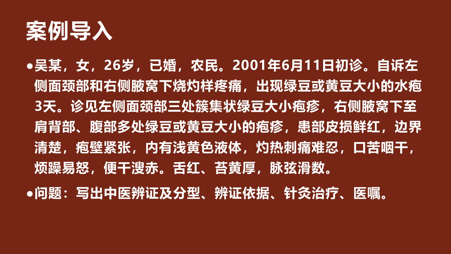 26岁农民吴某2001年6月11日初诊左侧面颈部和右侧腋窝下出现烧灼样疼痛及绿豆至黄豆大小水疱3天。诊见患部皮损鲜红、边界清晰、疱壁紧张内有浅黄色液体伴灼热刺痛、口苦咽干、烦躁易怒、便干溲赤等症状舌红、苔黄厚脉弦滑数。中医诊断为蛇串疮(带状疱疹)辨证为肝经郁热型依据皮损鲜红、疱壁紧张、灼热刺痛及情志症状等。治疗以泻火解毒、清热利湿、活血通络为主取阿是穴及夹脊穴为主穴肝经郁热加太冲、大敦、侠溪毫针刺用泻法疱疹局部用围针刺法配合艾条温和灸。其他疗法包括三棱针法、皮肤针法、穴位注射法。针灸治疗蛇串疮疗效显著尤以围针刺法配合艾灸为佳一般7日左右可愈。医嘱饮食清淡忌辛辣油腻发物加强锻炼保证充足睡眠。