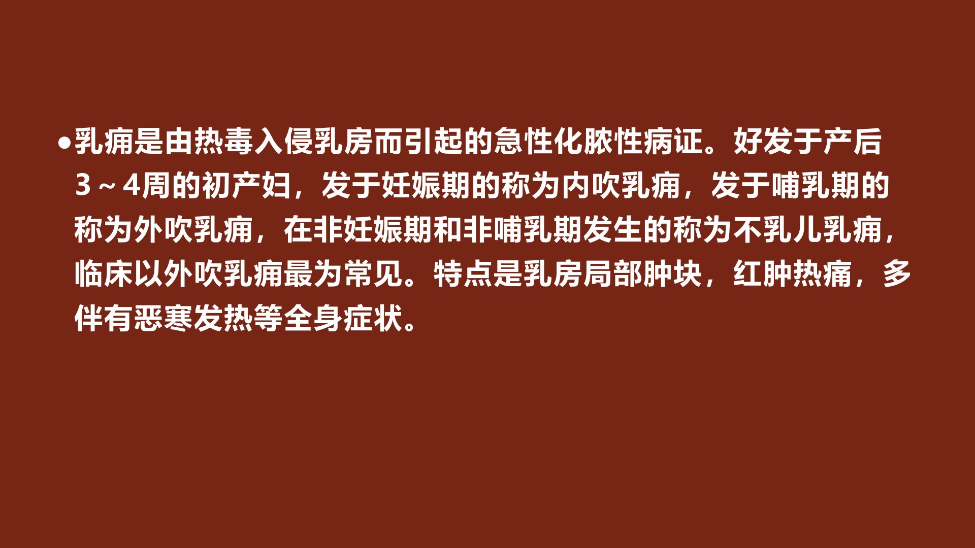 乳痈由热毒入侵乳房引发是一种急性化脓性病证好发于产后34周的初产妇以外吹乳痈最为常见。其特点是乳房局部肿块红肿热痛伴恶寒发热等全身症状。病因包括乳汁郁积、肝郁胃热、感受外邪等病位在乳房与肝、脾、胃相关病机为乳络不通邪毒蕴结。西医学的急性化脓性乳腺炎可参考本病辨治。乳痈分初期、成脓期、溃脓期三阶段各有不同症状表现。治疗上初期以抗感染为主针灸治疗基本治法为疏肝散结、清热和胃取足阳明、足厥阴经穴为主配穴依证型加减。其他治疗包括三棱针法和耳针法。按语提示针灸治疗未化脓者疗效较好若已化脓应及时转外科治疗同时保持乳房清洁纠正不良哺乳习惯饮食宜清淡。