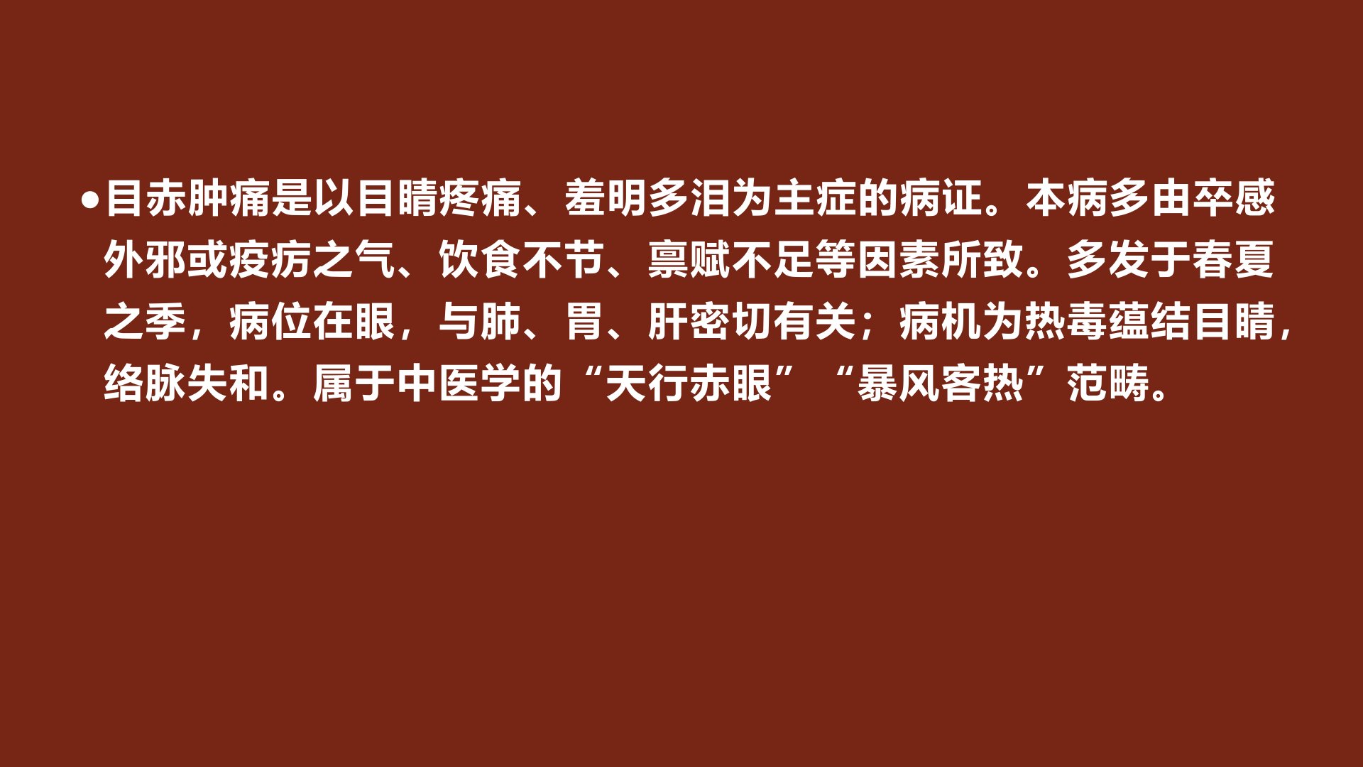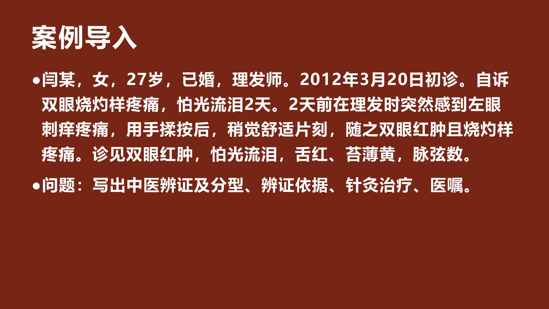 闫某27岁女性理发师2012年3月20日初诊自诉双眼烧灼样疼痛、怕光流泪2天起因于理发时左眼刺痒疼痛揉按后双眼红肿。诊见双眼红肿、怕光流泪舌红苔薄黄脉弦数。目赤肿痛属中医“天行赤眼”“暴风客热”范畴多由外邪、饮食不节等因素所致病位在眼与肺、胃、肝相关病机为热毒蕴结。西医学的多种结膜炎可参考此病辨治。中医辨证分风热外袭和热毒炽盛两型该患者属热毒炽盛。治疗以清泻风热、消肿止痛为主取手阳明、足太阳、足厥阴经穴主穴为太阳、睛明、合谷、太冲配穴依证型加减。其他治疗包括耳针、三棱针、刺血拔罐法。按语指出针灸治疗本病效果较好流行季节应注意眼部卫生针刺睛明穴需严格消毒进、出针宜缓慢。