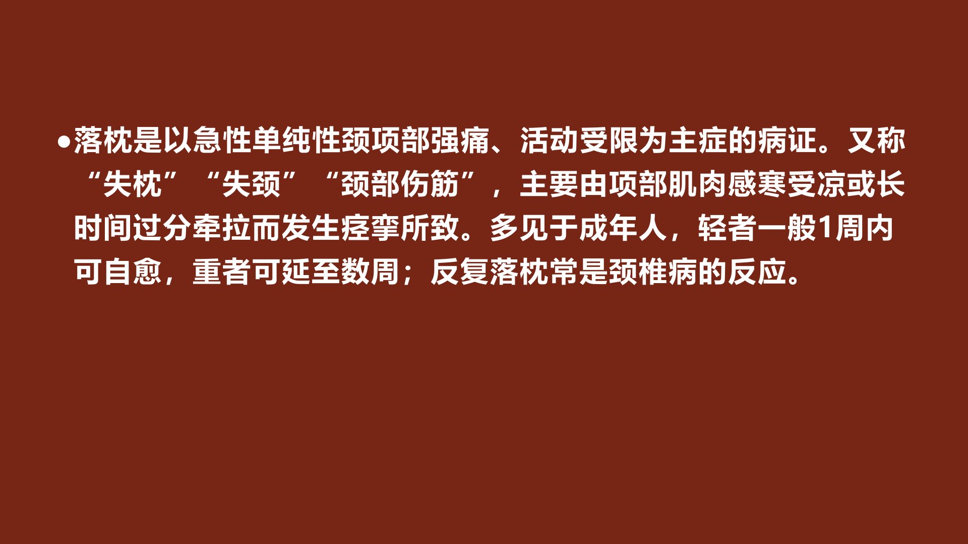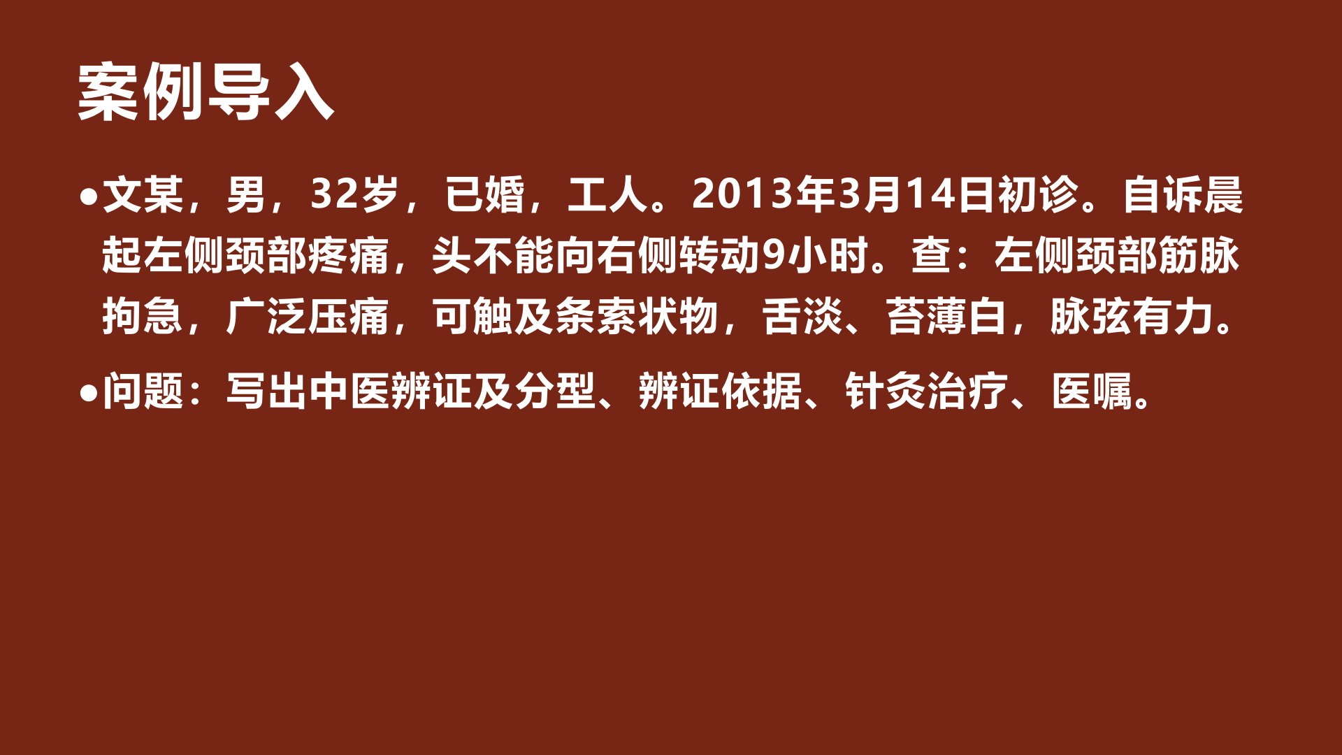 文某32岁男工人2013年3月14日初诊自诉晨起左侧颈部疼痛头不能向右侧转动9小时。查体见左侧颈部筋脉拘急广泛压痛可触及条索状物舌淡、苔薄白脉弦有力。落枕以急性单纯性颈项部强痛、活动受限为主症主要由项部肌肉感寒受凉或长时间过分牵拉而发生痉挛所致。多由睡眠姿势不良、感受风寒等因素所致病位在颈部病机为经络瘀滞气血不畅。中医辨证分为瘀滞型和风寒型本例属风寒型。治疗以疏通经络、活血止痛为原则取手太阳、足少阳经穴及督脉穴为主主穴包括大椎、后溪、悬钟、阿是穴、外劳宫。操作可用毫针泻法或平补平泻法行针时嘱患者活动颈部感受风寒者可用温针灸。其他治疗包括拔罐法、指针法、耳针法。针灸治疗落枕疗效显著一般12次即可痊愈。同时患者需注意调整枕头高度注意颈部保暖预防感寒着凉劳逸适度。