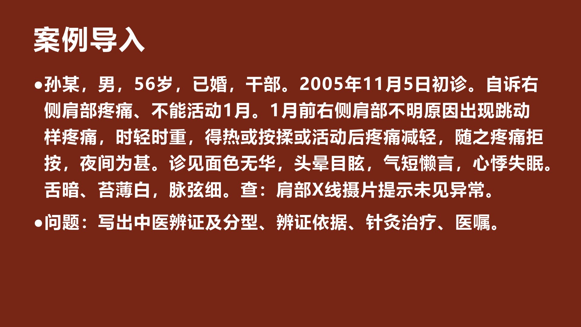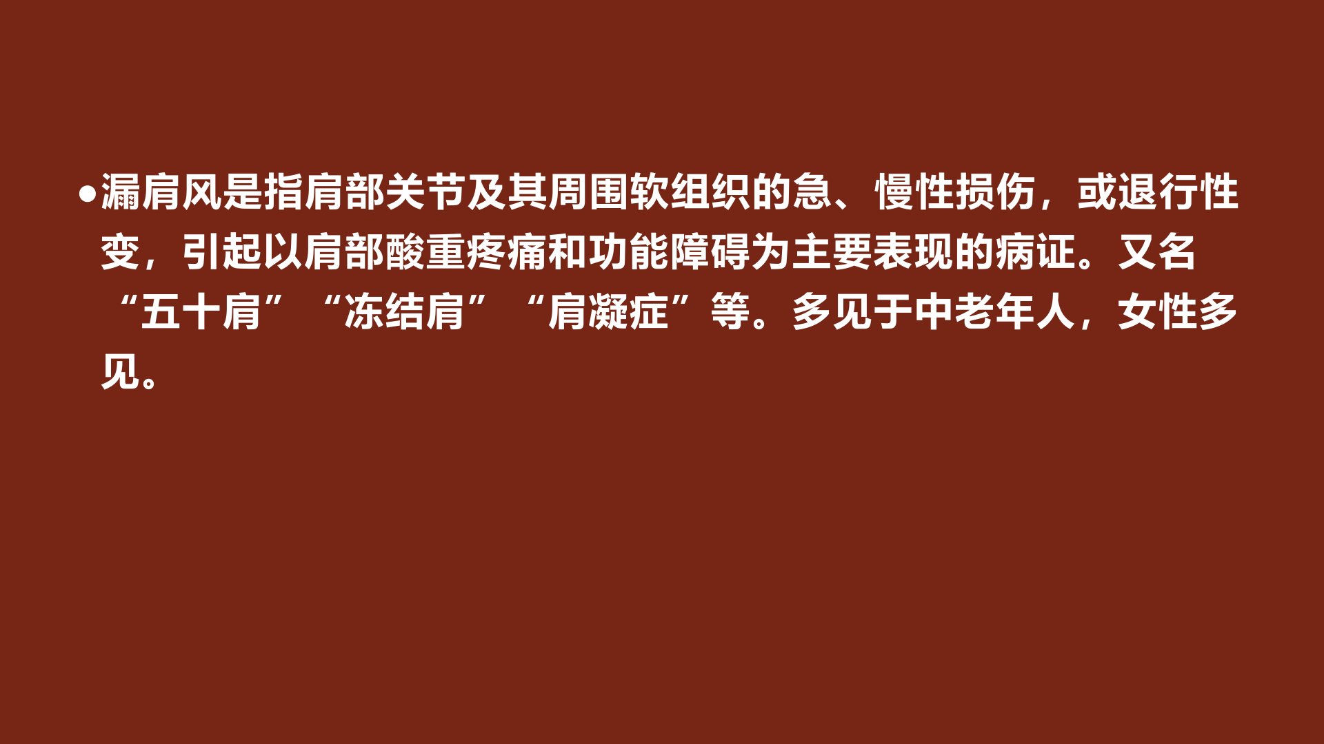 孙某男56岁干部2005年11月5日初诊自诉右侧肩部疼痛、活动受限1月得热或按揉或活动后疼痛减轻夜间加重伴有面色无华、头晕目眩等症状。查体:舌暗、苔薄白脉弦细肩部X线摄片未见异常。漏肩风多见于中老年人由外伤、劳损、肝肾亏虚、气血不足、感受风寒湿邪等导致病位在肩部与肝肾脾有关病机为经脉受损、气血不畅。西医学的肩关节周围炎可参考本病辨治。中医辨证为虚证气血虚型依据为肩部隐隐作痛喜温按伴气血虚症状。针灸治疗以舒筋通络、行气活血为法取手三阳经穴为主主穴为肩髃、肩髎、肩贞、肩前、阿是穴配穴根据经脉辨证加减。其他治疗包括耳针、刺络拔罐、穴位注射、芒针、电针等。医嘱坚持肩部功能练习注意肩部保暖。