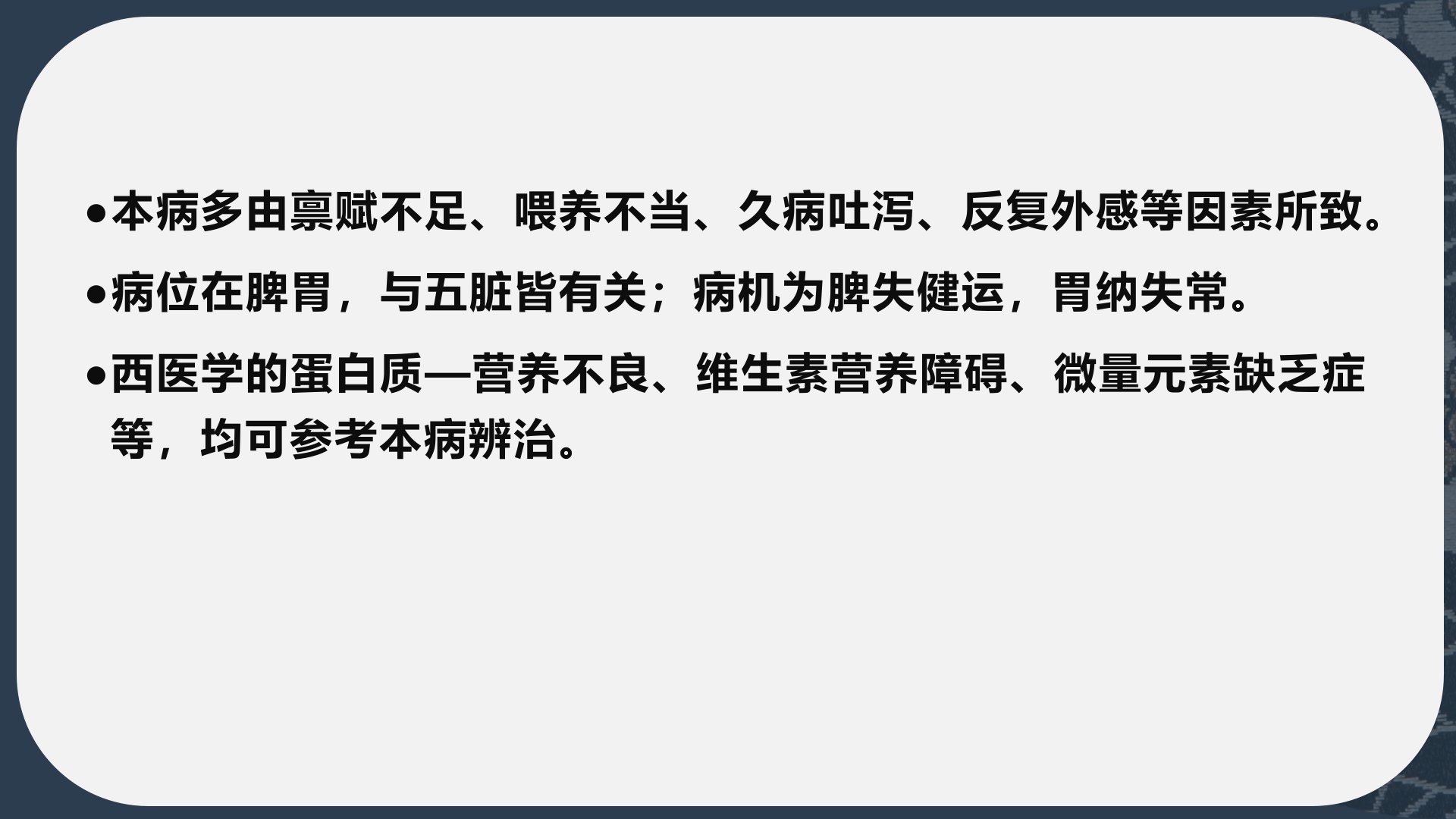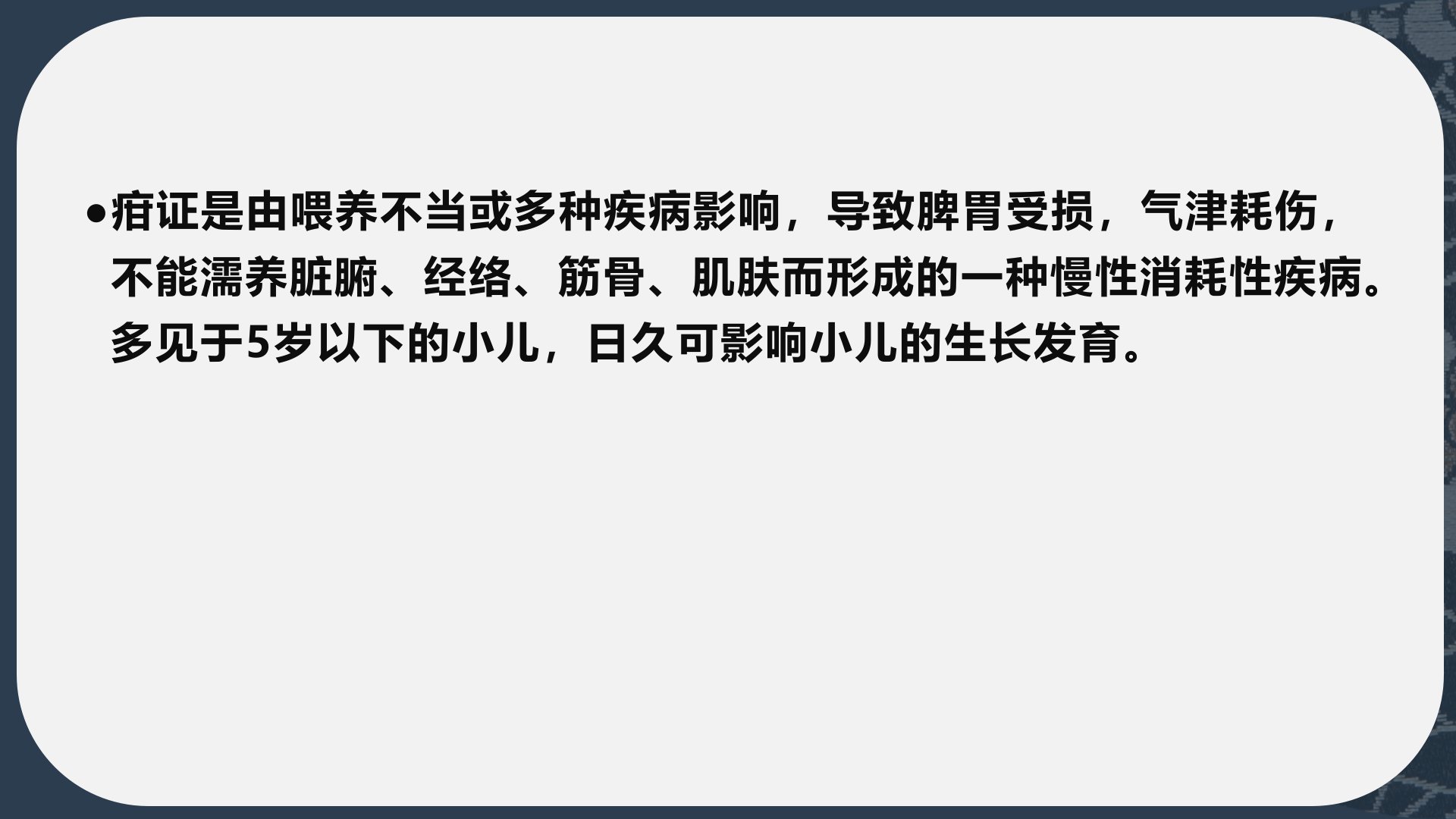 疳证是因喂养不当或疾病影响致脾胃受损、气津耗伤的慢性消耗病多见于5岁以下小儿可影响生长发育。其病因包括禀赋不足、喂养不当、久病吐泻、反复外感等病位在脾胃与五脏相关病机为脾失健运、胃纳失常西医学的蛋白质—营养不良、维生素营养障碍、微量元素缺乏症等可参考辨治。辨证主症包括形体消瘦、面色无华等分疳气、疳积、干疳三型。需与厌食、积滞鉴别血、尿、便常规及血生化检查有助于诊断。治疗以健运脾胃、益中化滞为主取足阳明胃经和经验穴如中脘、足三里等配穴依证型加减。其他治疗包括皮肤针法叩刺相关穴位以及穴位贴敷法。日常需注意婴幼儿母乳喂养避免过饥过饱多户外活动以增强体质。