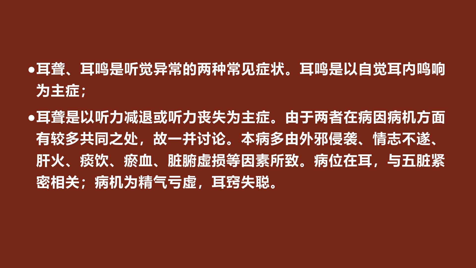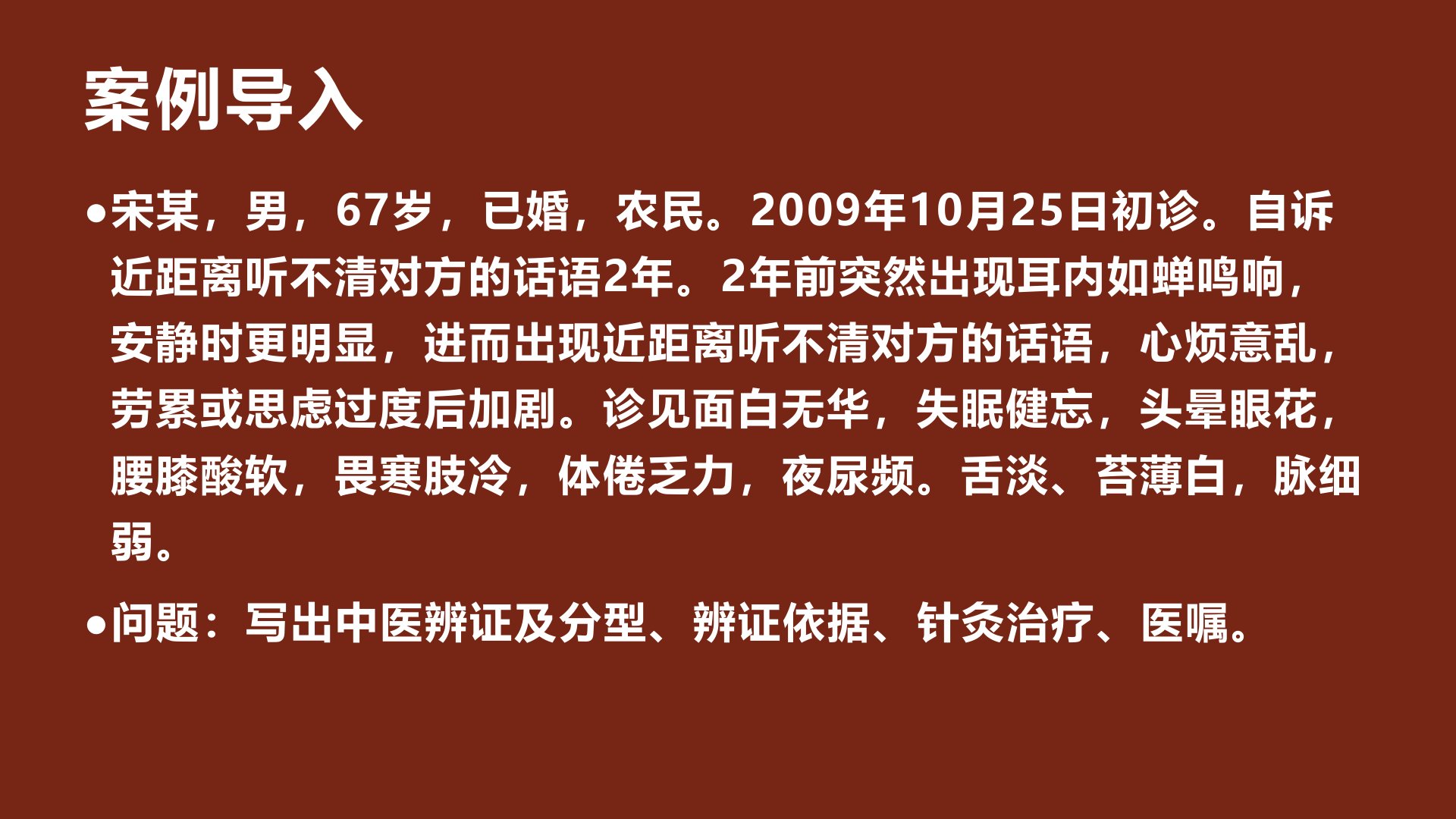 宋某67岁男性农民2年前突发耳鸣安静时更明显后出现近距离听力下降劳累或思虑过度后加剧伴心烦、失眠、健忘、头晕、腰膝酸软等症状。中医认为耳鸣、耳聋多由外邪、情志、肝火、痰饮、瘀血、脏腑虚损等所致病位在耳与五脏相关病机为精气亏虚、耳窍失聪。本案属虚证由气血亏虚所致兼见面色无华、食欲不振、舌淡苔薄白、脉细弱。治疗方面实证需清肝泻火、疏通耳窍取足少阳、手少阳经穴为主;虚证则益肾养窍取足少阴、手太阳经穴为主。本案虚证主穴为太溪、照海、听宫配穴加脾俞、足三里用毫针补法。其他治疗包括耳针法、穴位注射法、头针法等。按语指出针灸对神经性耳鸣、耳聋效果好同时患者应远离噪声、保证充足睡眠、饮食有节、起居有常、保持心情舒畅。