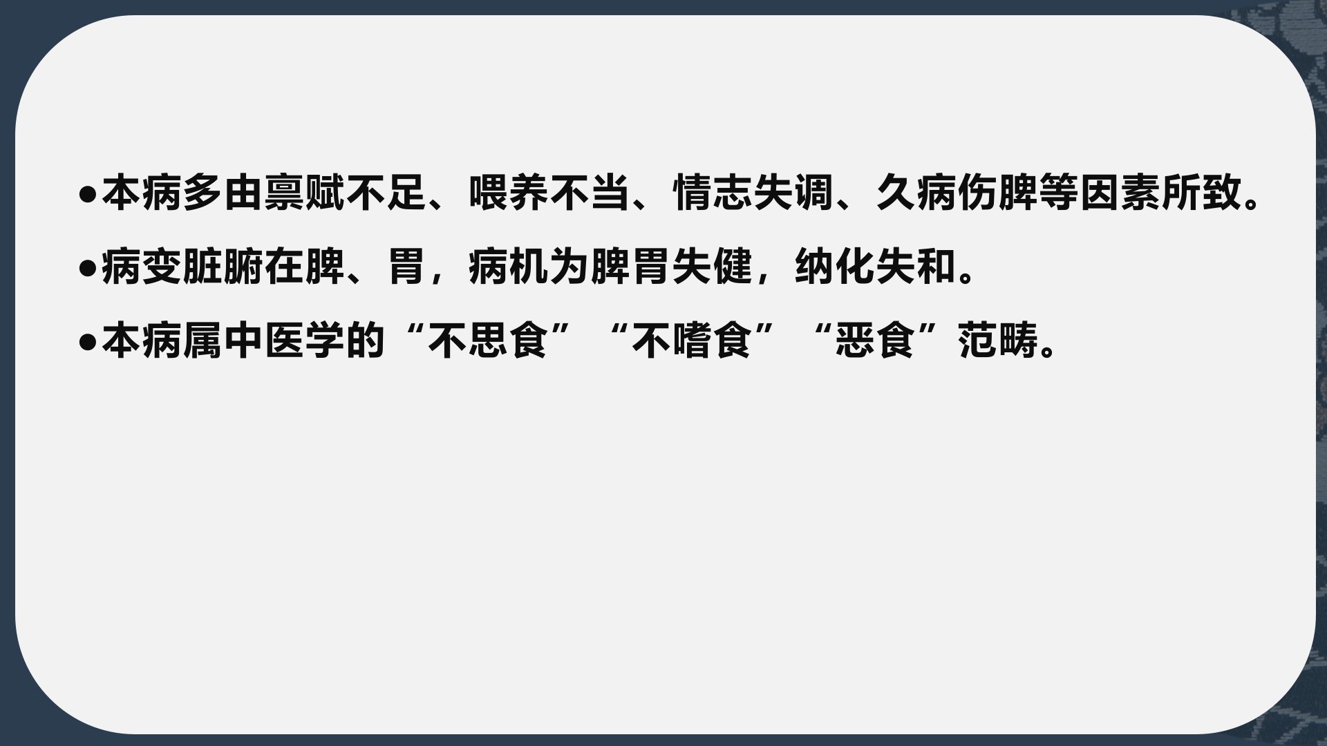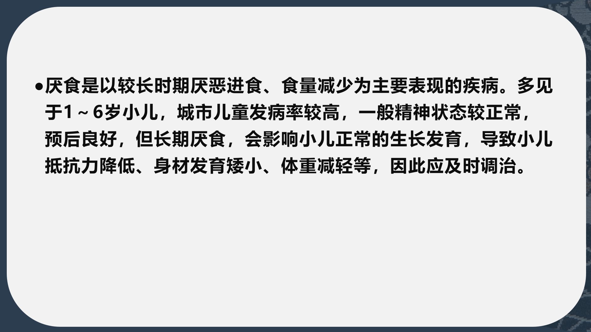 厌食以长期厌恶进食、食量减少为主要表现多见于16岁以下小儿城市儿童发病率较高一般精神状态正常预后良好但长期厌食会影响小儿生长发育导致抵抗力降低、身材矮小、体重减轻等需及时调治。该病多由禀赋不足、喂养不当、情志失调、久病伤脾等因素所致病变脏腑在脾胃病机为脾胃失健。本病属中医“不思食”等范畴辨证主症为厌恶进食、食而无味、食量减少有脾失健运、脾胃气虚、脾胃阴虚、肝脾不和等证型。鉴别诊断需与疳证、夏季热区分辅助检查包括血尿便常规、血生化检查。治疗以健脾和胃、理气化湿为主取任脉、足太阴经穴及经验穴主穴为四缝、太白、中脘配穴依证型添加。其他治疗包括穴位注射、穴位贴敷。按语强调注意饮食规律、结构不可过分娇惯小儿。