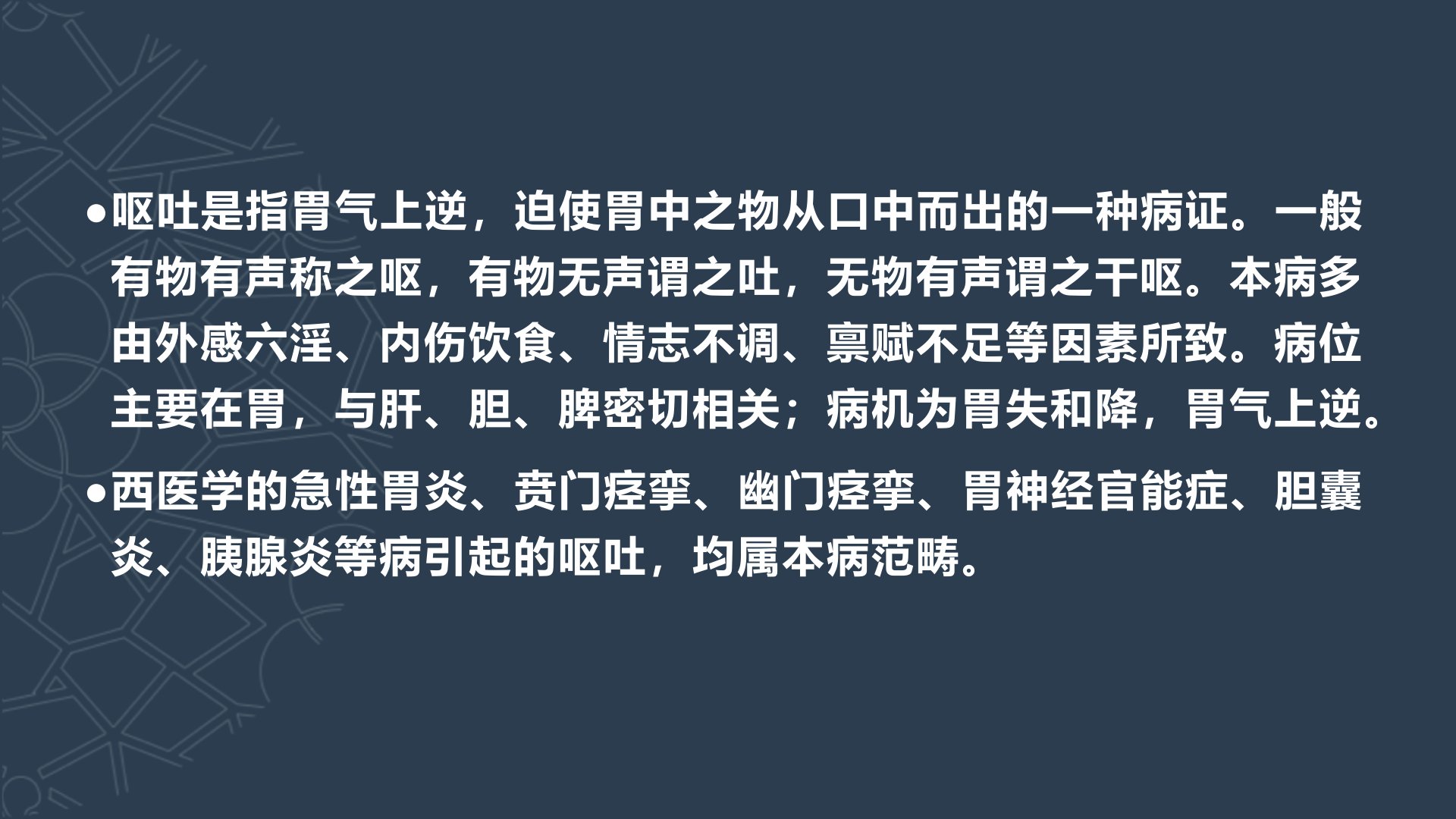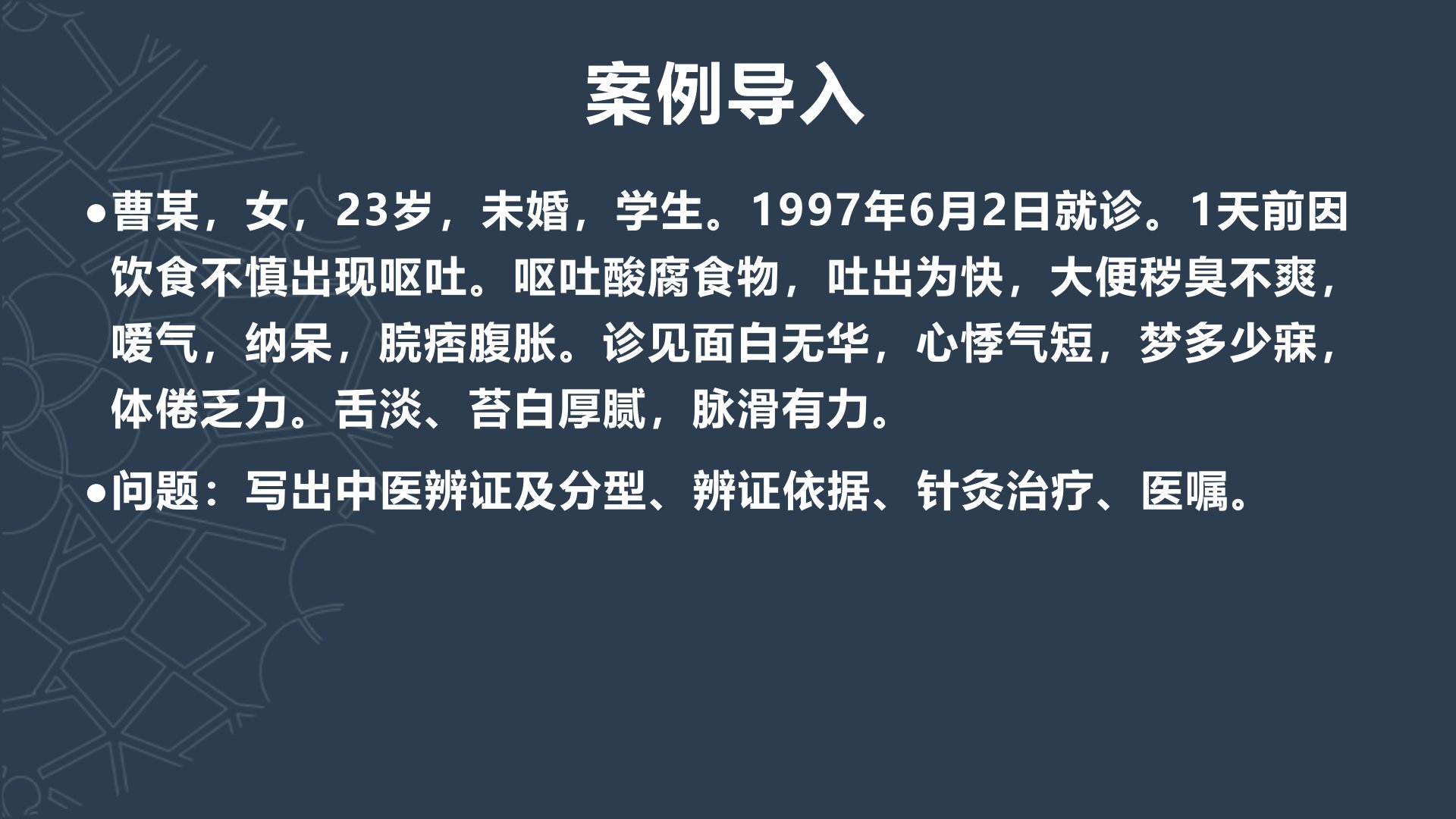 曹某23岁女性学生因饮食不慎引发呕吐就诊。症见呕吐酸腐食物、大便秽臭不爽、嗳气纳呆、脘痞腹胀兼见面白无华、心悸气短、体倦乏力舌淡苔白厚腻、脉滑有力。中医辨为食滞胃肠型实证呕吐依据为呕吐物酸腐、大便不爽、脘腹胀满、苔厚腻脉滑。病机属胃失和降、胃气上逆与西医学急性胃炎等范畴相符。治疗以和胃降逆、行气止呕为法取足阳明经穴为主主穴选中脘、内关、足三里配穴加梁门、天枢;毫针刺内关、中脘用泻法足三里平补平泻实者用泻法;中脘疏调胃腑气机内关宽胸理气、和胃止呕足三里调理胃肠气机。其他治疗可用耳针法、穴位注射法。医嘱注意保暖调节饮食情绪少食生冷辛热之品。针灸治疗呕吐效果显著但严重上消化道梗阻、癌肿及脑源性呕吐需积极治疗原发病。