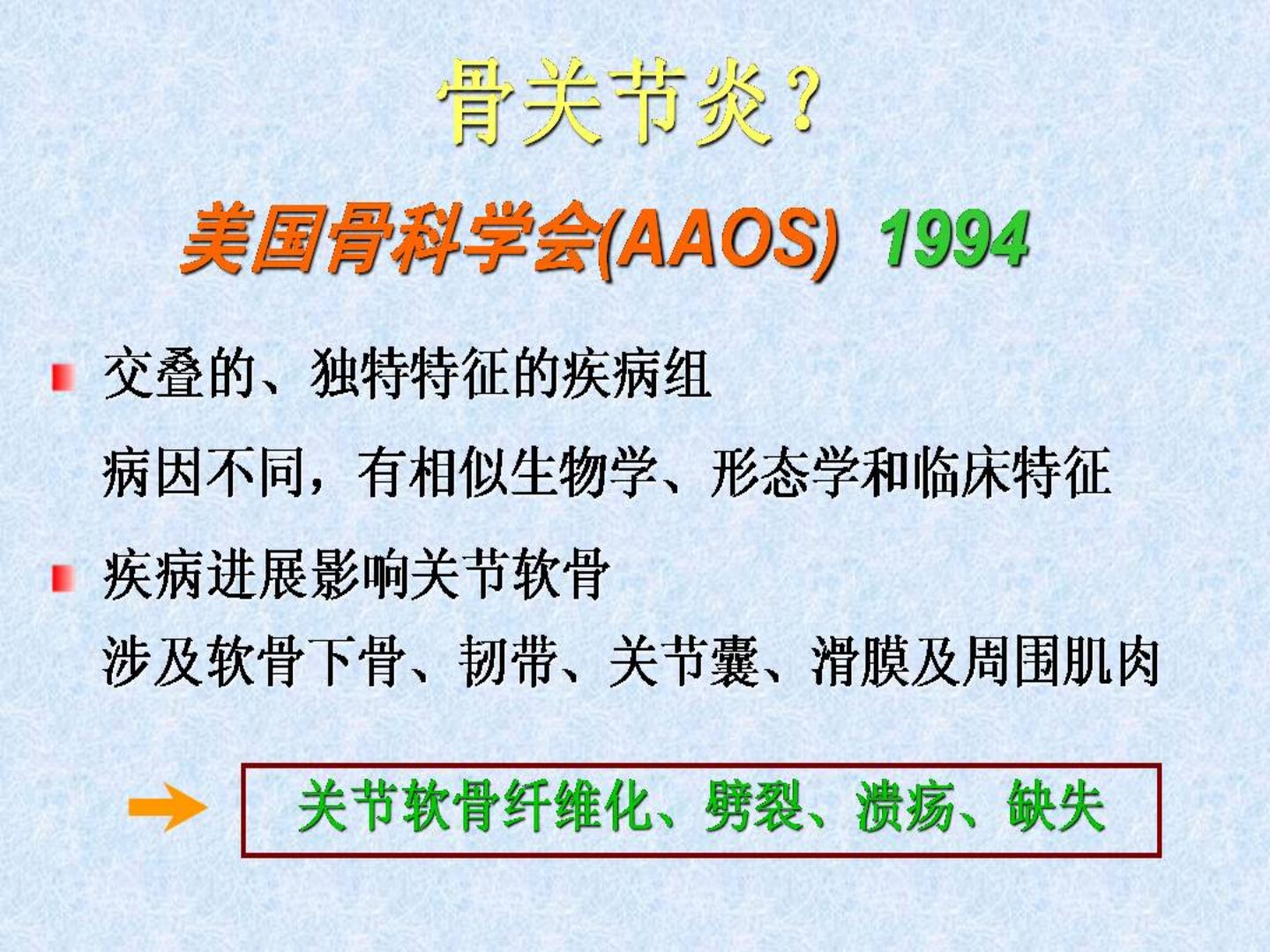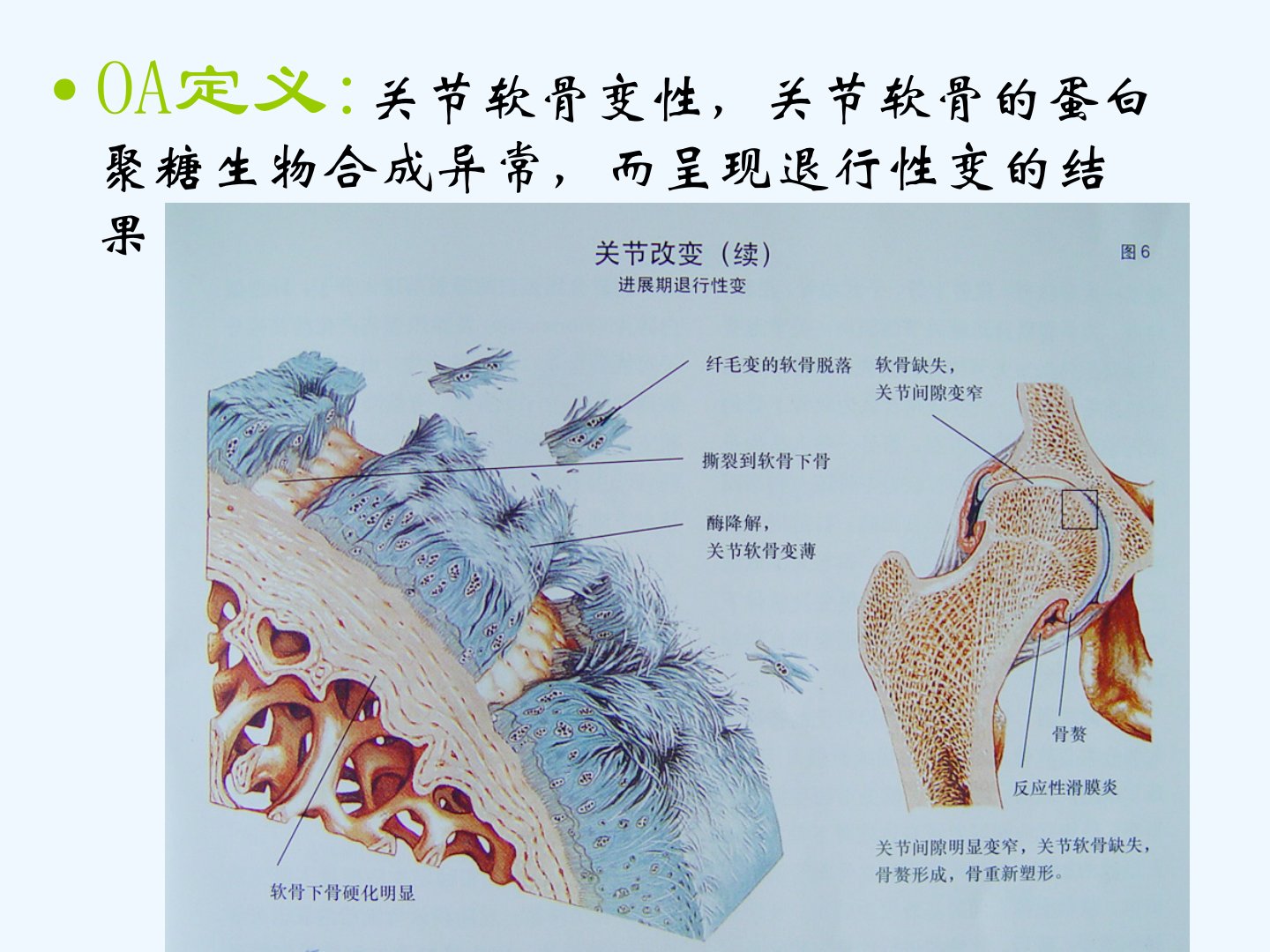 骨关节炎(OA)被WHO列为人类健康三大杀手之一其定义为关节软骨退行性变和周围骨质增生。随着老龄化OA成为常见疾病但其病因和发病机制尚不明确临床缺乏有效治疗手段。研究提示关节软骨细胞外成分合成减少与降解增加是造成软骨变形的重要因素之一。OA的发病机理包括:1骨内压增高由于骨血液动力学改变引起导致软骨下骨硬化增加软骨承受压力加重软骨损害。2细胞因子学说分解性和合成性细胞因子间的平衡维持软骨基质代谢平衡其失衡会导致软骨基质的降解和破坏。3基质金属蛋白酶降解学说MMPs降解细胞外基质中的各种基质蛋白激活的MMPs可产生瀑布式放大效应。4自由基学说自由基对软骨细胞胶原合成等多环节造成损伤促进软骨降解。5免疫因素部分学者推测OA的发生可能与免疫因素有关。中药作用机理主要是补肾壮骨和养血柔肝改善微循环、调节内分泌状态。非手术疗法包括健康教育、物理疗法、药物治疗、针灸疗法、小针刀剥离术、中医手法等。运动和康复方面运动锻炼可预防关节僵直增强关节稳定性。此外还可使用手杖、肢具与护膝以及基因疗法。手术疗法包括关节镜下关节清扫术、软骨下钻孔术、截骨术、膝关节融合术、人工关节置换术、软骨移植术等。