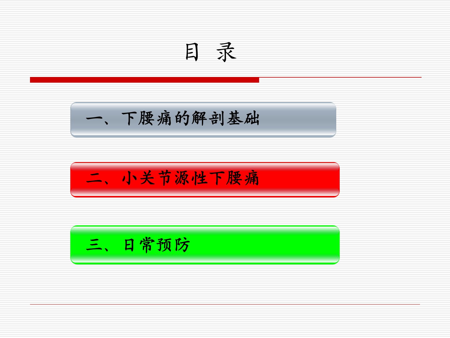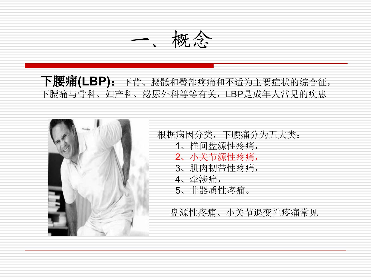 小关节源性下腰痛(facetjointsyndromelowbackpain)是下腰痛的一种下腰痛是以下背、腰骶和臀部疼痛和不适为主要症状的综合征与骨科、妇产科、泌尿外科等相关是成年人常见疾患。根据病因下腰痛可分为五大类其中盘源性疼痛和小关节退变性疼痛较为常见。小关节源性下腰痛概念于1911年由Goldwaith首次提出其发病机制与椎间小关节退行性变有关包括骨性关节炎和退变增生后压迫硬膜囊或神经根。临床表现上患者常感慢性、无明显诱因的腰痛疼痛位于椎旁一侧或双侧可向臀部、大腿后方放射但一般不超过膝关节。体检时椎旁有局限性深压痛疼痛在腰椎后伸、侧屈及扭转负荷时加重。通过C臂机定位及脊神经背内侧支消融术等治疗方法可有效缓解患者症状。预防方面需重视锻炼。