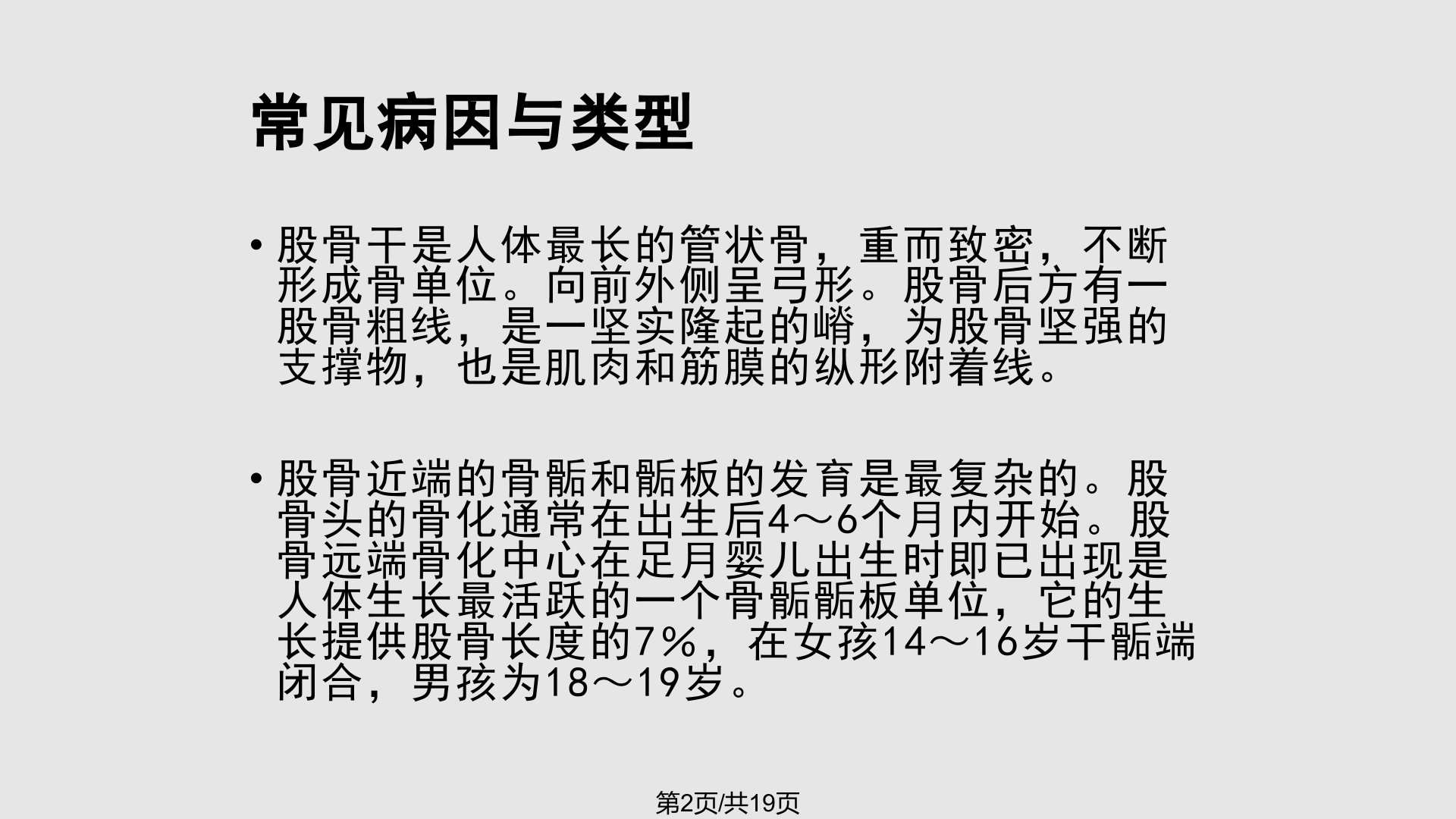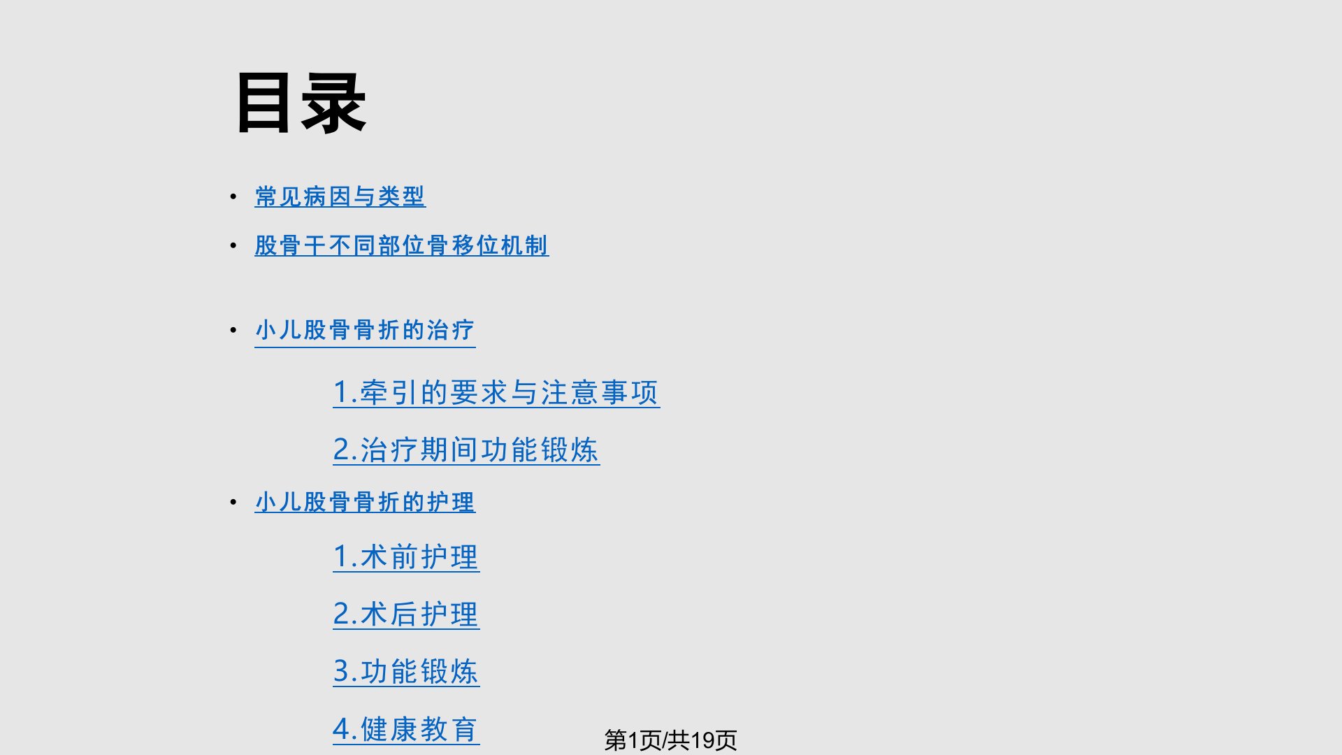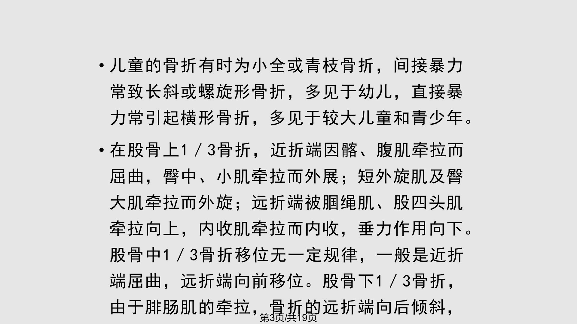 摘要本文详细介绍了小儿股骨骨折的病因、治疗及护理。儿童股骨解剖结构特殊骨折类型因暴力方式而异间接暴力常致长斜或螺旋形骨折直接暴力常致横形骨折且不同部位骨折移位机制不同。治疗方面因儿童股骨干骨折成长期可自行矫正多采用非手术治疗如小夹板固定法、悬吊皮牵引法、水平皮牵引法、骨牵引法等同时牵引时要注意患肢放置、下肢长度及骨折轴线测量等治疗期间需进行功能锻炼。护理包括术前心理、胃肠道、手术区皮肤准备;术后饮食、体位、病情观察;功能锻炼分阶段进行从术后第二天到骨痂成熟期逐渐增加负重;健康教育则涵盖疾病知识、牵引重要性、床铺清洁、扶拐方法及出院指导等内容。