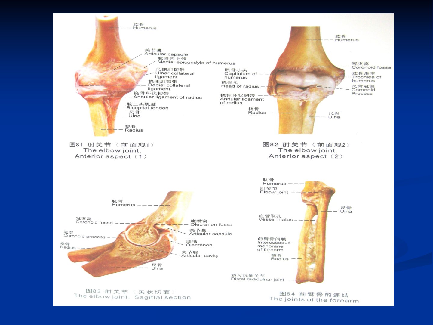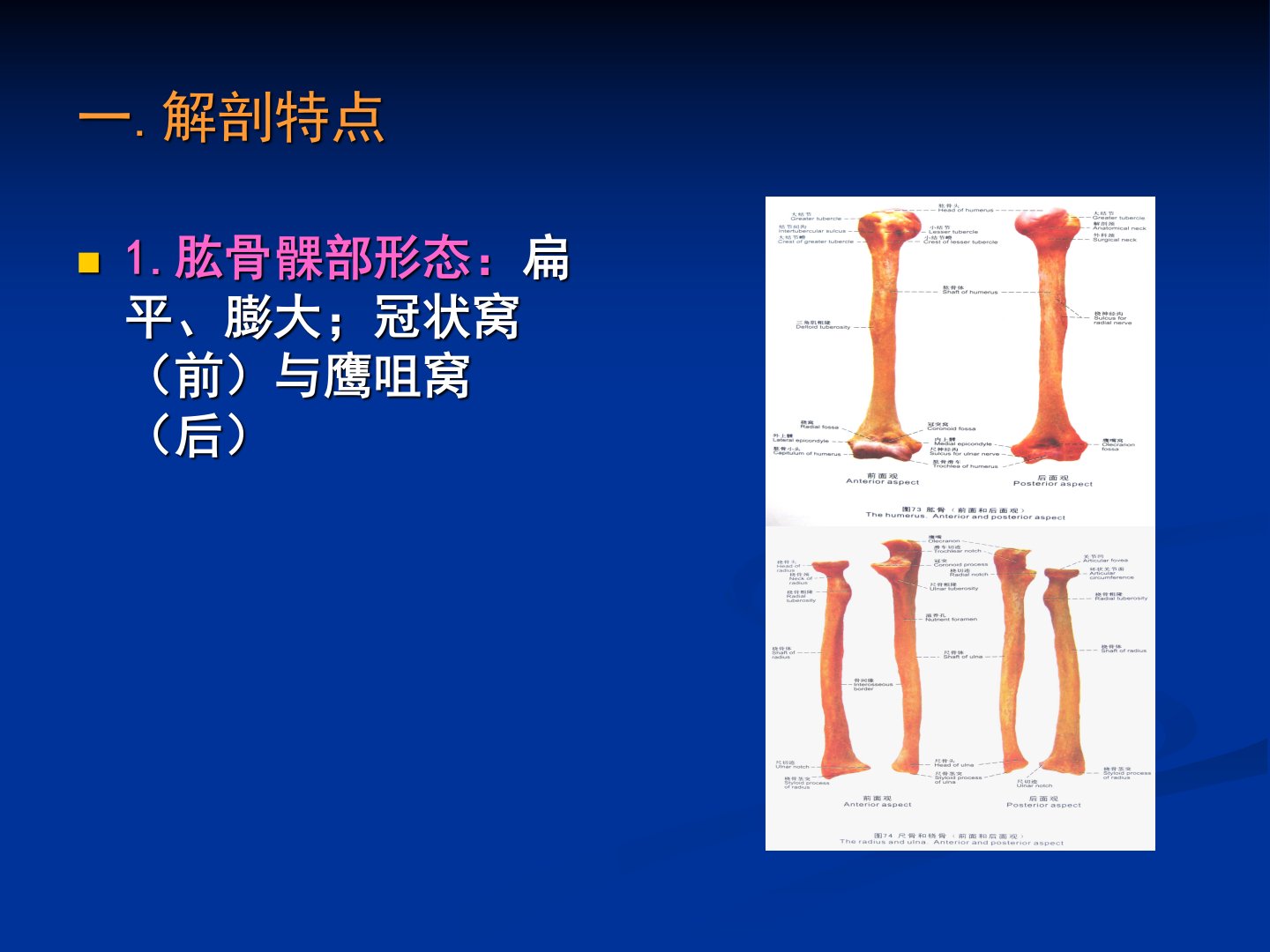 肱骨髁上骨折解剖特点为肱骨髁部扁平膨大有前倾角肘前方有肱动、静脉和正中神经肱骨内上髁后方有尺神经肱骨外侧有桡神经。分型包括伸直型(9095)和屈曲型(510)伸直型又根据远侧骨折块移位方向分尺偏型、桡偏型和单纯伸直型。伸直型由间接暴力所致屈曲型由直接暴力所致。临床表现上早期骨折移位轻时肘部无明显肿胀晚期或严重移位者则出现肿胀、瘀斑、畸形等症状且有4P征表现。治疗时无移位骨折用长臂石膏或超关节小夹板固定移位骨折争取早复位解除对神经血管的压迫。长斜骨折不稳定骨折采用牵引治疗。并发症包括血循环障碍、缺血性挛缩、神经损伤和肘内翻其中缺血性挛缩是最严重的并发症多在伤后或复位固定后2448小时内发生需立即解除外固定应用血管扩张剂必要时切开筋膜室并探查桡动脉。