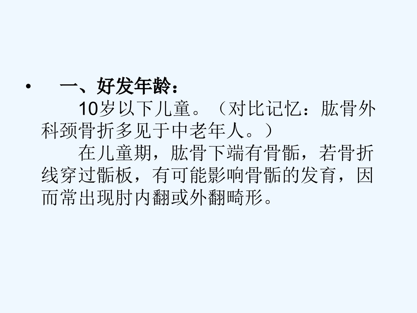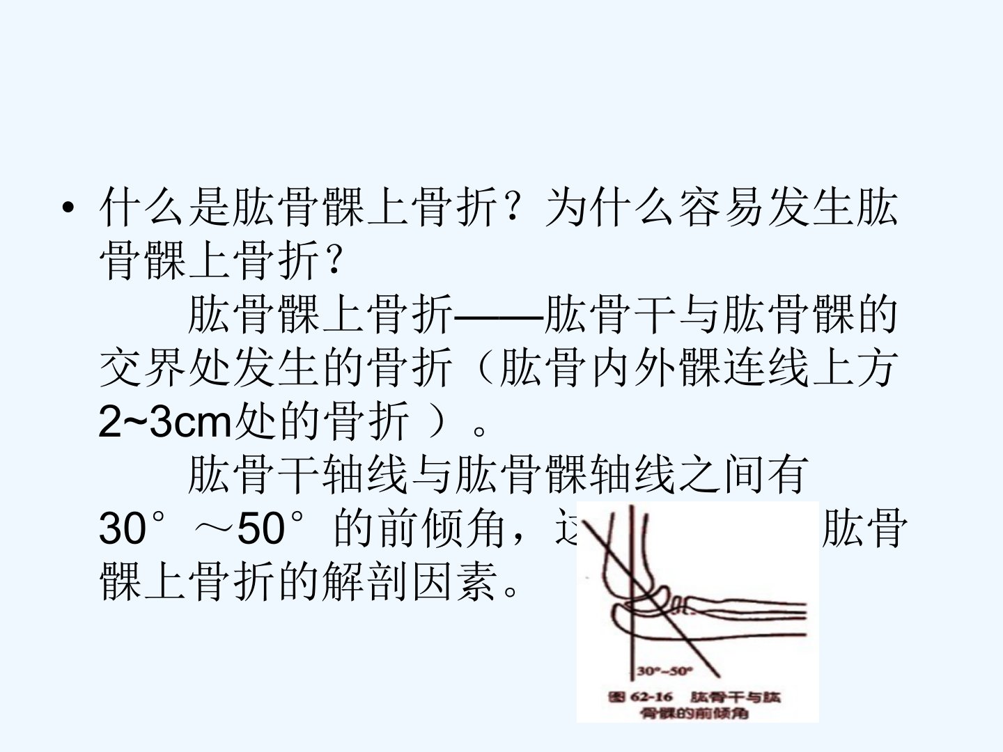 作为医生对小儿肱骨髁上骨折要点总结如下:肱骨髁上骨折指肱骨干与肱骨髁交界处发生的骨折多见于10岁以下儿童。其解剖因素在于肱骨干与肱骨髁轴线间存在3050前倾角。伸直型肱骨髁上骨折最为常见占90以上多因跌倒时肘关节半屈或伸直位手心触地暴力经前臂传达至肱骨下端所致。临床表现为肘部疼痛、肿胀、皮下瘀斑肘部向后突出并处于半屈位。诊断依据包括受伤史、肘上方压痛、X线拍片特征等。改良Gartland分型是肱骨髁上骨折最常用的分型对诊断和治疗具有重要意义。治疗包括手法复位超关节小夹板固定、牵引治疗、手术探查神经血管及整复骨折等。并发症包括前臂骨筋膜室综合征、缺血性肌挛缩、血管神经损伤、肘内翻等需严密观察并处理。