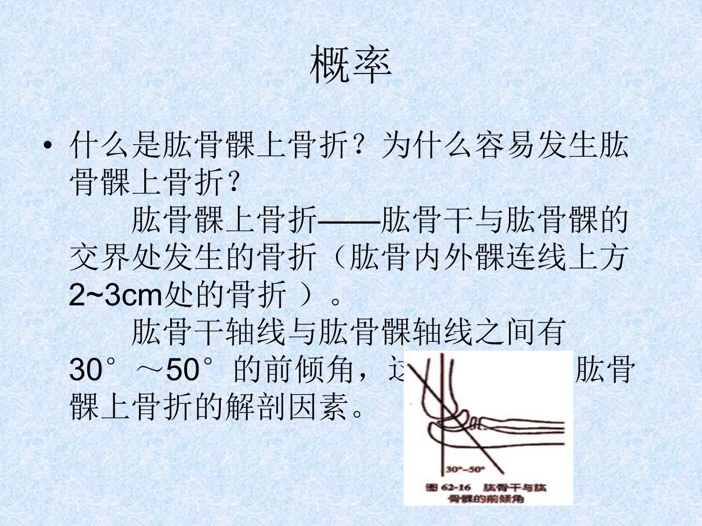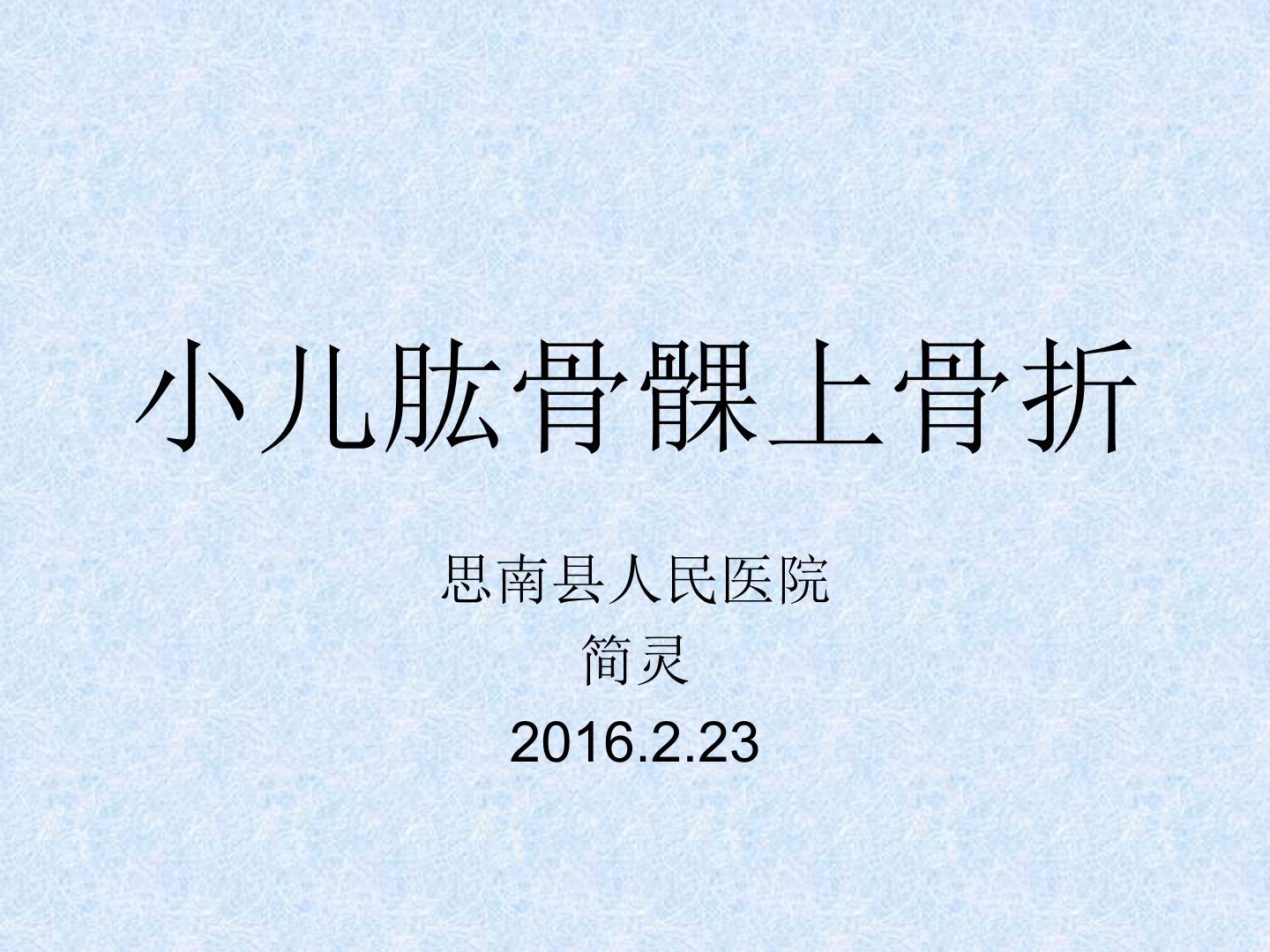 小儿肱骨髁上骨折摘要本文介绍了思南县人民医院简灵医生关于小儿肱骨髁上骨折的知识。肱骨髁上骨折发生在肱骨干与肱骨髁交界处解剖因素为肱骨干与肱骨髁轴线间存在3050度前倾角好发于10岁以下儿童。骨折分型包括伸直型和屈曲型。伸直型占90以上近折端前下移位远折端上移位;屈曲型近折端后下移位远折端前移位多形成开放骨折少有合并神经血管损伤。X线片评估指标有肱骨前皮质线、沙漏征和Baumann角。改良Gartland分型是国际通用分型。治疗上轻症可手法复位超关节小夹板固定或石膏固定;骨折超2448小时、软组织严重肿胀等采用牵引治疗;有血管、神经伤考虑手术探查。手术治疗适用于手法复位失败、开放性骨折等情况。并发症包括前臂骨筋膜室综合征、缺血性肌挛缩、血管神经损伤、肘内翻、骨化性肌炎和关节活动障碍等需及时预防和处理。
