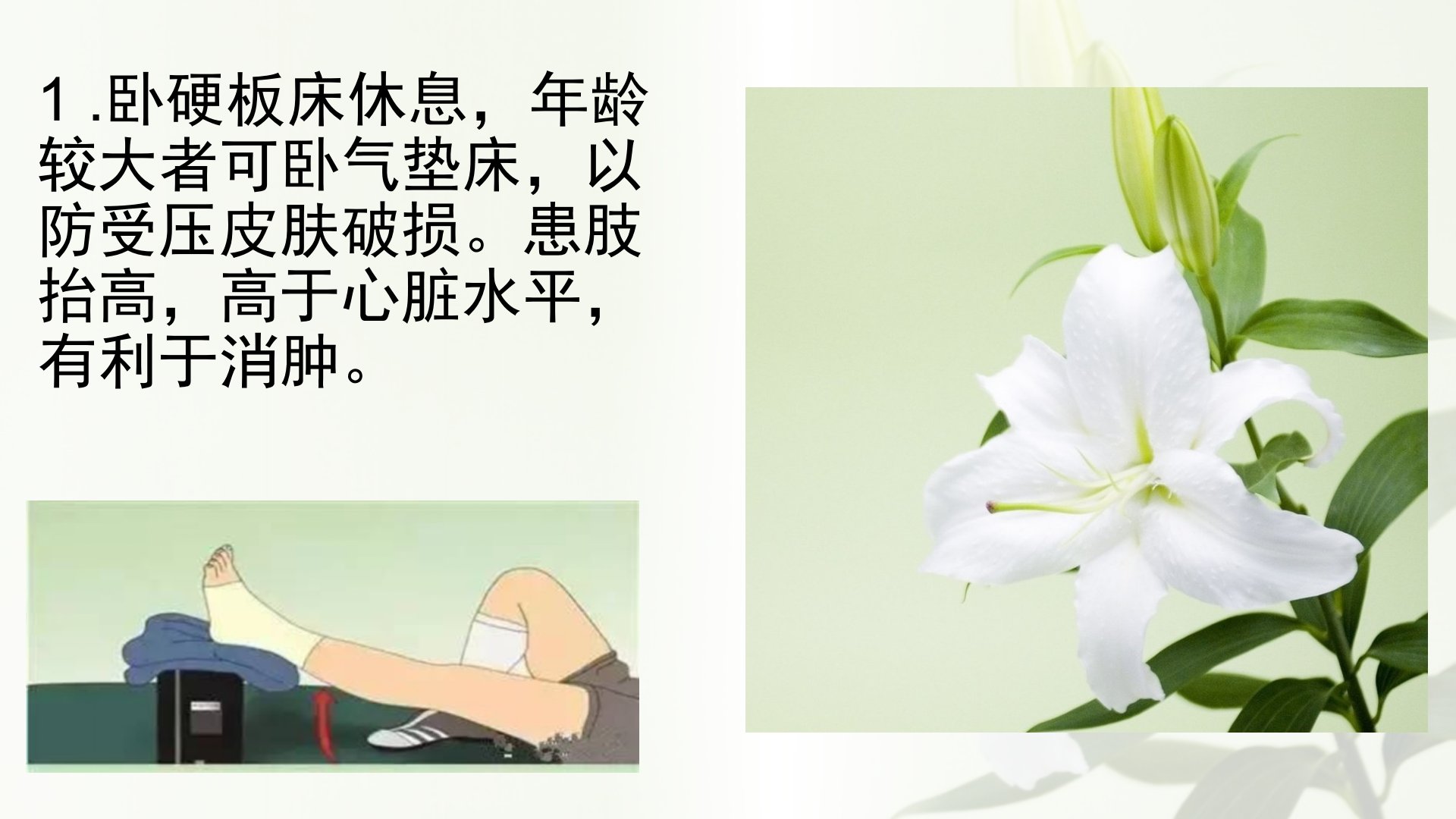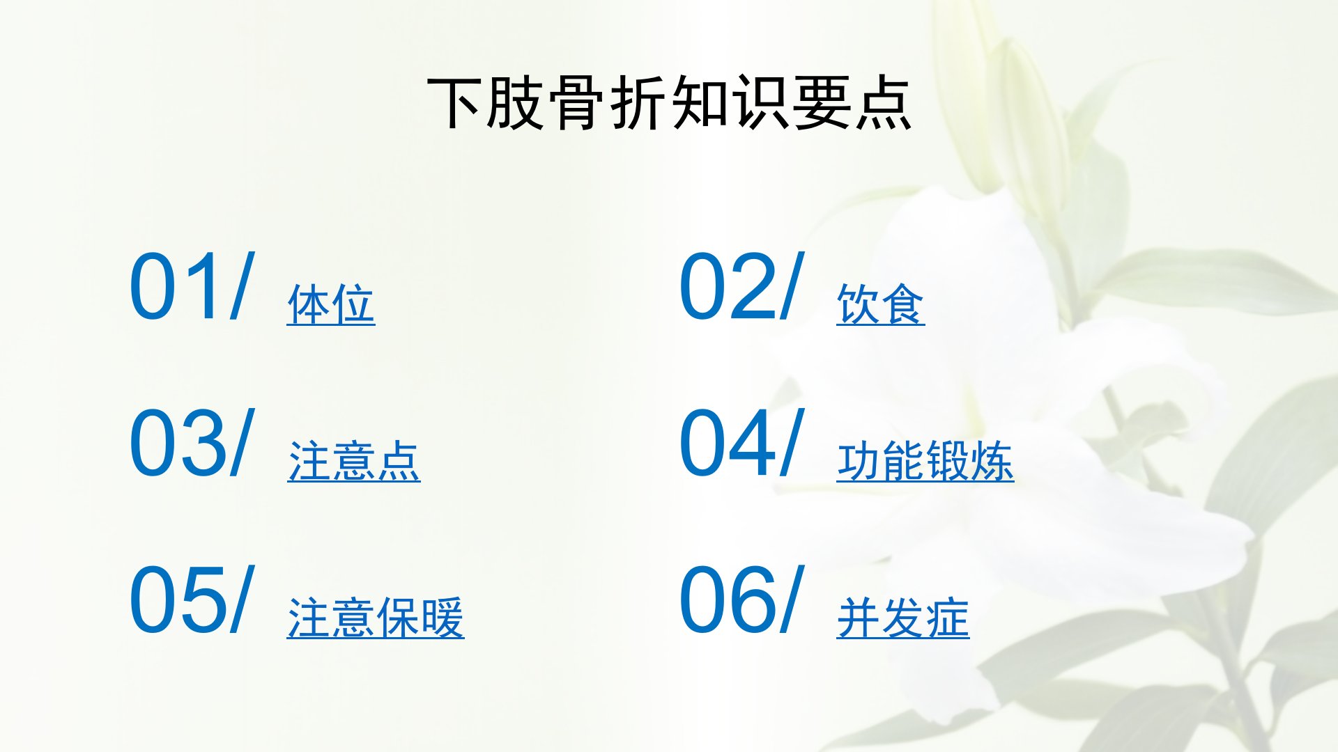 下肢骨折知识宣教摘要嘉兴市第二医院就下肢骨折给出以下建议:1饮食体位:每日饮水超2000ml进食低脂、高蛋白等饮食防DVT;卧硬板床年长者可卧气垫床患肢抬高高于心脏水平利于消肿。2功能锻炼注意点:观察患肢感觉等情况每2小时翻身或抬臀防皮肤破损注意患肢保暖;加强患肢功能锻炼如足趾、踝关节屈伸及股四头肌等长收缩训练。3并发症:骨筋膜室综合症常发生于小腿及前臂掌侧出现相关症状需立即手术;深静脉血栓(DVT)表现为患肢肿胀发硬等预防措施包括戒烟酒、适当饮水、早期活动等;脂肪栓塞常发生于长骨骨折多在48h内出现木僵或昏迷等症状。